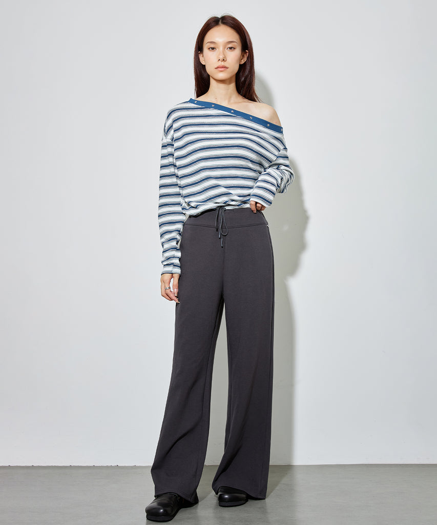 ウエストはゴム仕様のラクな穿き心地で、紐でのサイズ調整が可能。