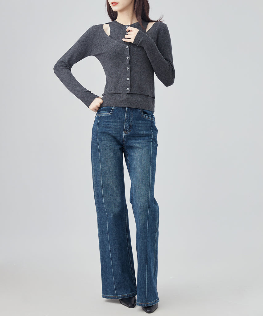 センターシームが入ったセミフレアのシルエットが、脚を長く細く見せてくれます。
