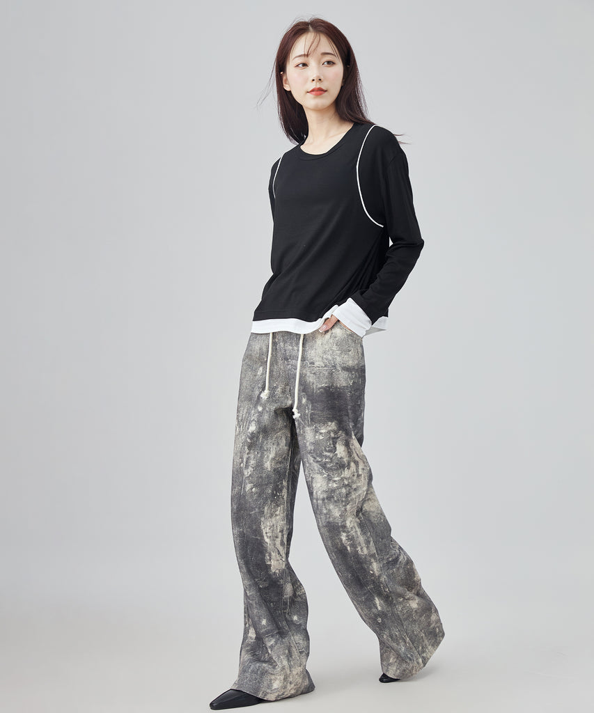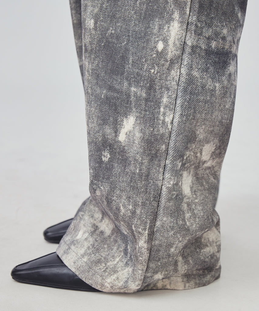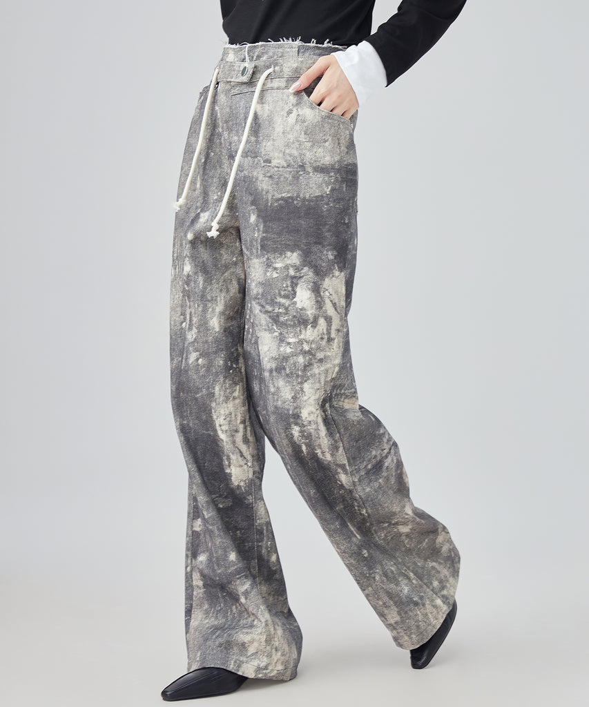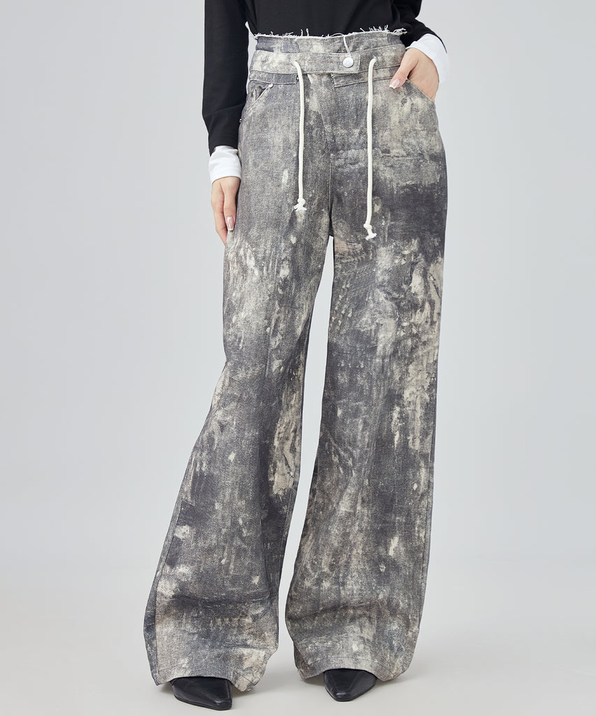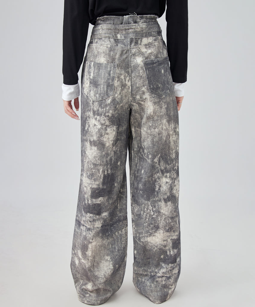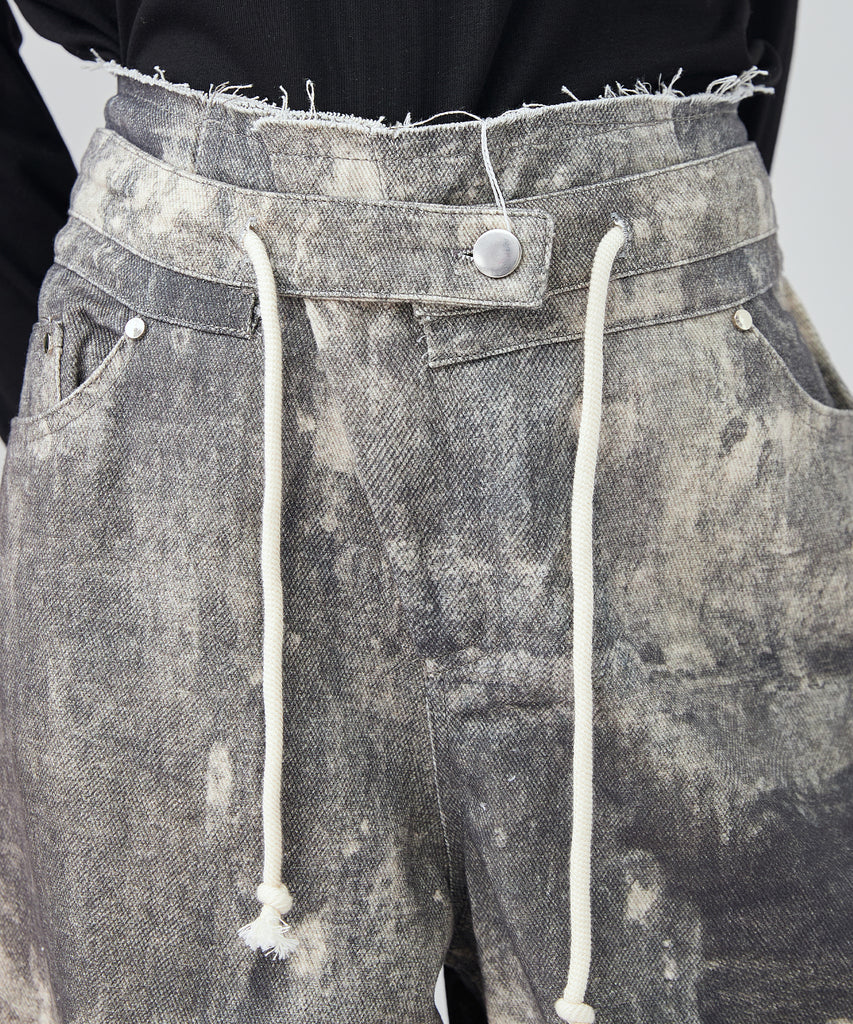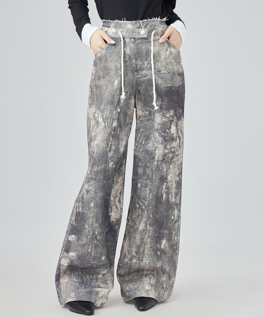 まるでペイントしたような大胆なウォッシュ加工が映えるデニムパンツ。