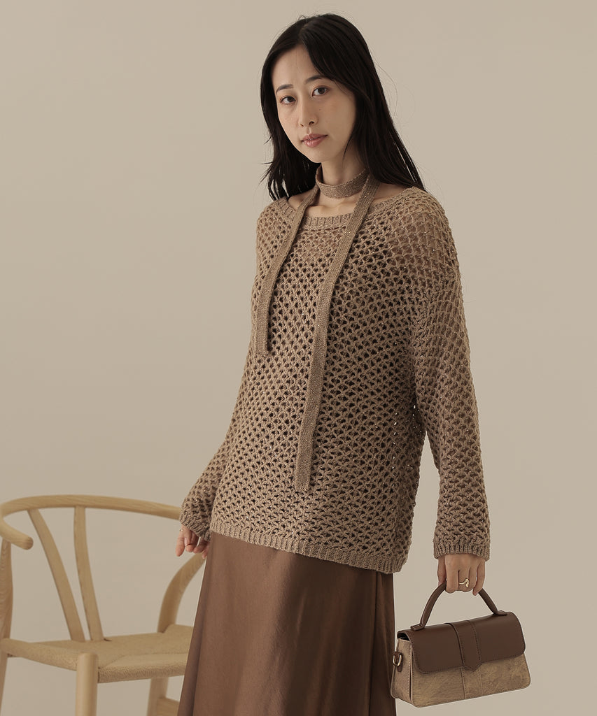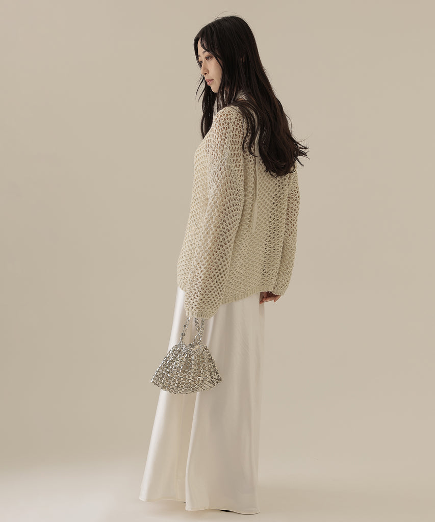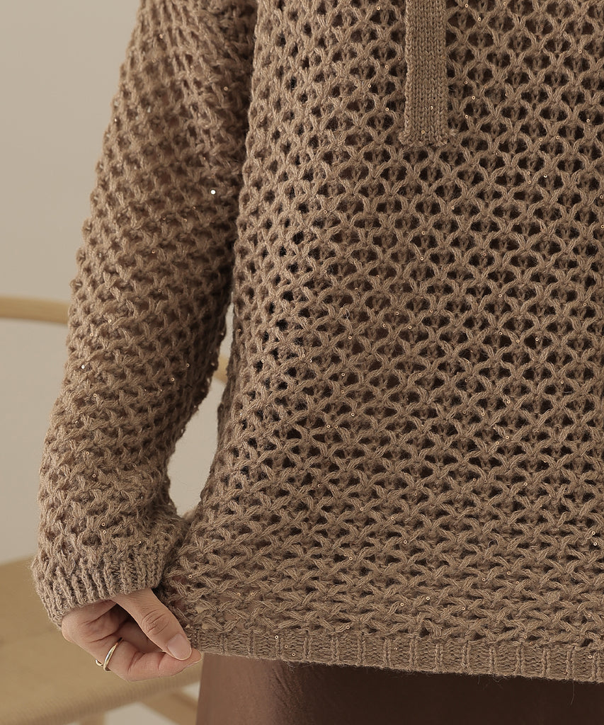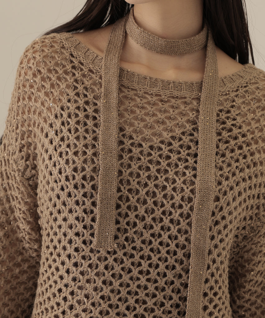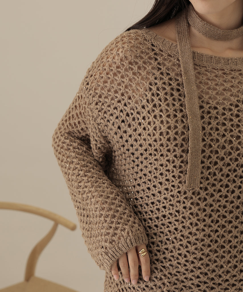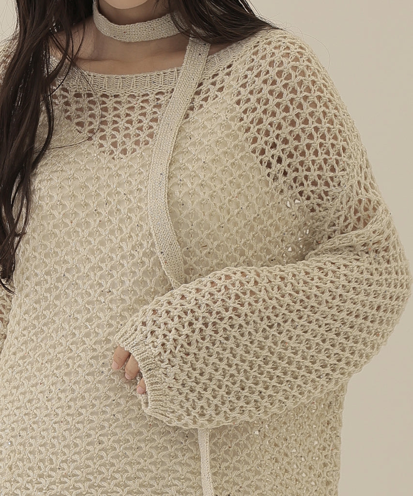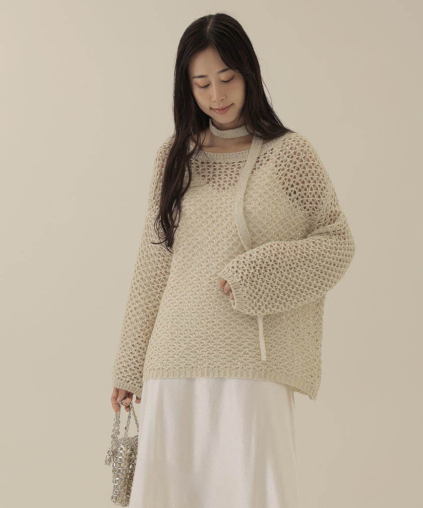 透かし編みのトップスは、ラメのように見立てたニット地に細かなスパンコールを散りばめた一着。
