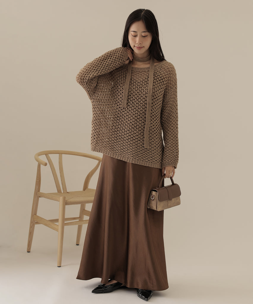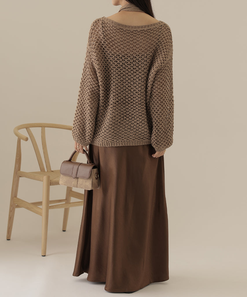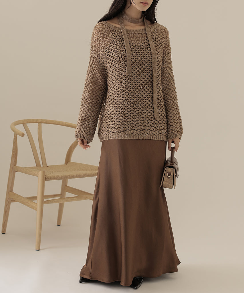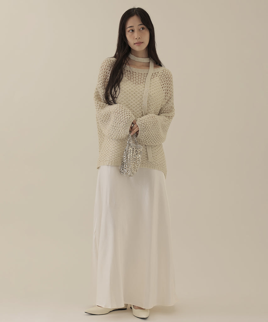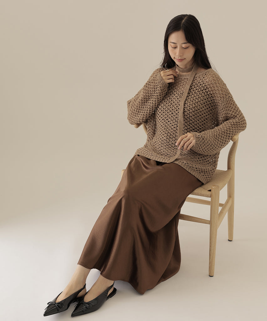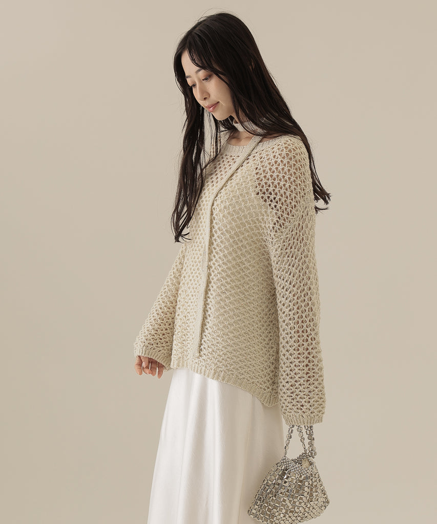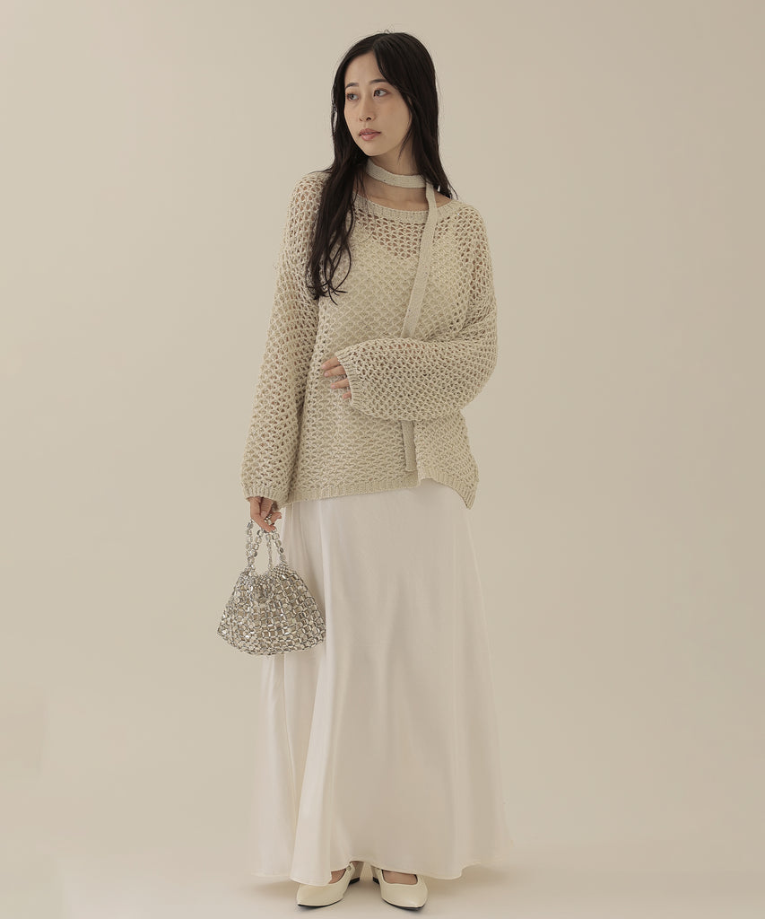 透かし編みのトップスは、ラメのように見立てたニット地に細かなスパンコールを散りばめた一着。