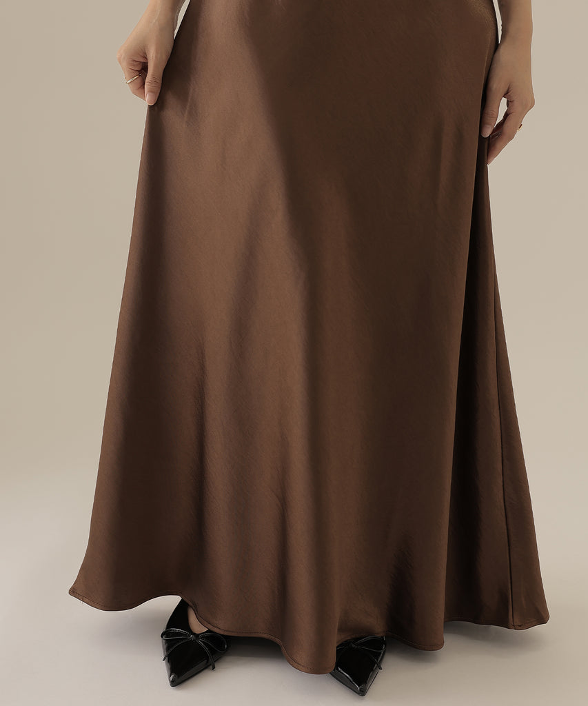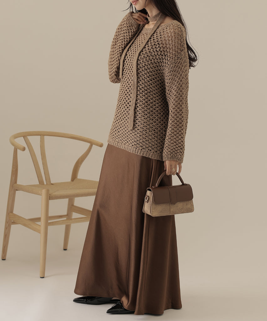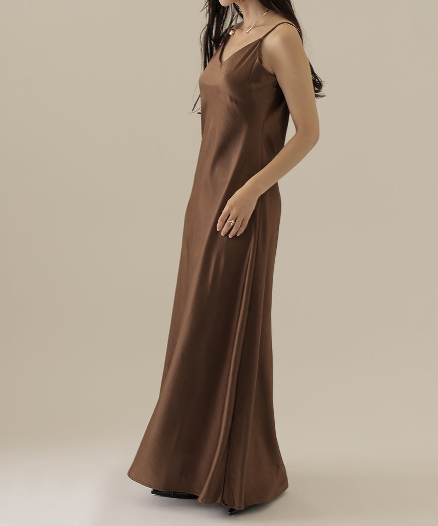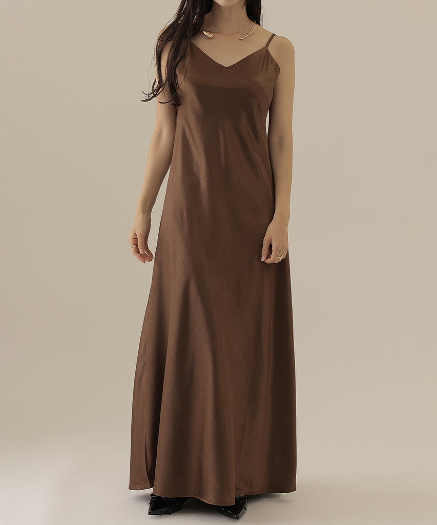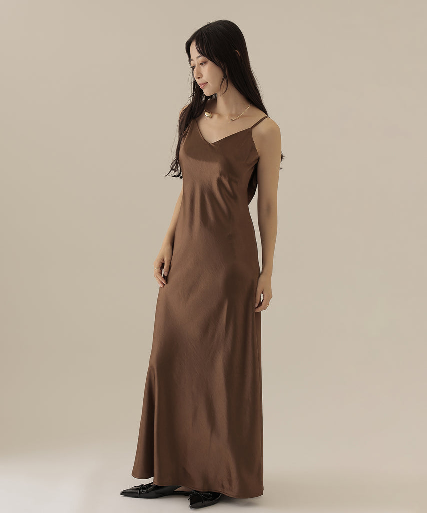 キャミソールワンピースはサテン素材を使用し、シンプルながらも存在感抜群。