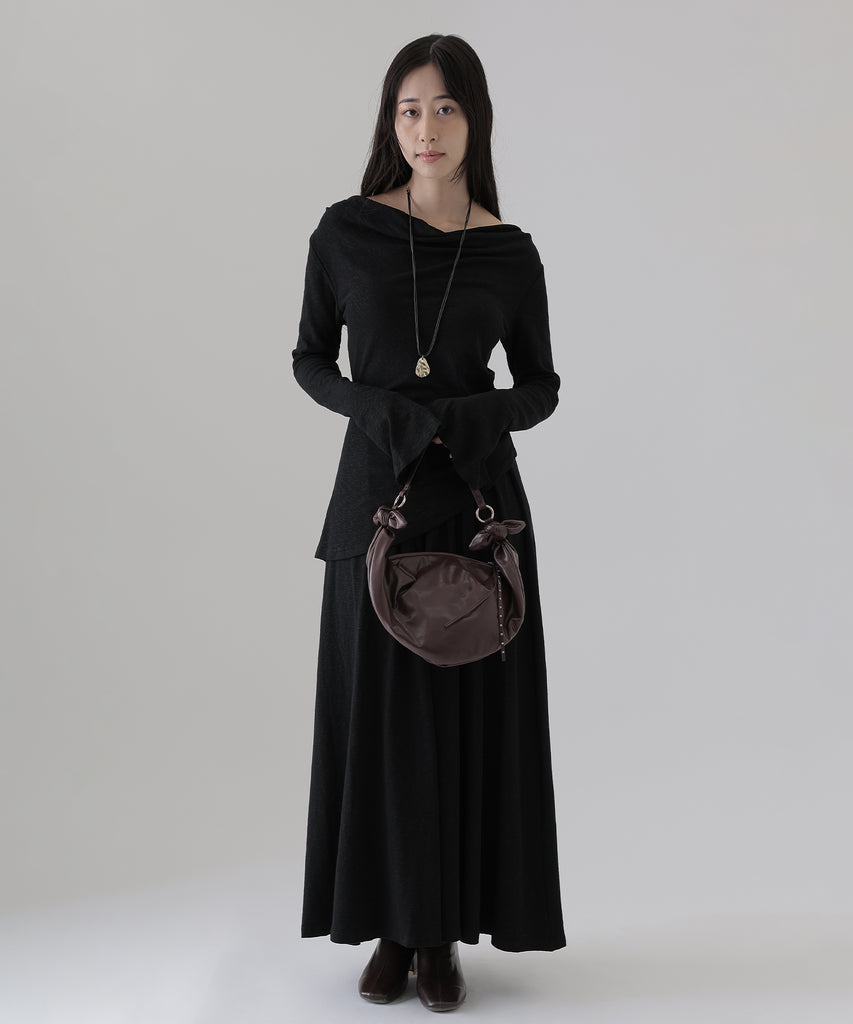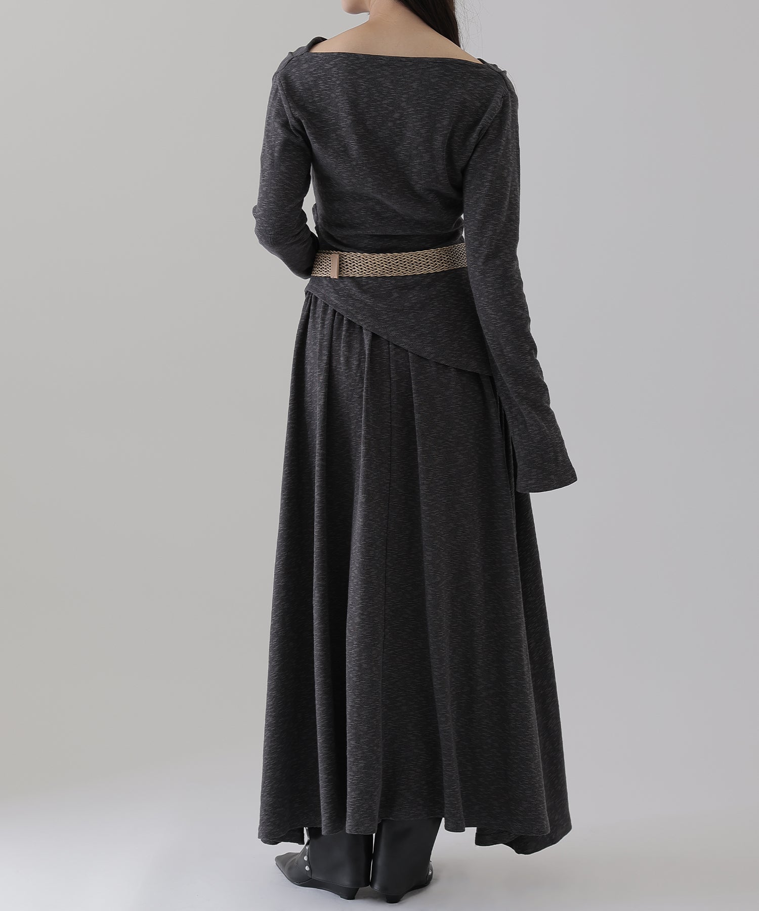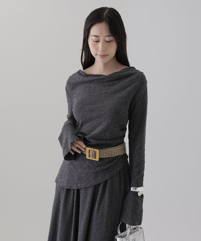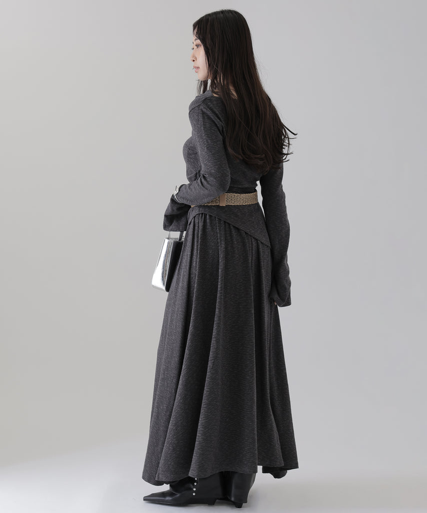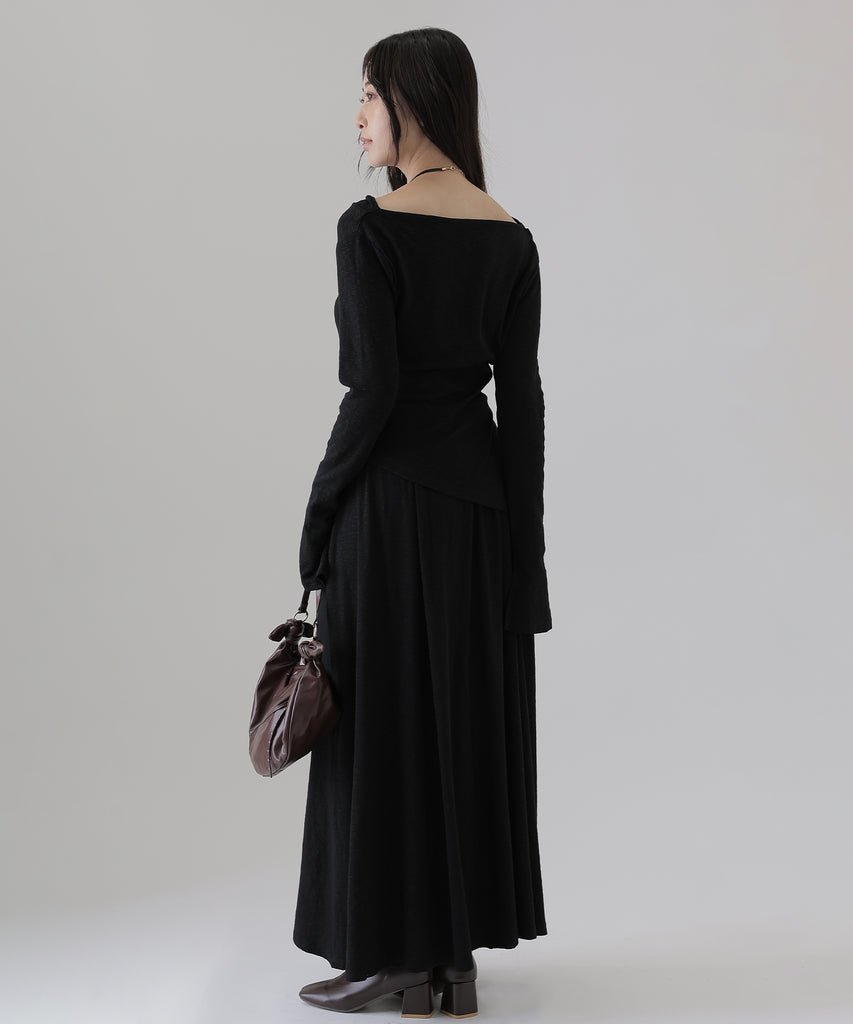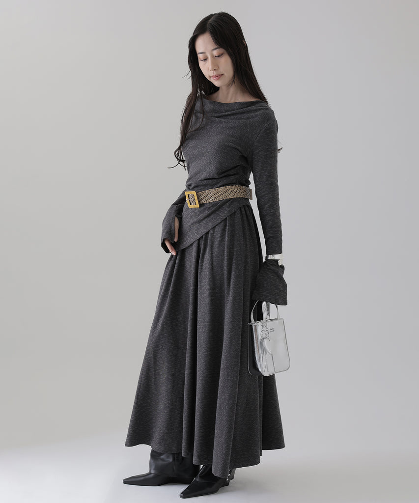 アシンメトリーなヘムラインも相まって、ニュアンスたっぷりの表情に。