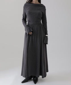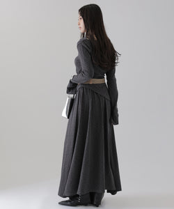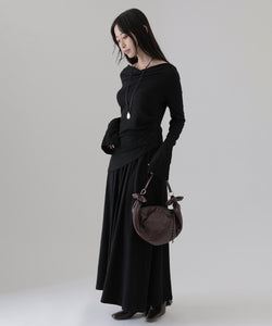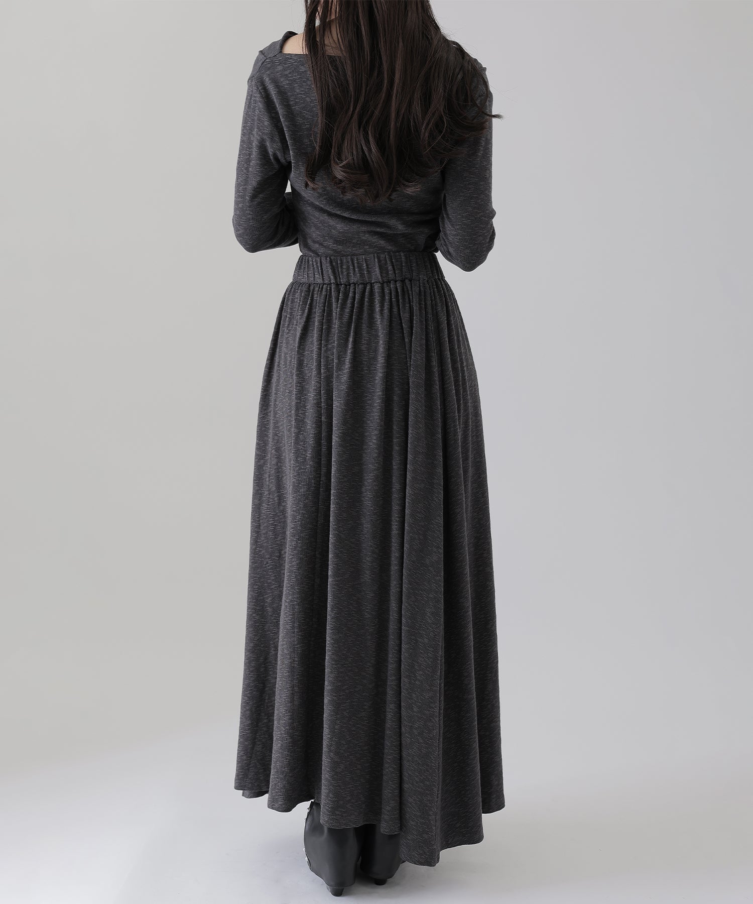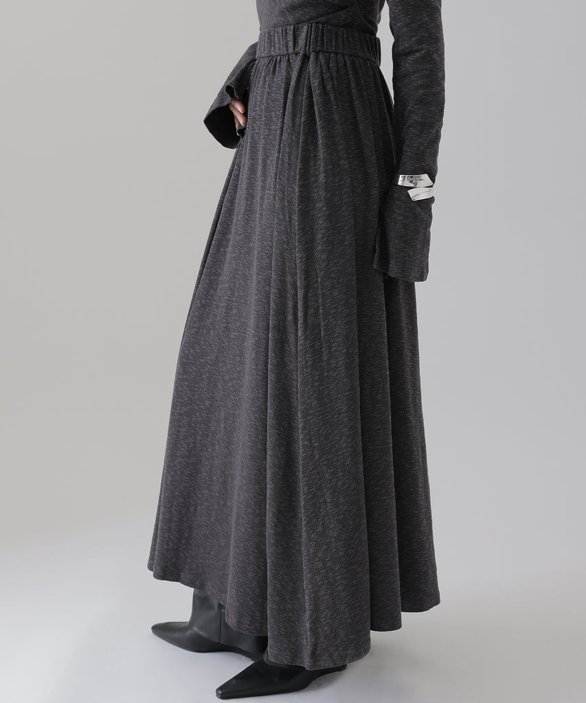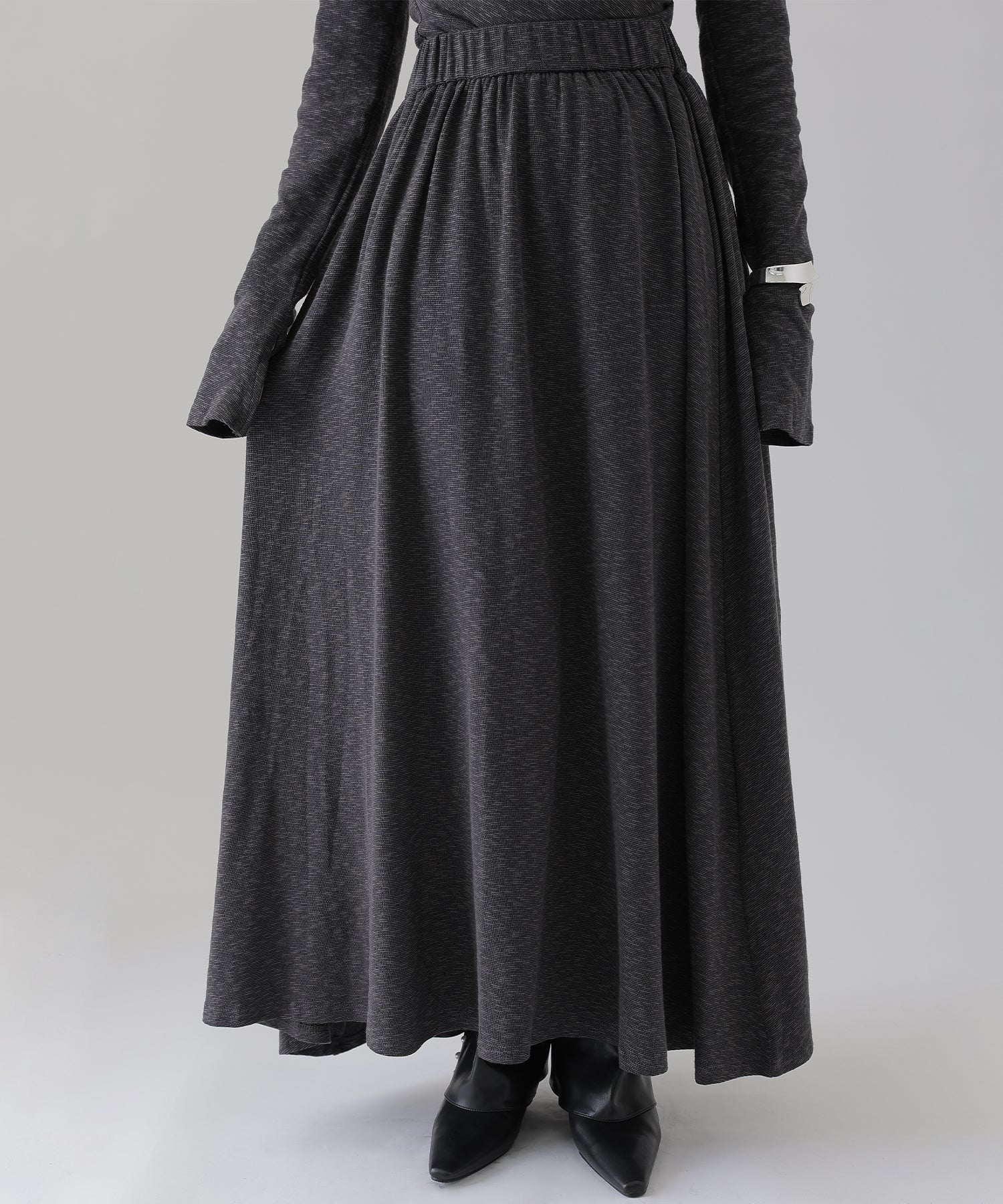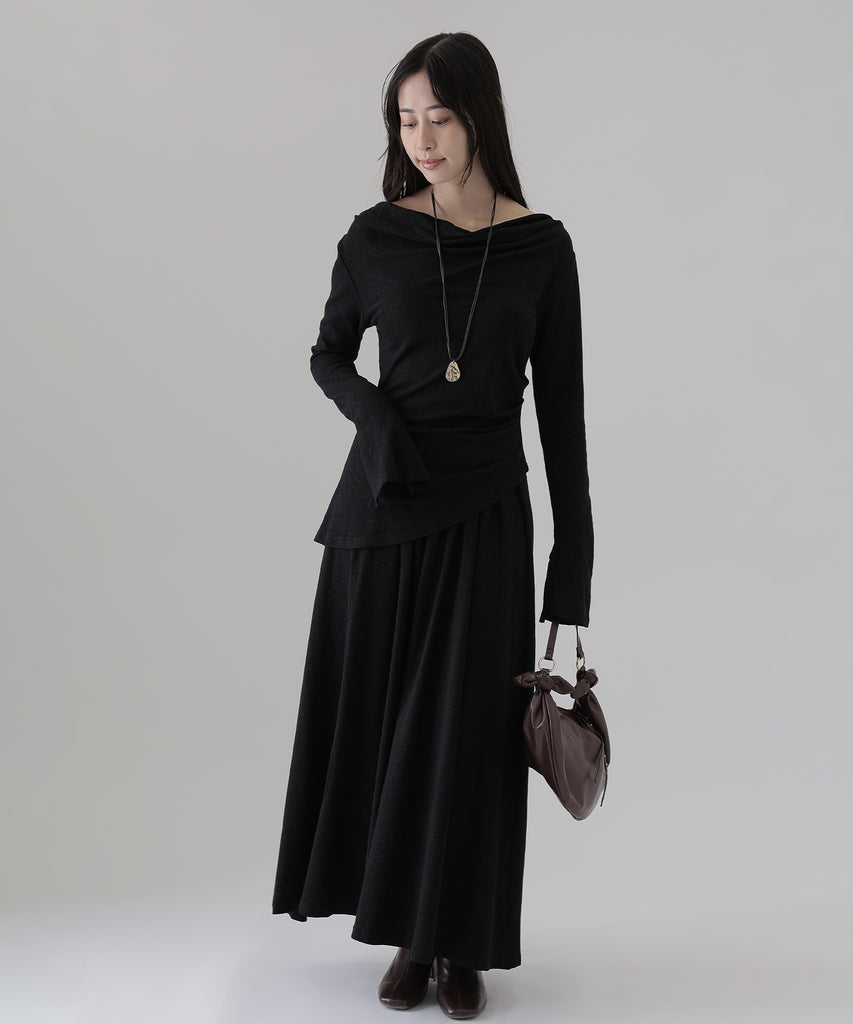ロングスカートはウエストゴムのラクな穿き心地で、美しいドレープがコーデに動きをプラスしてくれます。