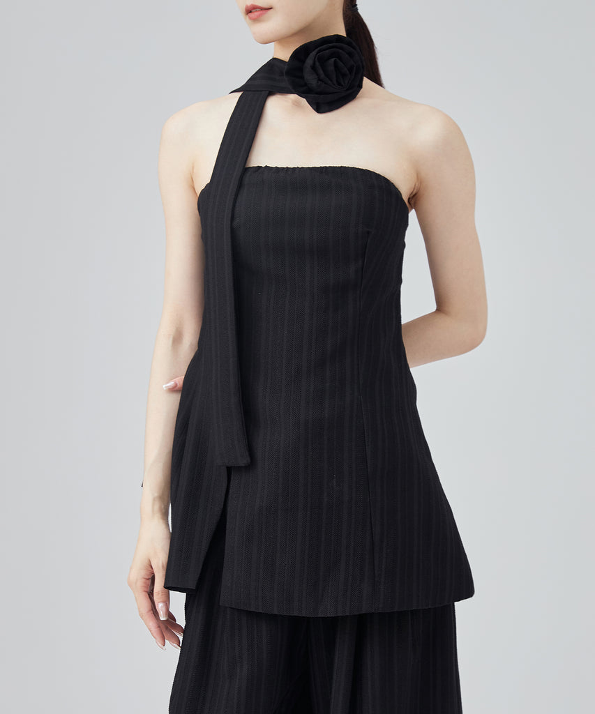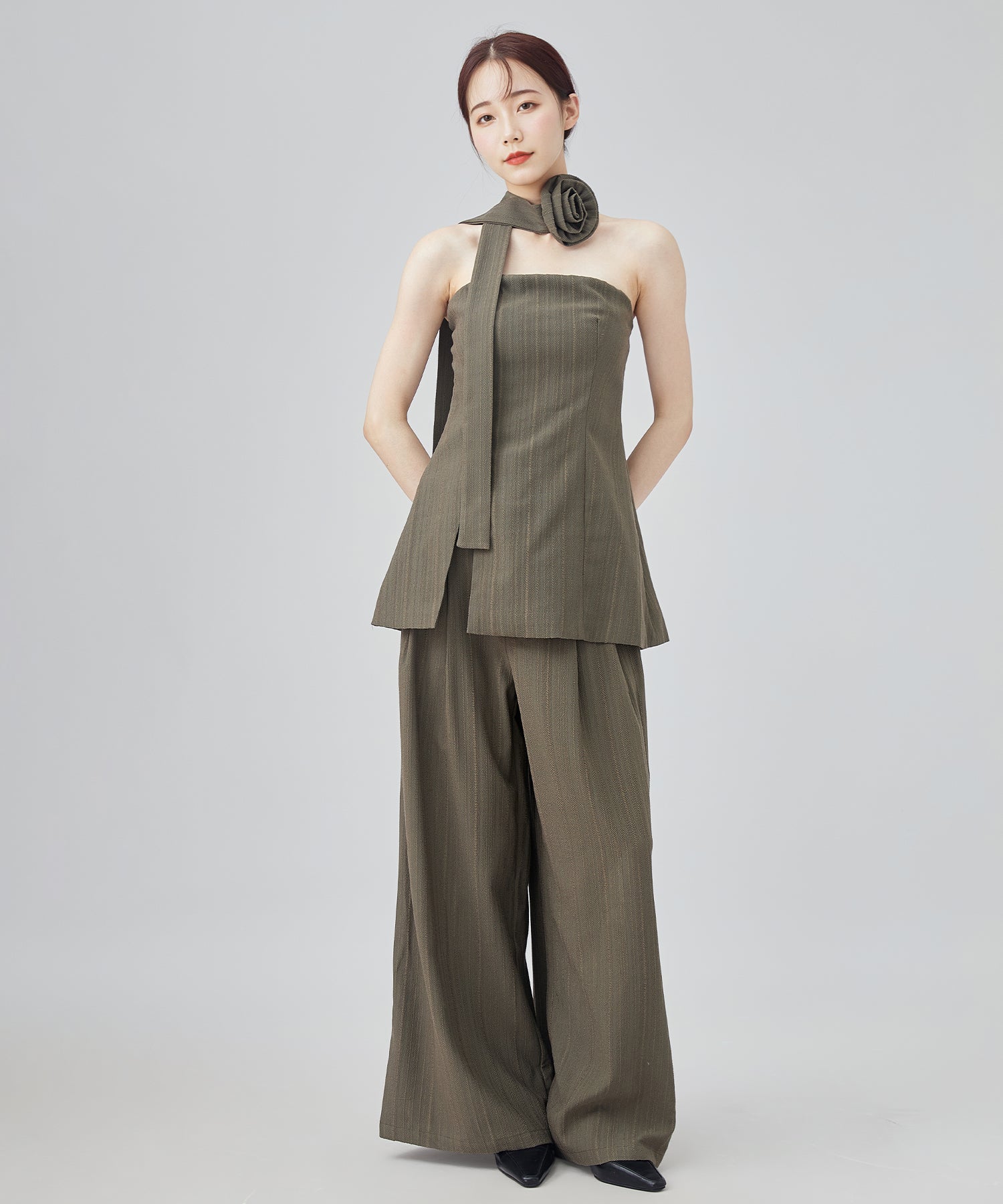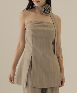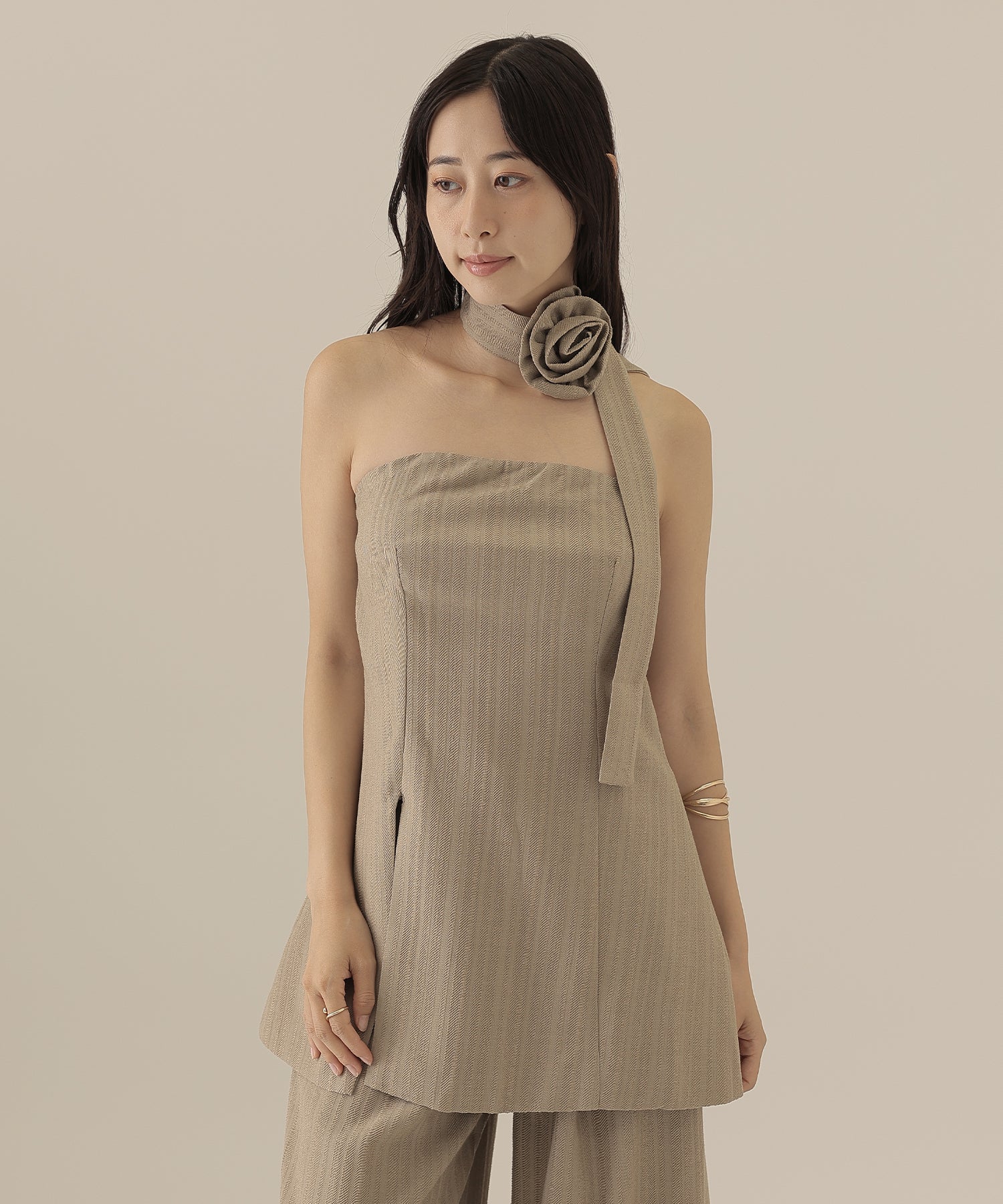 大きなコサージュが付いたチョーカーをセットにして、スタイリッシュ且つ着映えるアイテムに仕上げました。