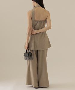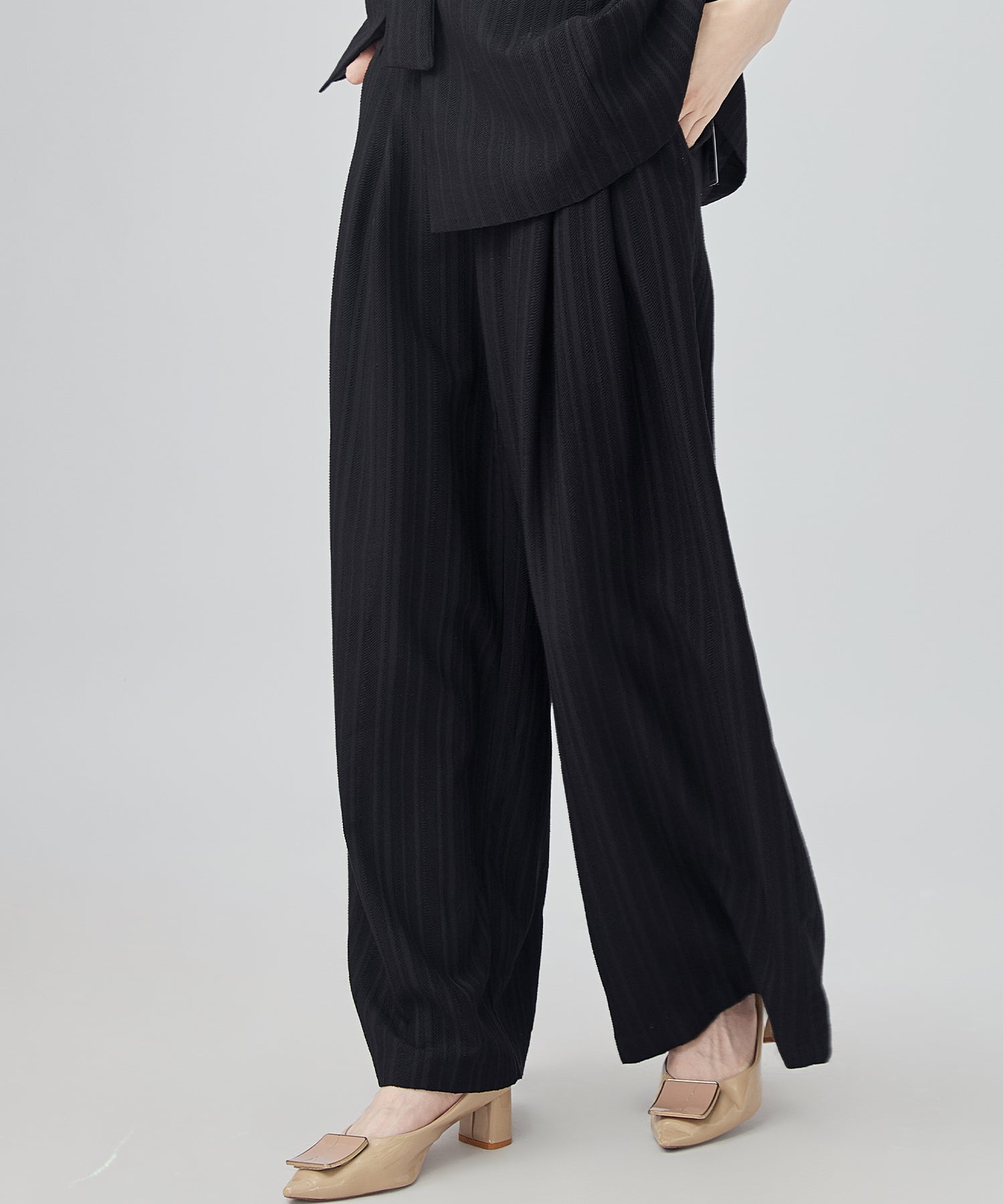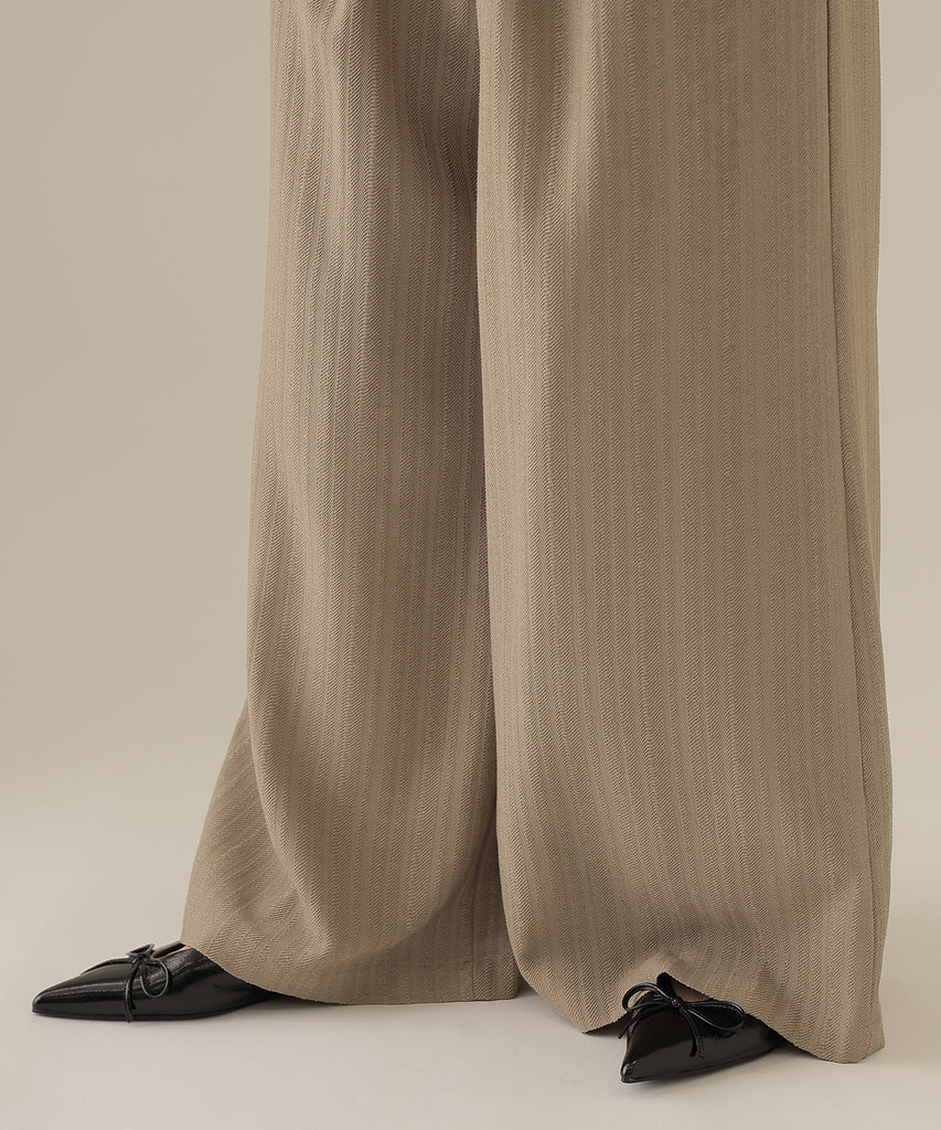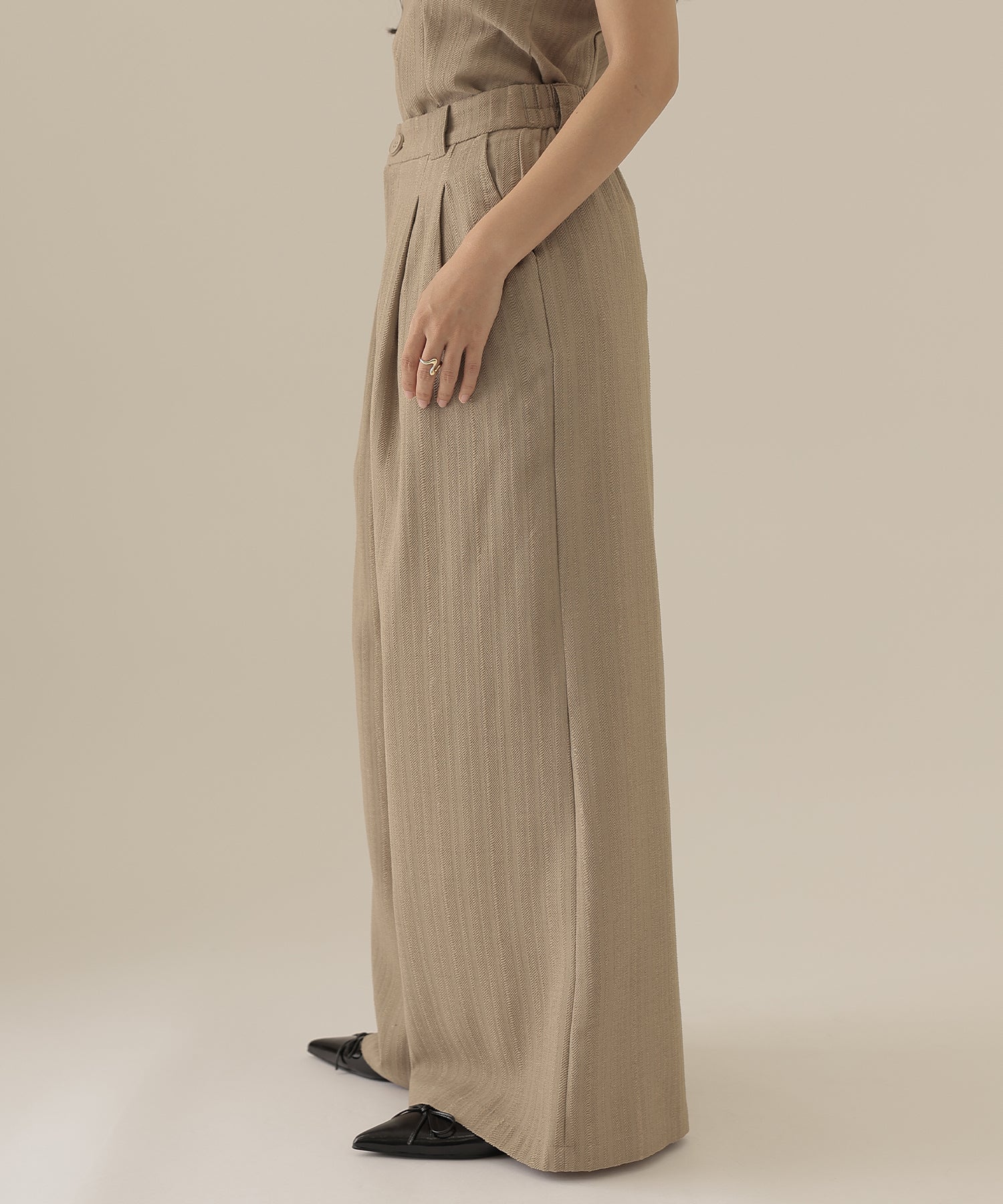 落ち感がきれいに出るワイドパンツを採用して、ヘムラインが引き立つようにこだわりました。