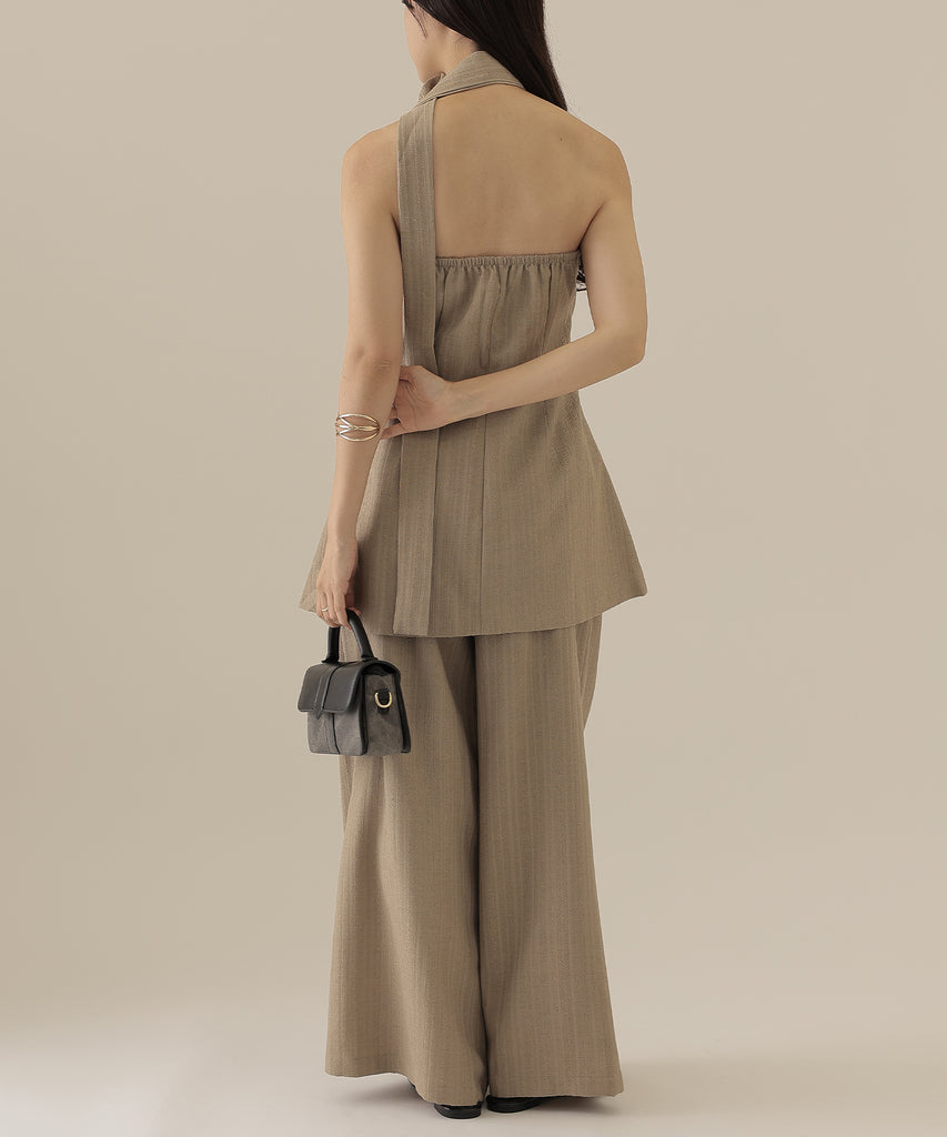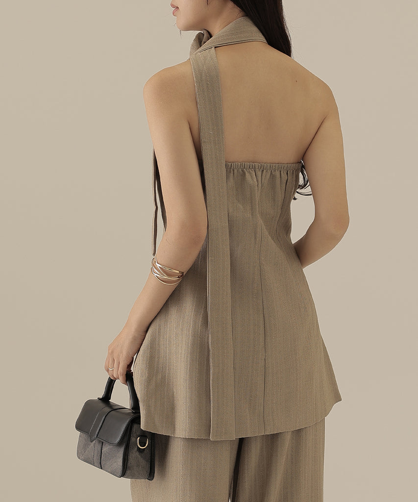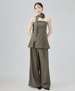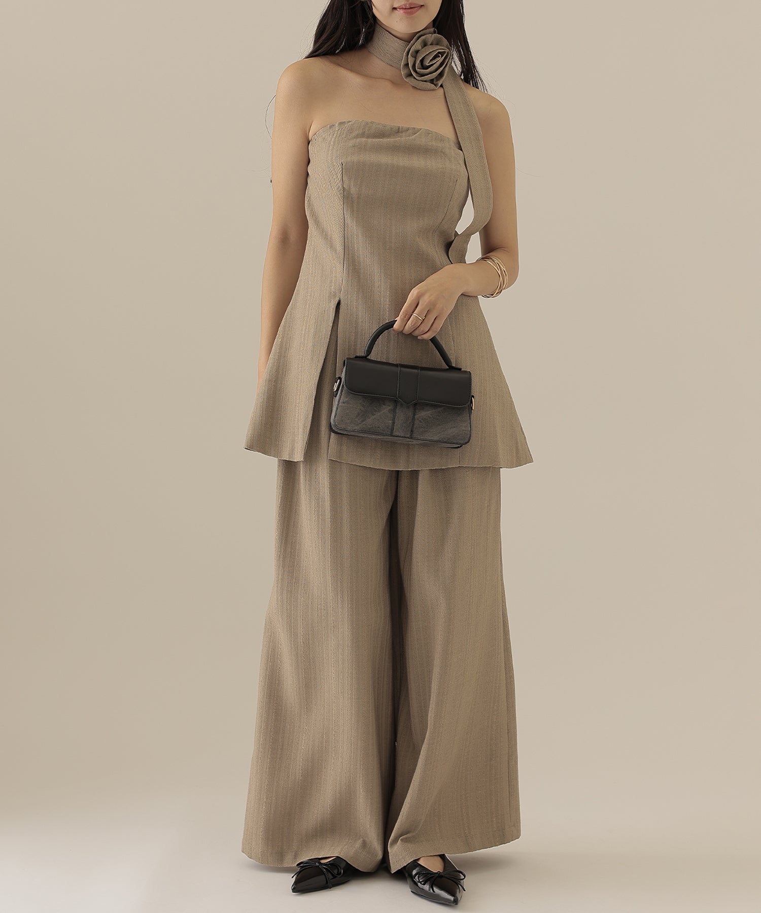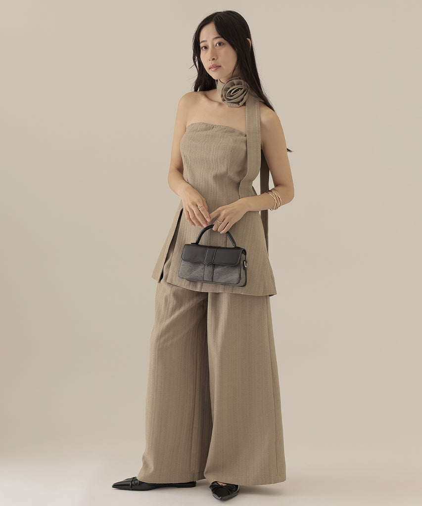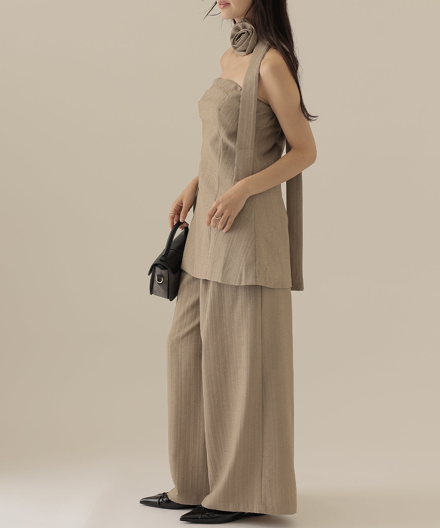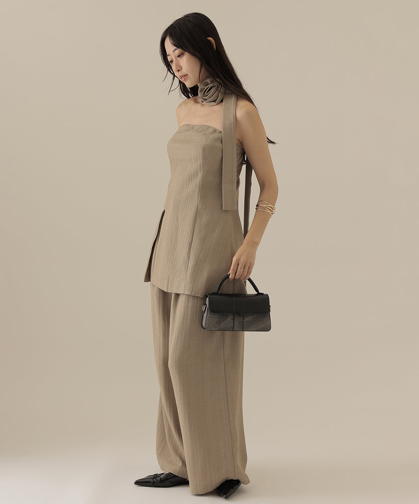 ヘリンボーンの生地を使用したビスチェとパンツのセットアップ。
