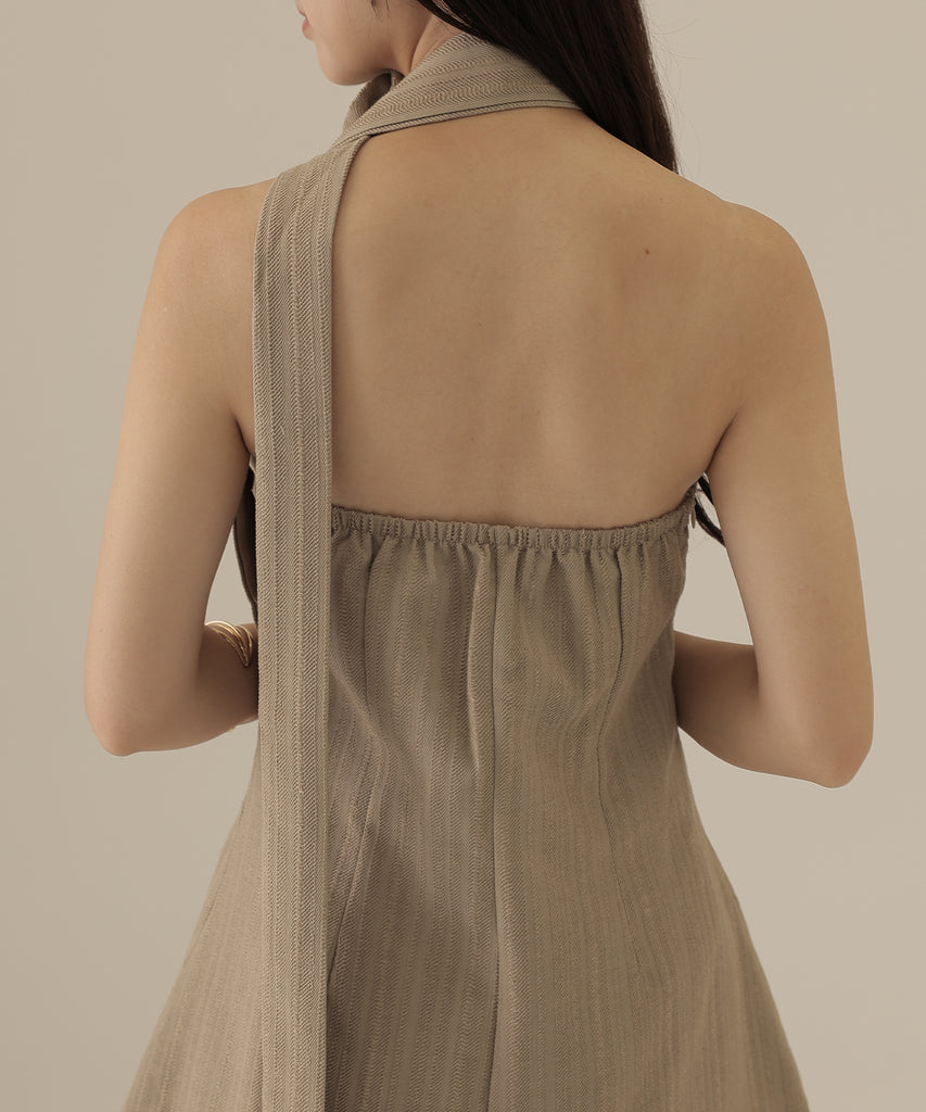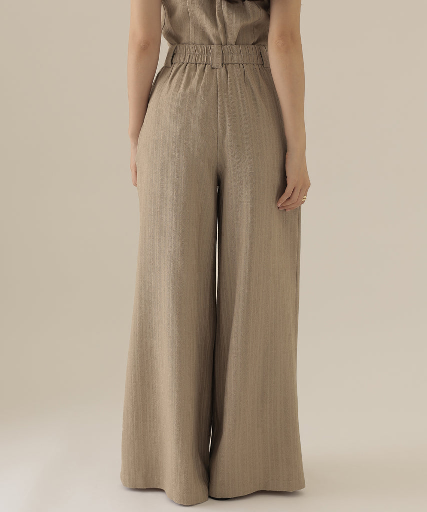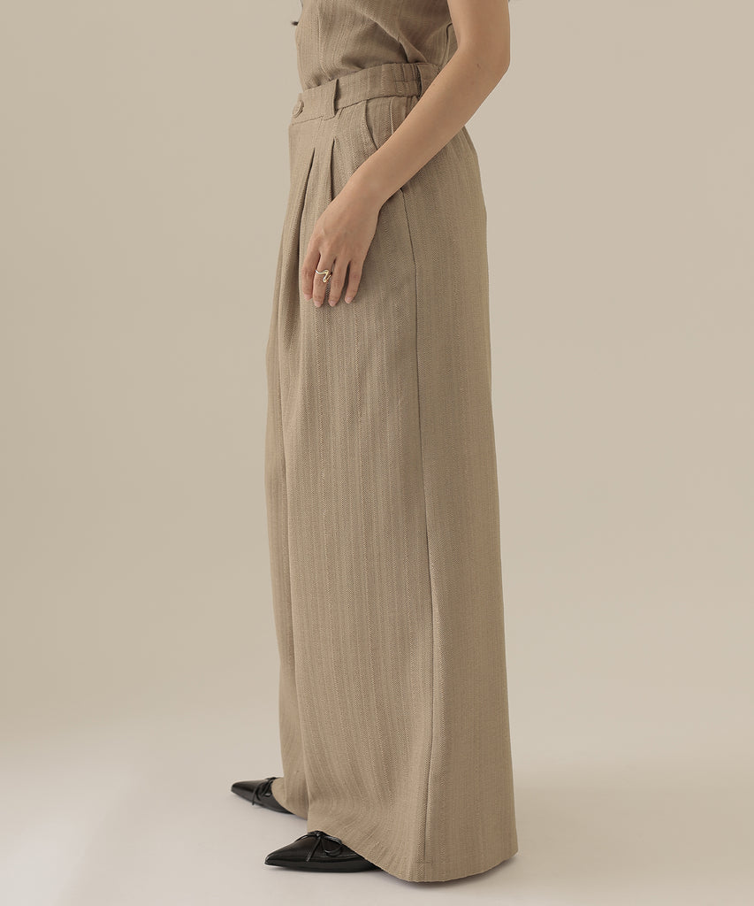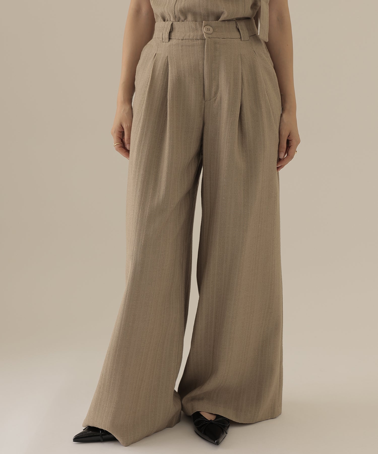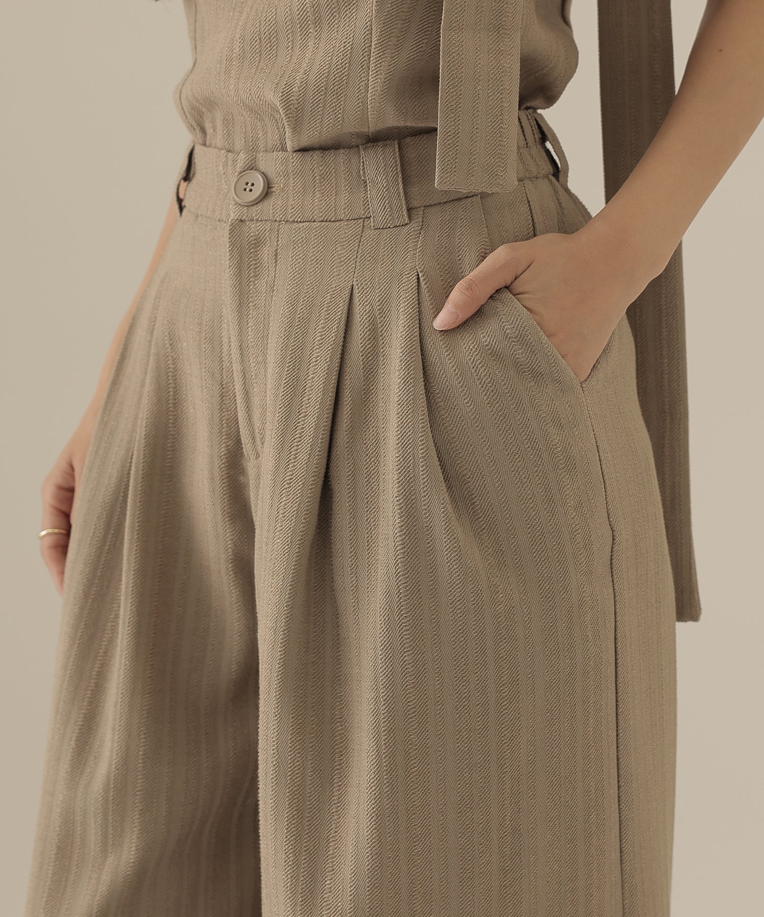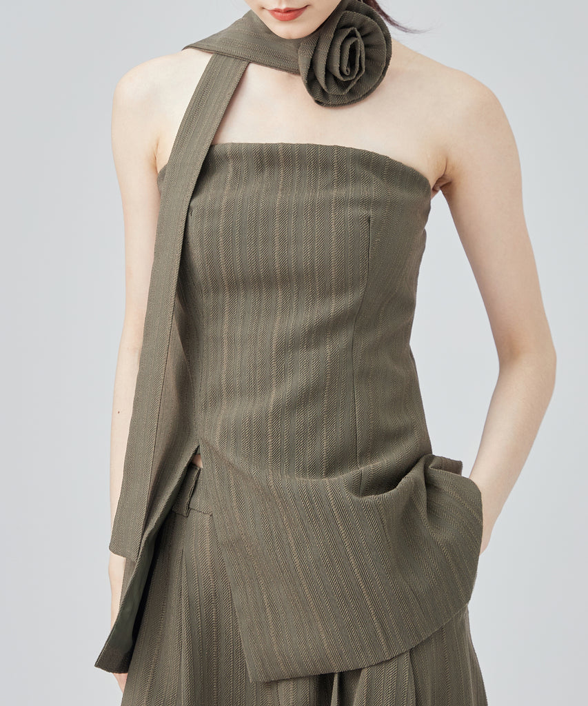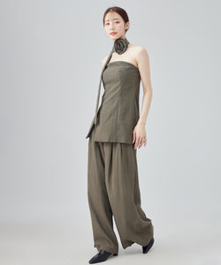 ヘリンボーンの生地を使用したビスチェとパンツのセットアップ。