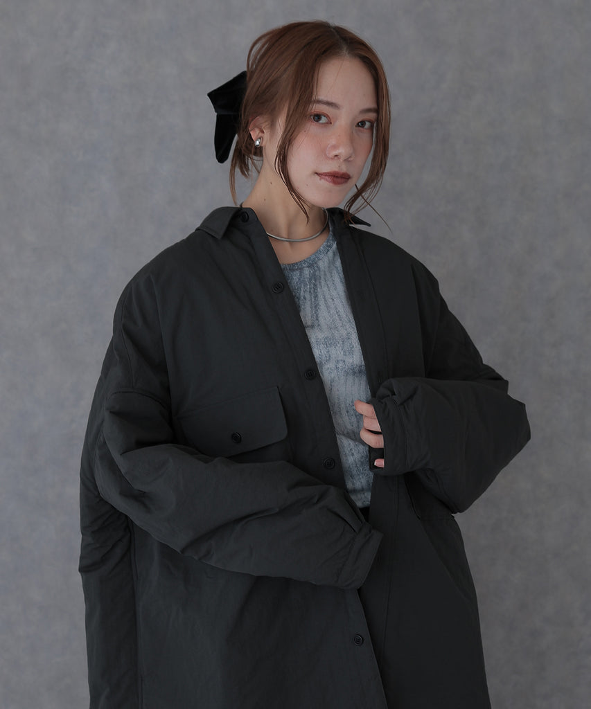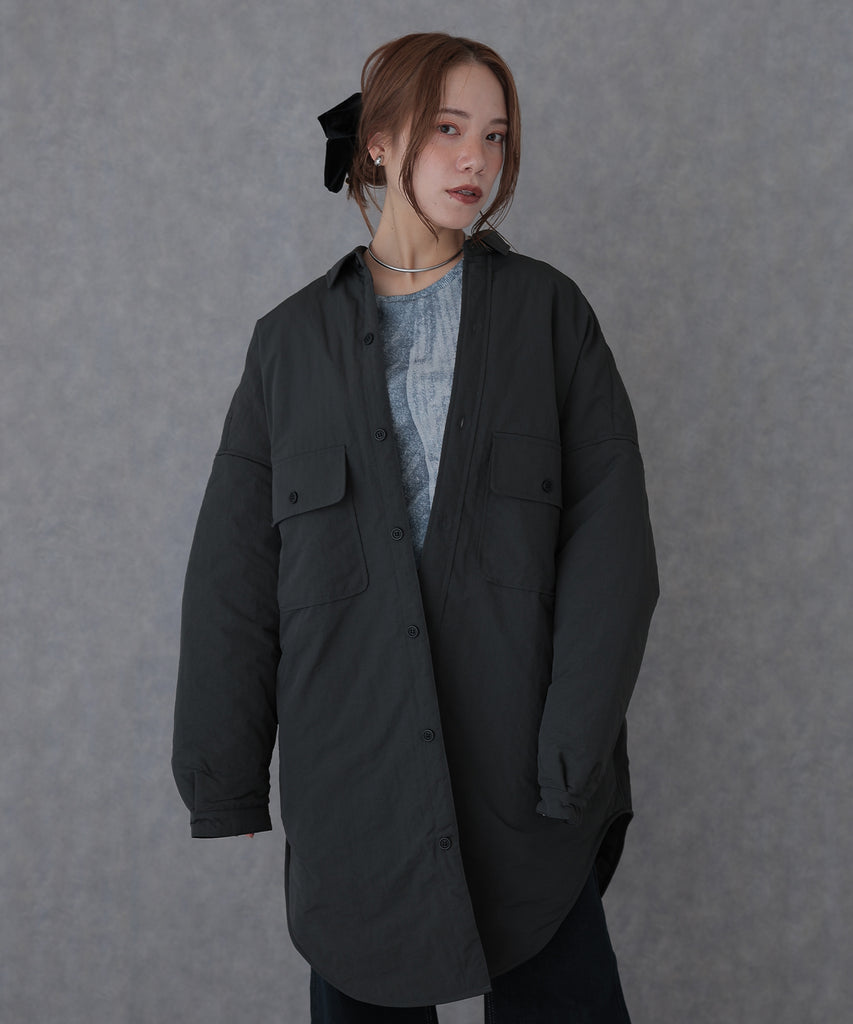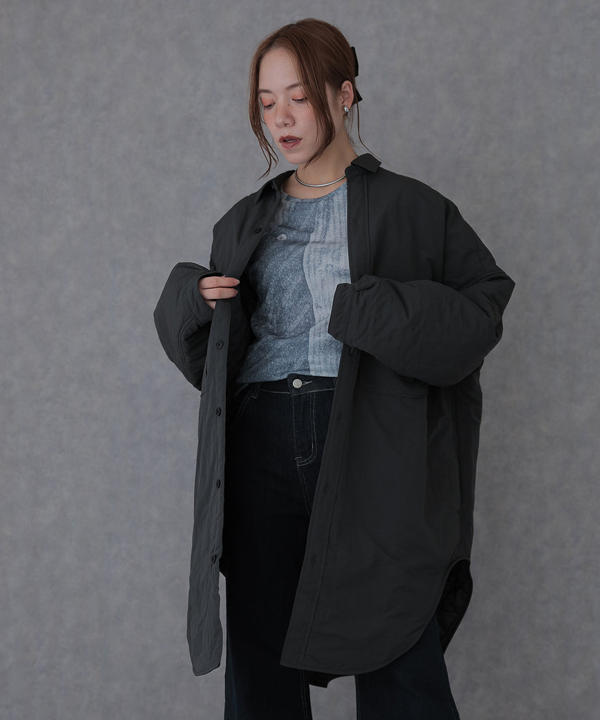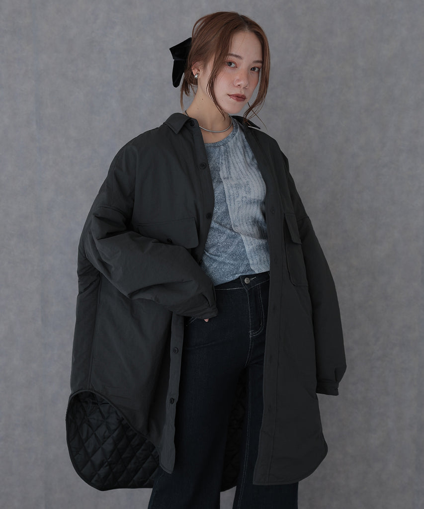 肌寒くなってくる季節の変わり目に重宝する、オーバーシルエットのキルティング入りシャツジャケット。