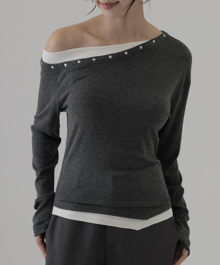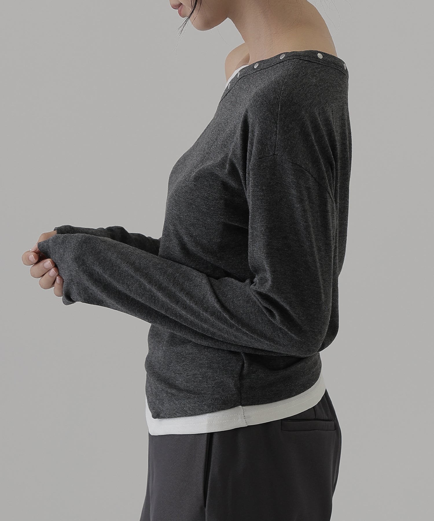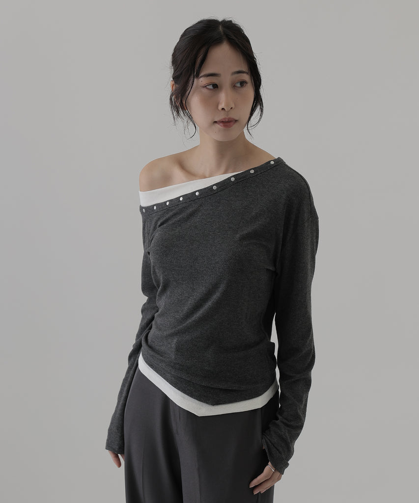 カットソーを2枚重ねたようなデザインが目を惹く長袖トップス。