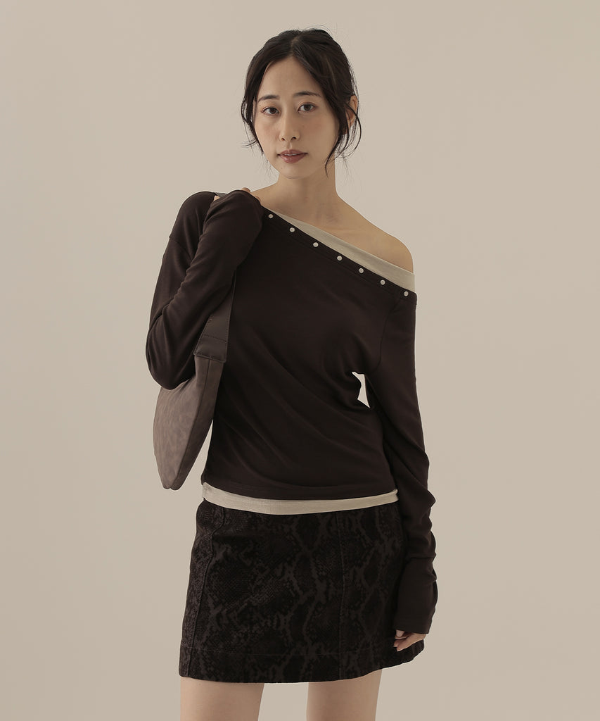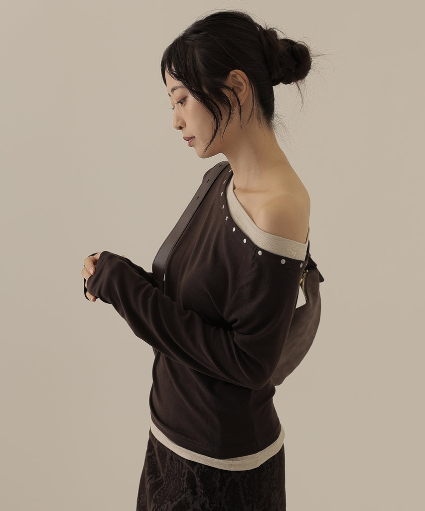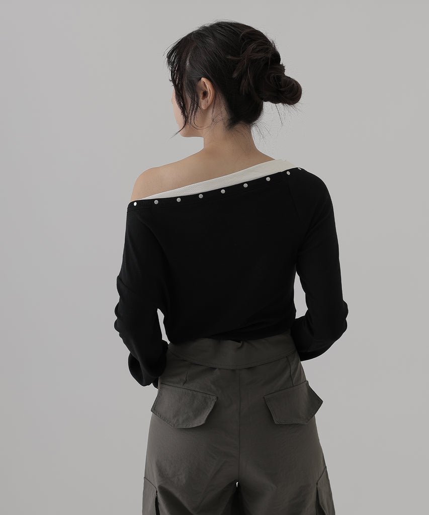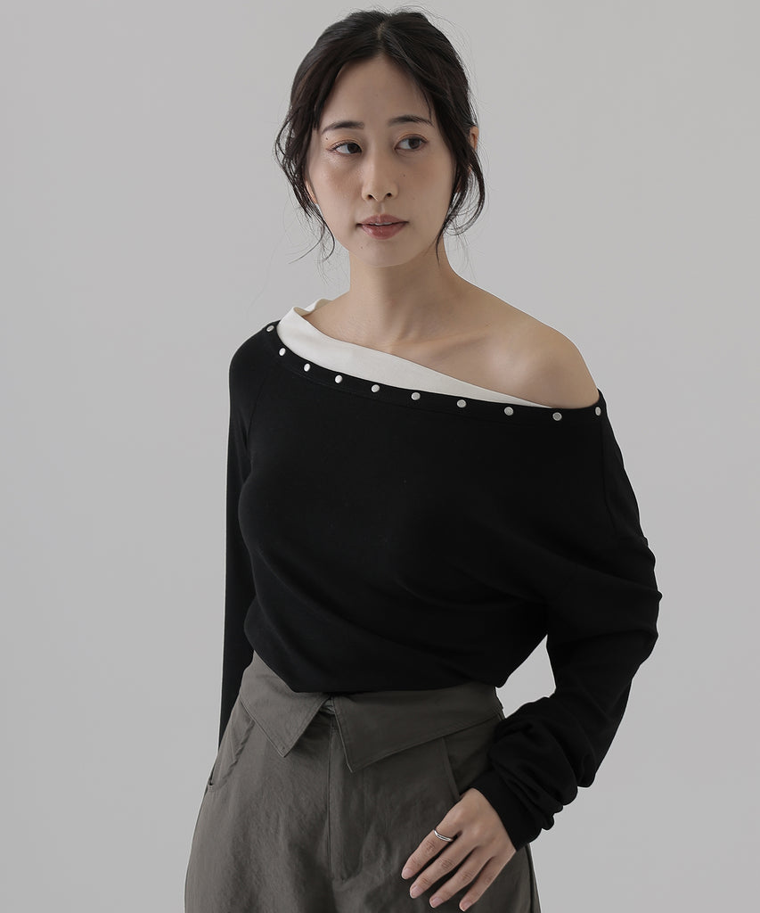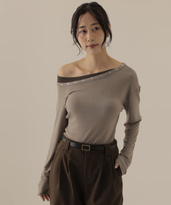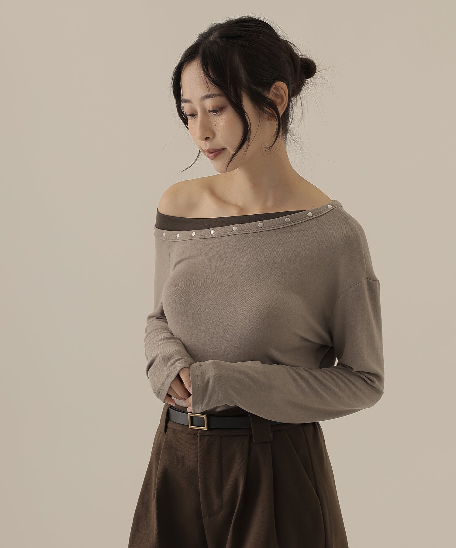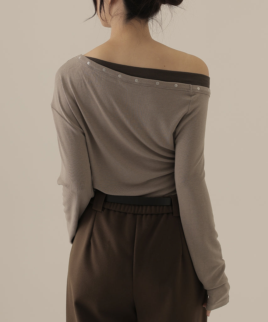ネックラインの小さなメタルボタンをアクセントに、肌が覗くオフショルデザインを採用して抜け感バツグンの佇まいに。