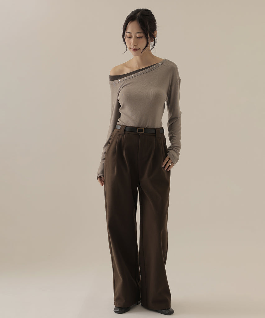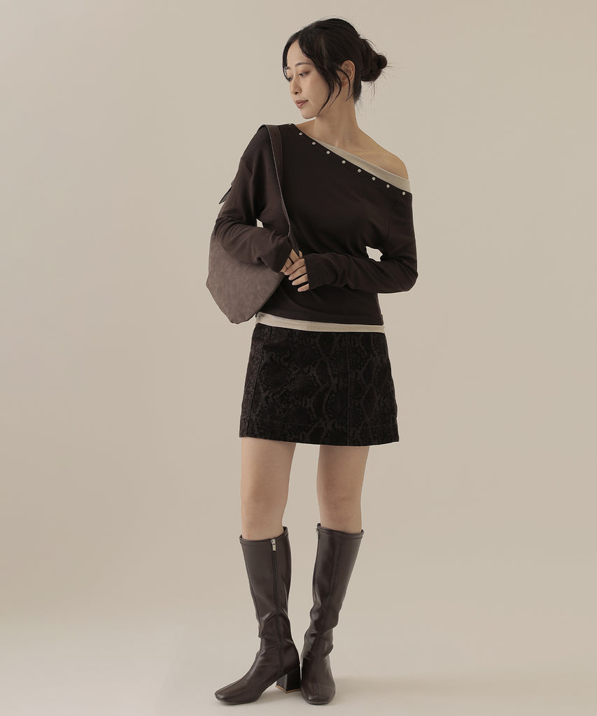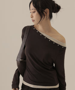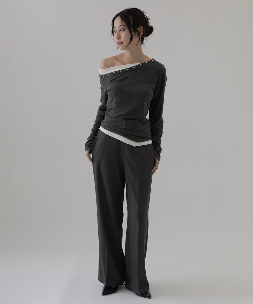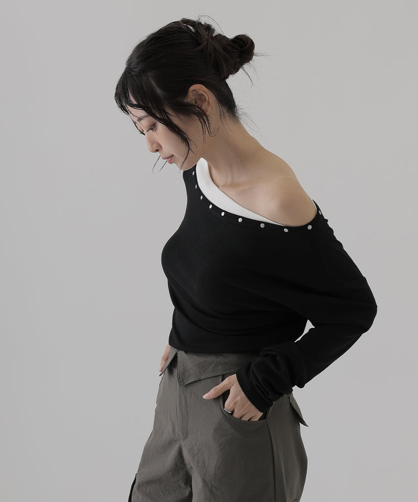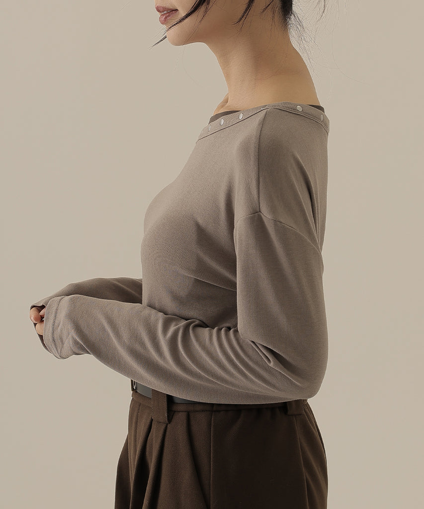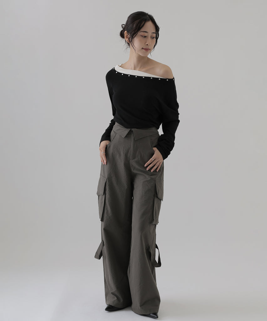 ネックラインの小さなメタルボタンをアクセントに、肌が覗くオフショルデザインを採用して抜け感バツグンの佇まいに。