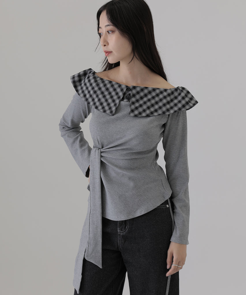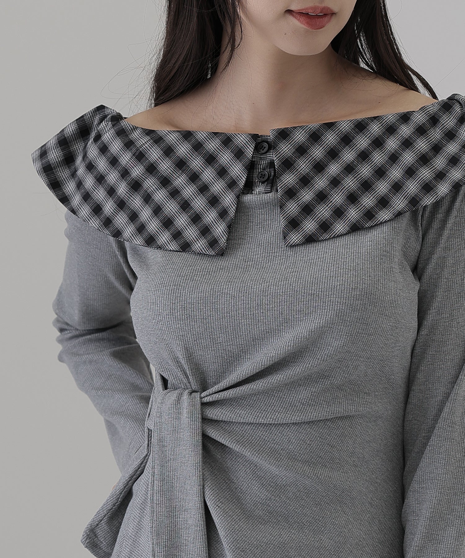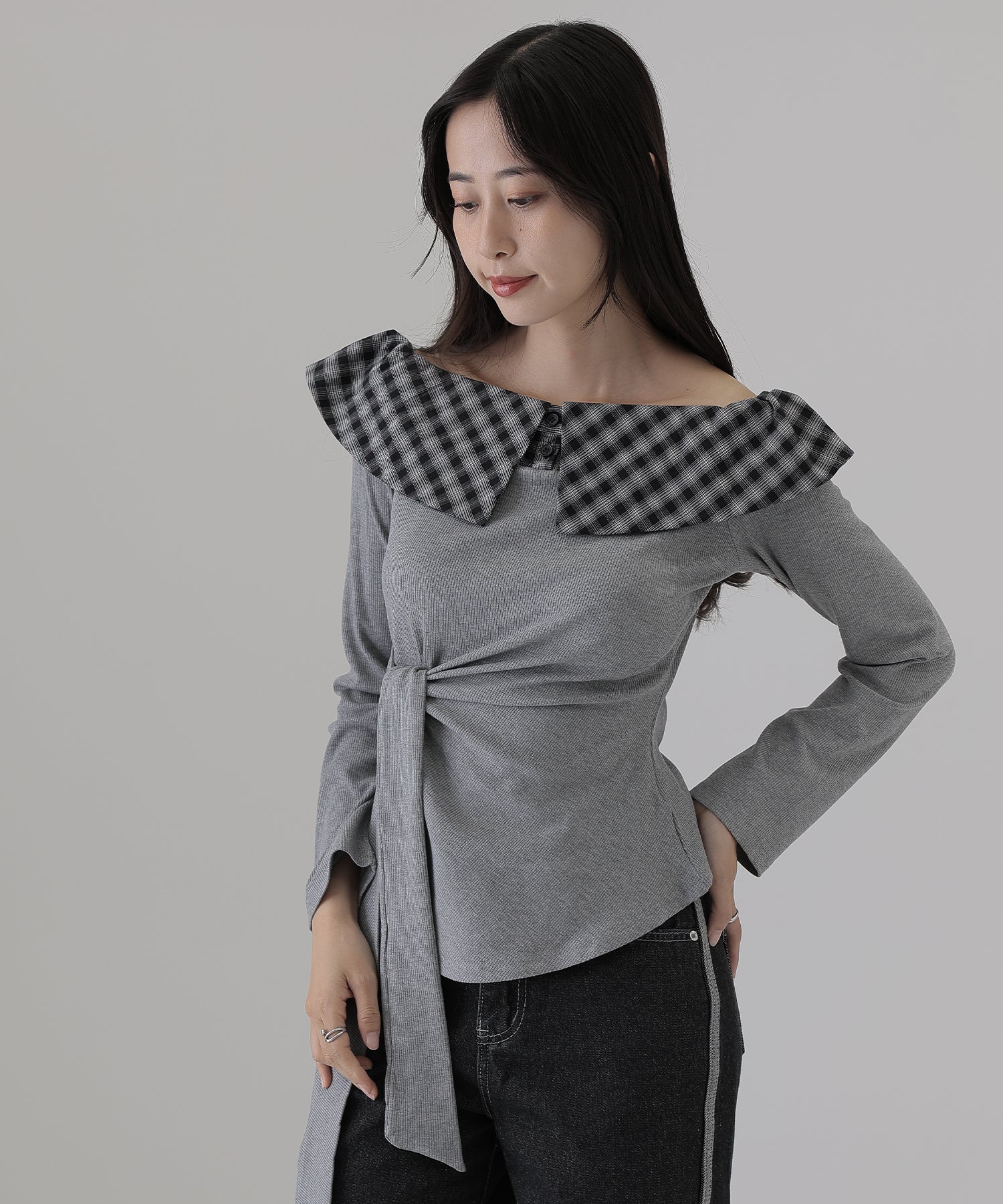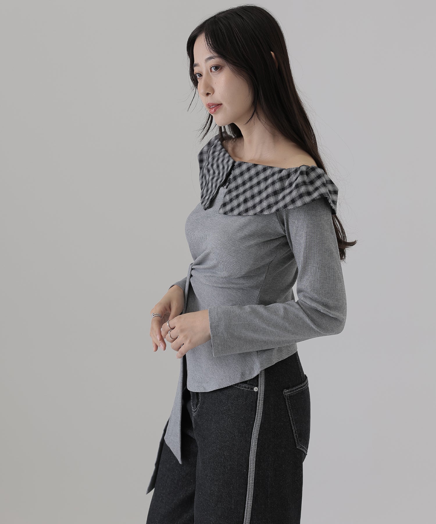 チェック柄のビッグカラーが顔まわりを華やげるトップス。