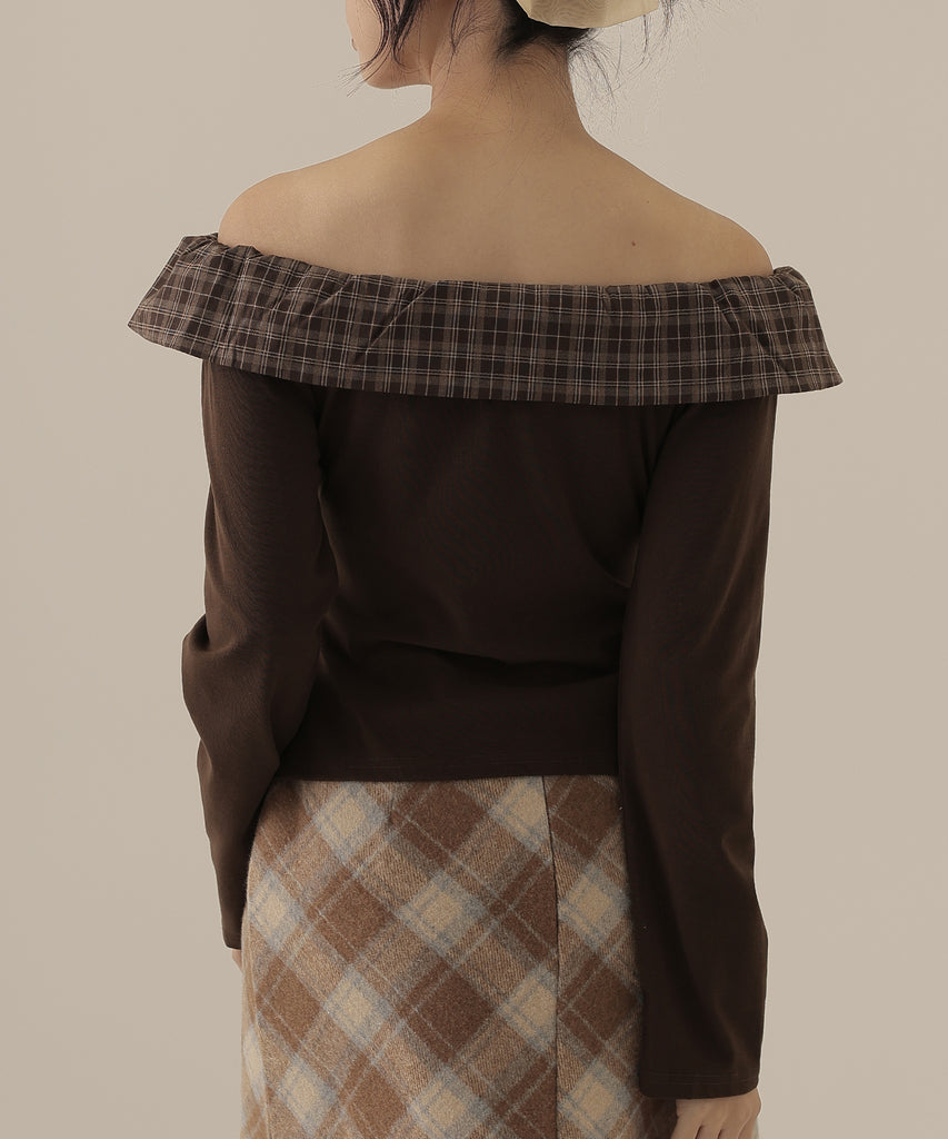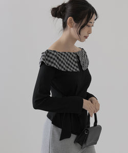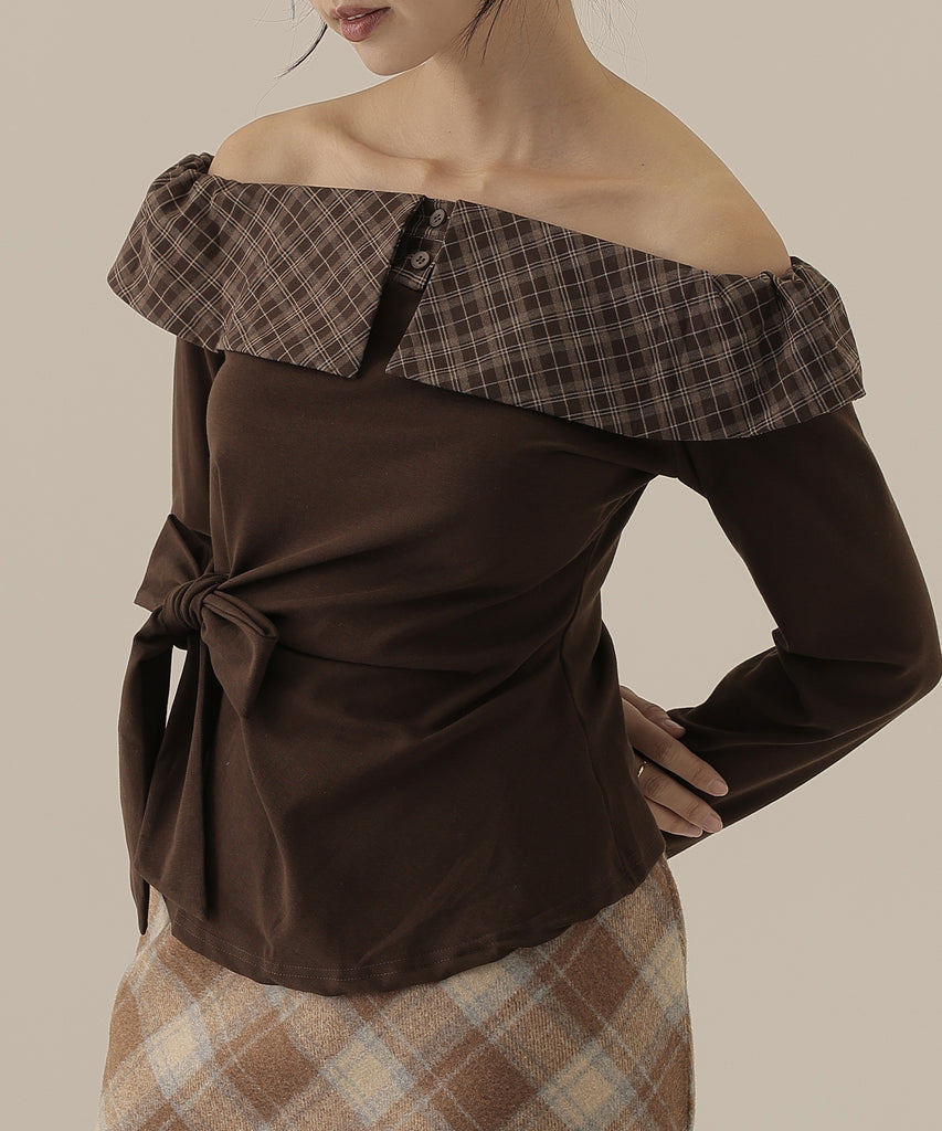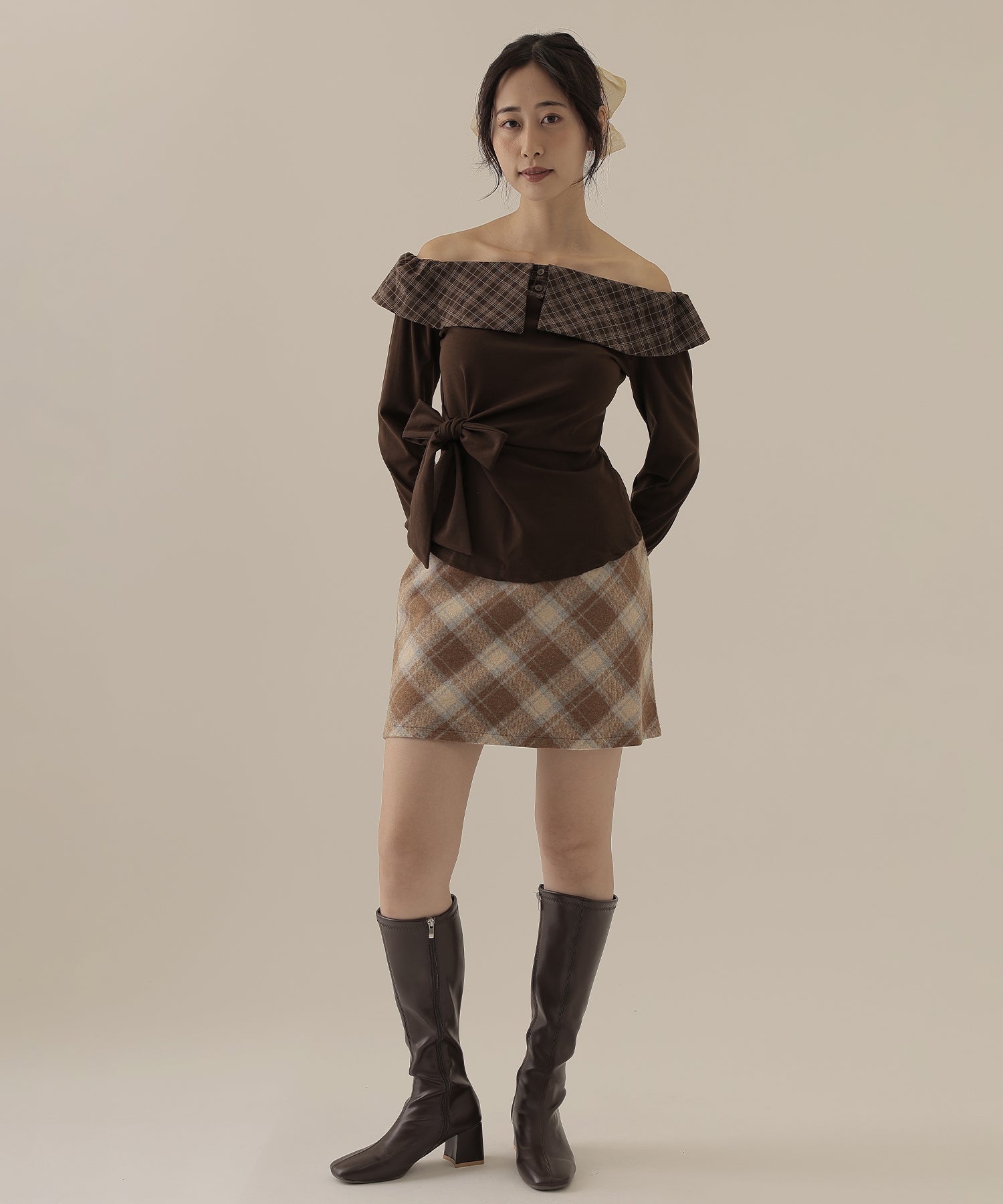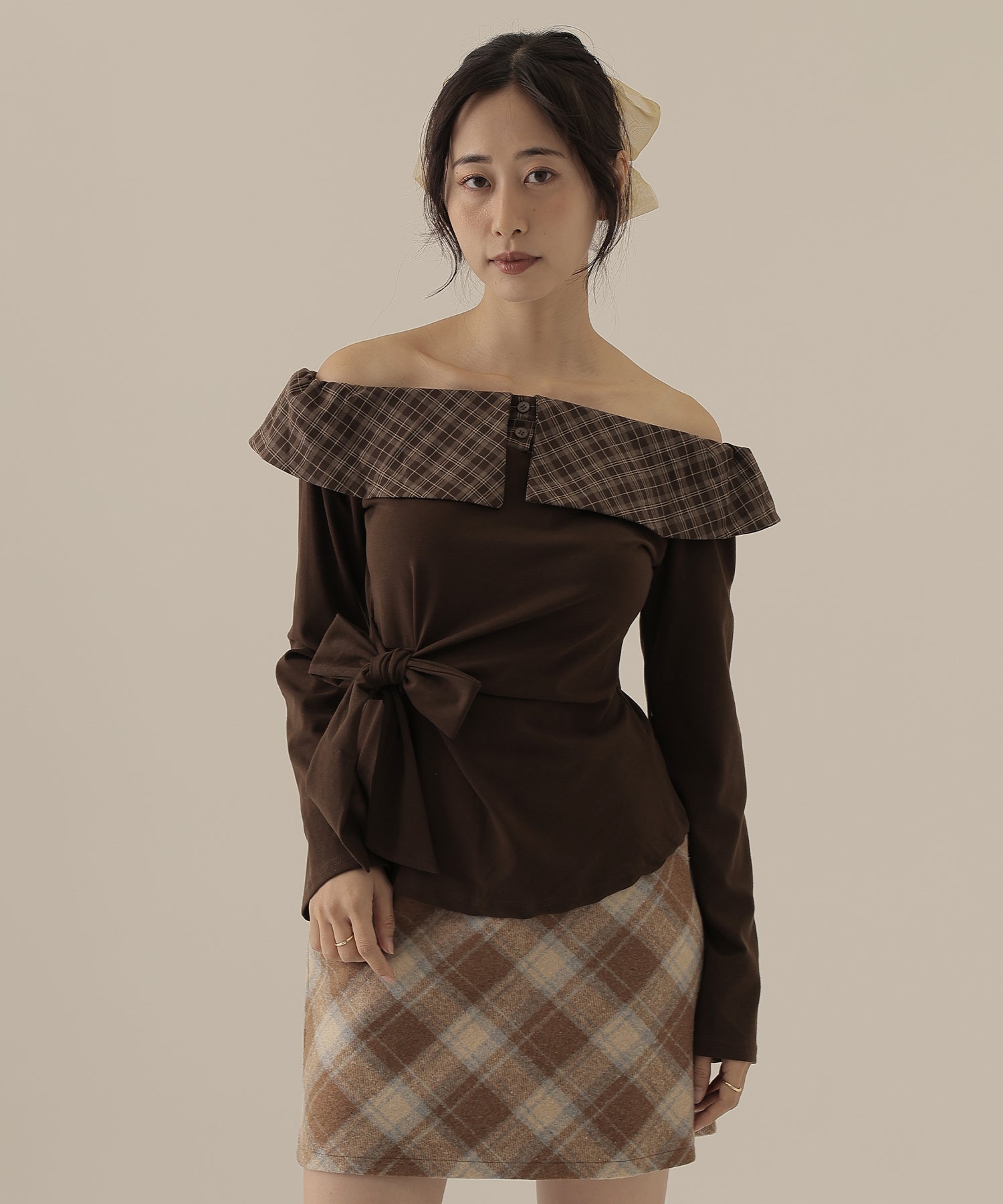 チェック柄のビッグカラーが顔まわりを華やげるトップス。