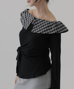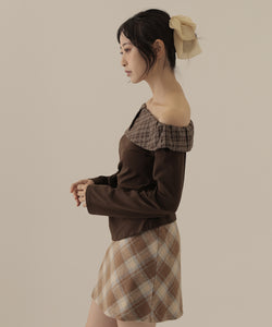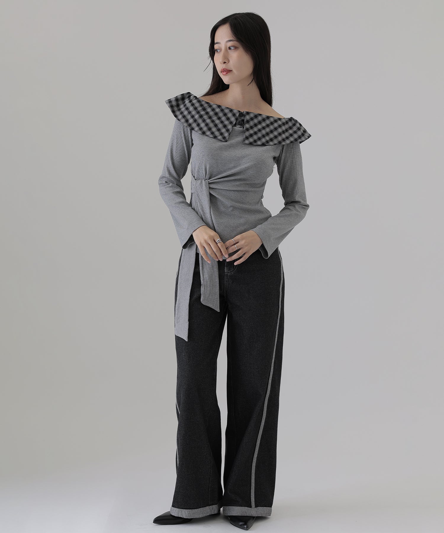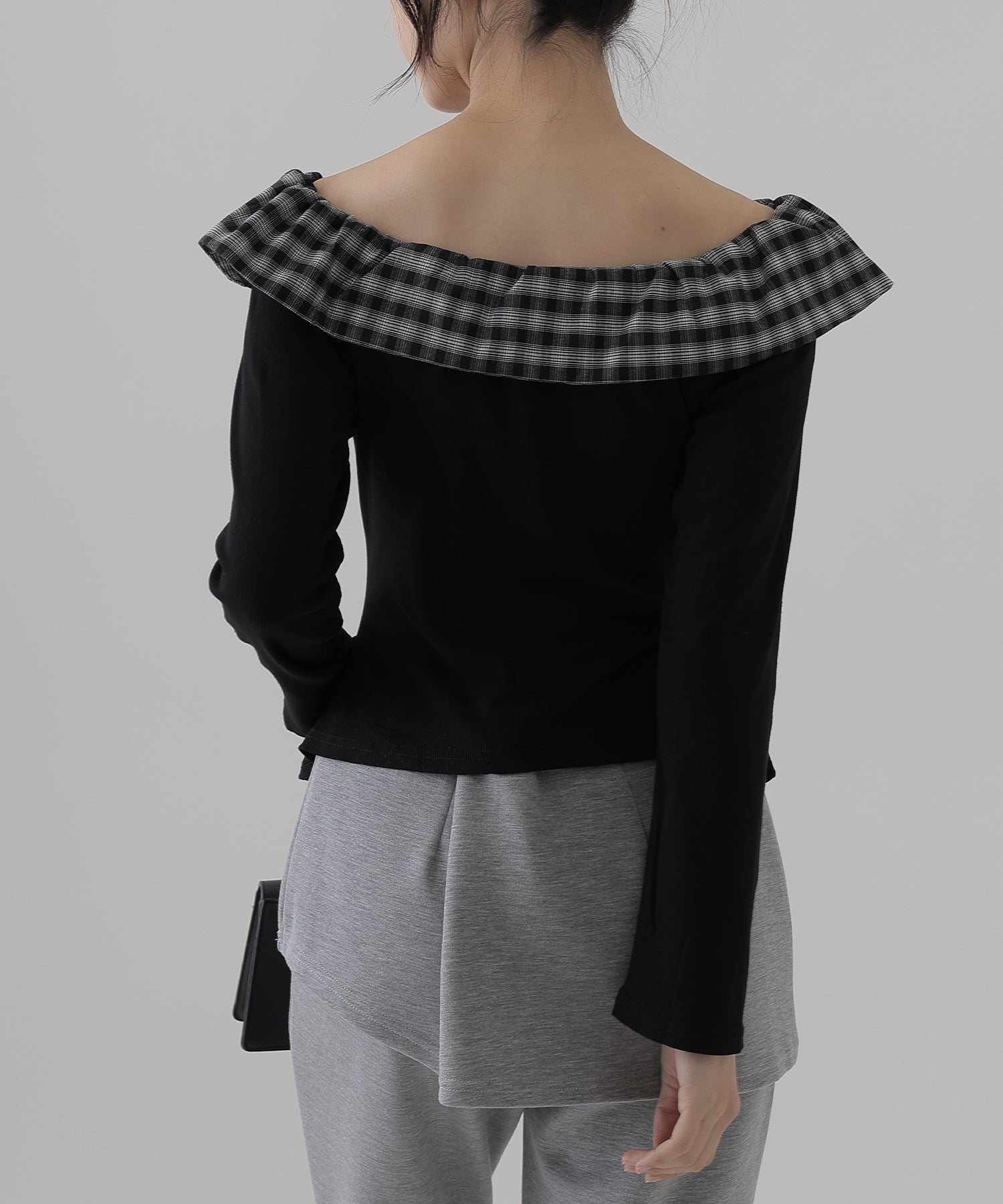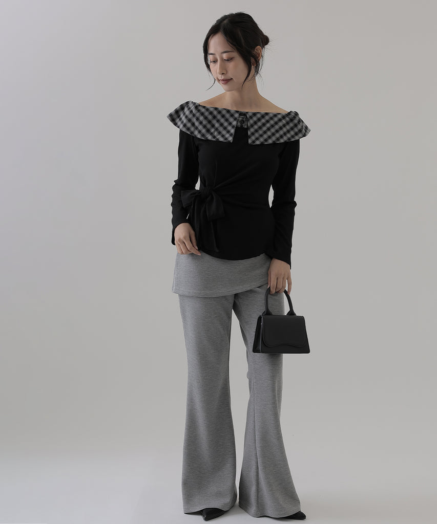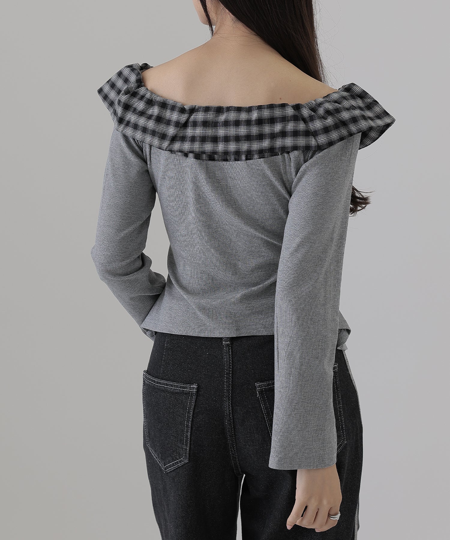 チェック柄のビッグカラーが顔まわりを華やげるトップス。