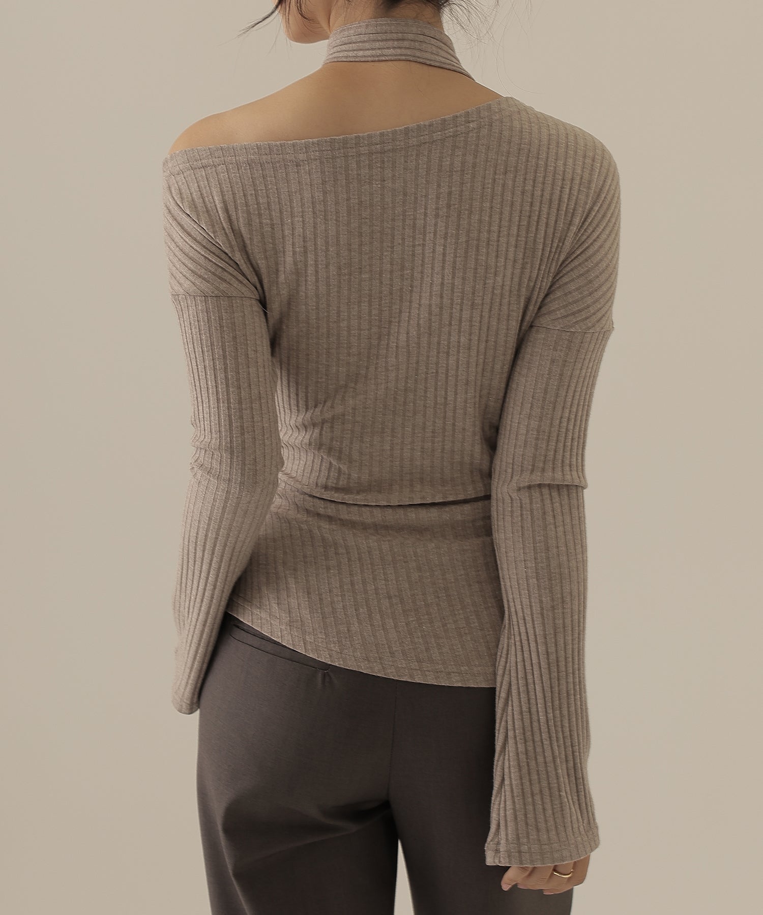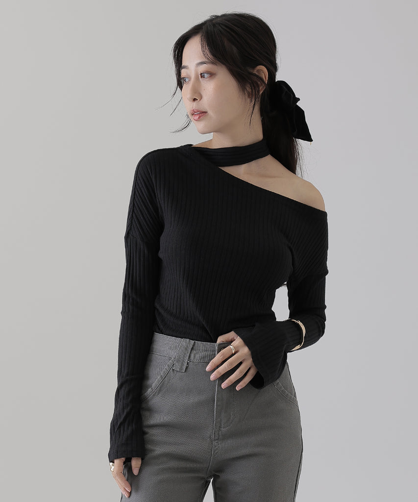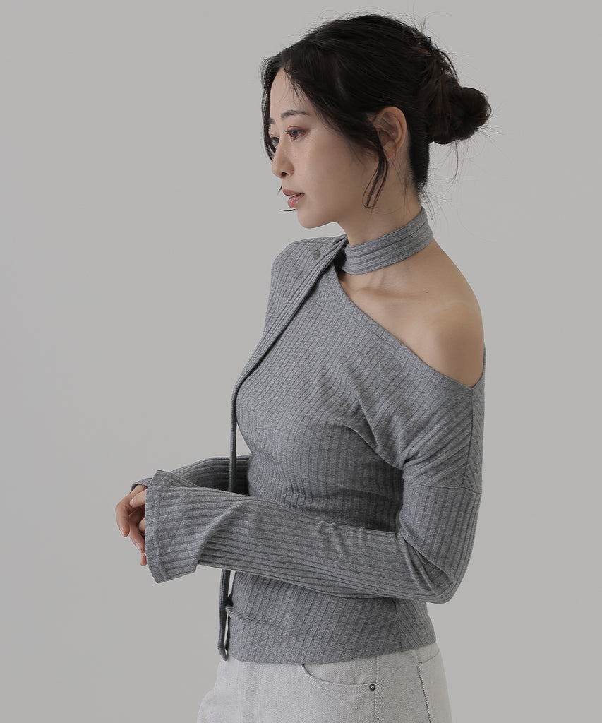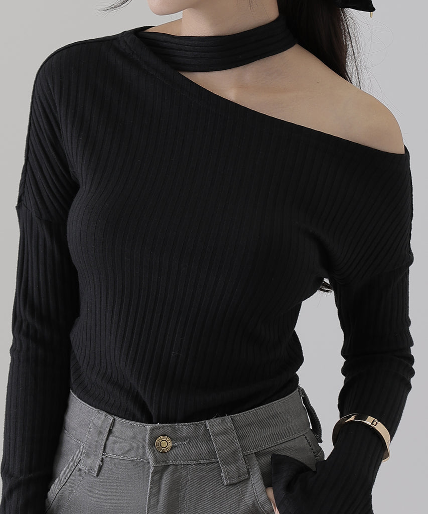 チョーカーリボンを備えたトレンド顔のリブトップス。
