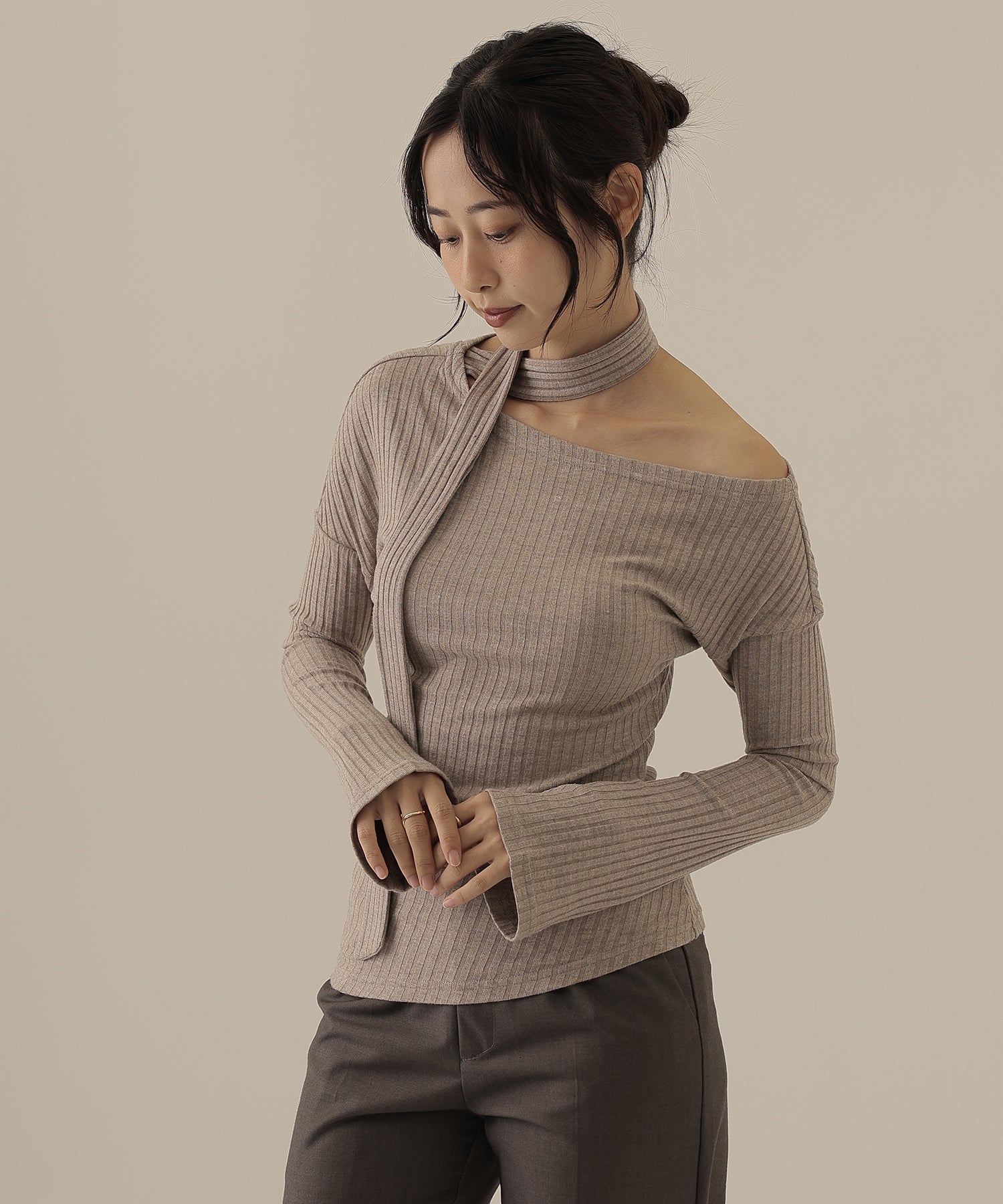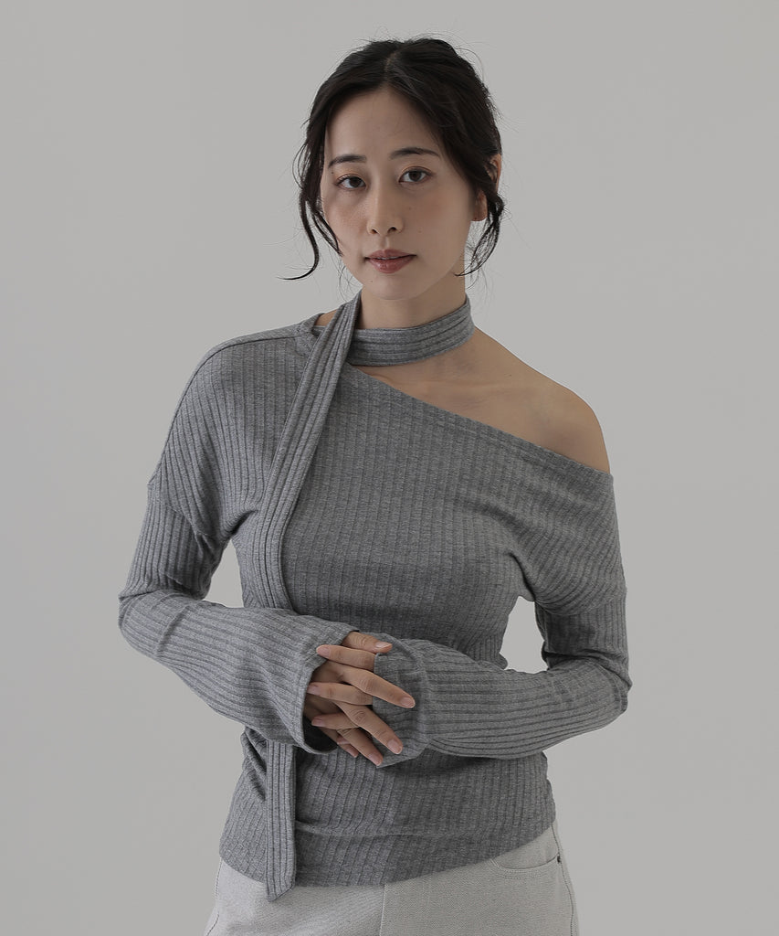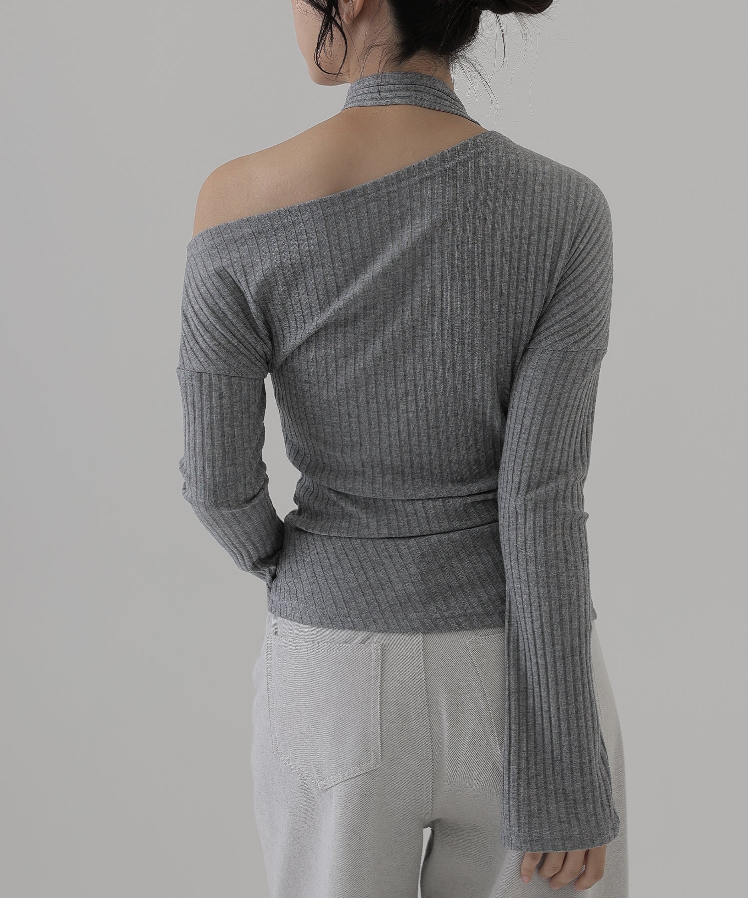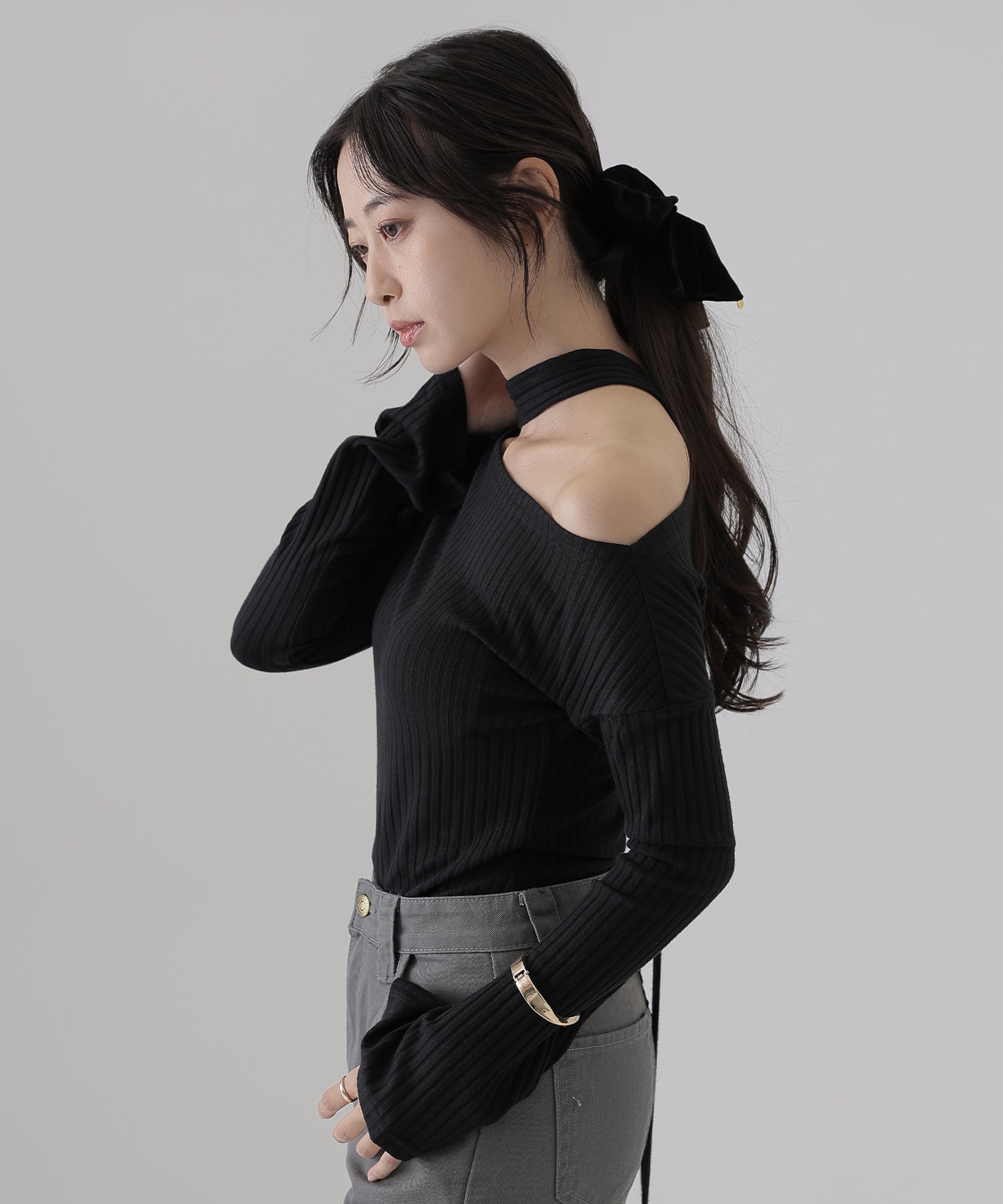 チョーカーリボンを備えたトレンド顔のリブトップス。
