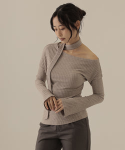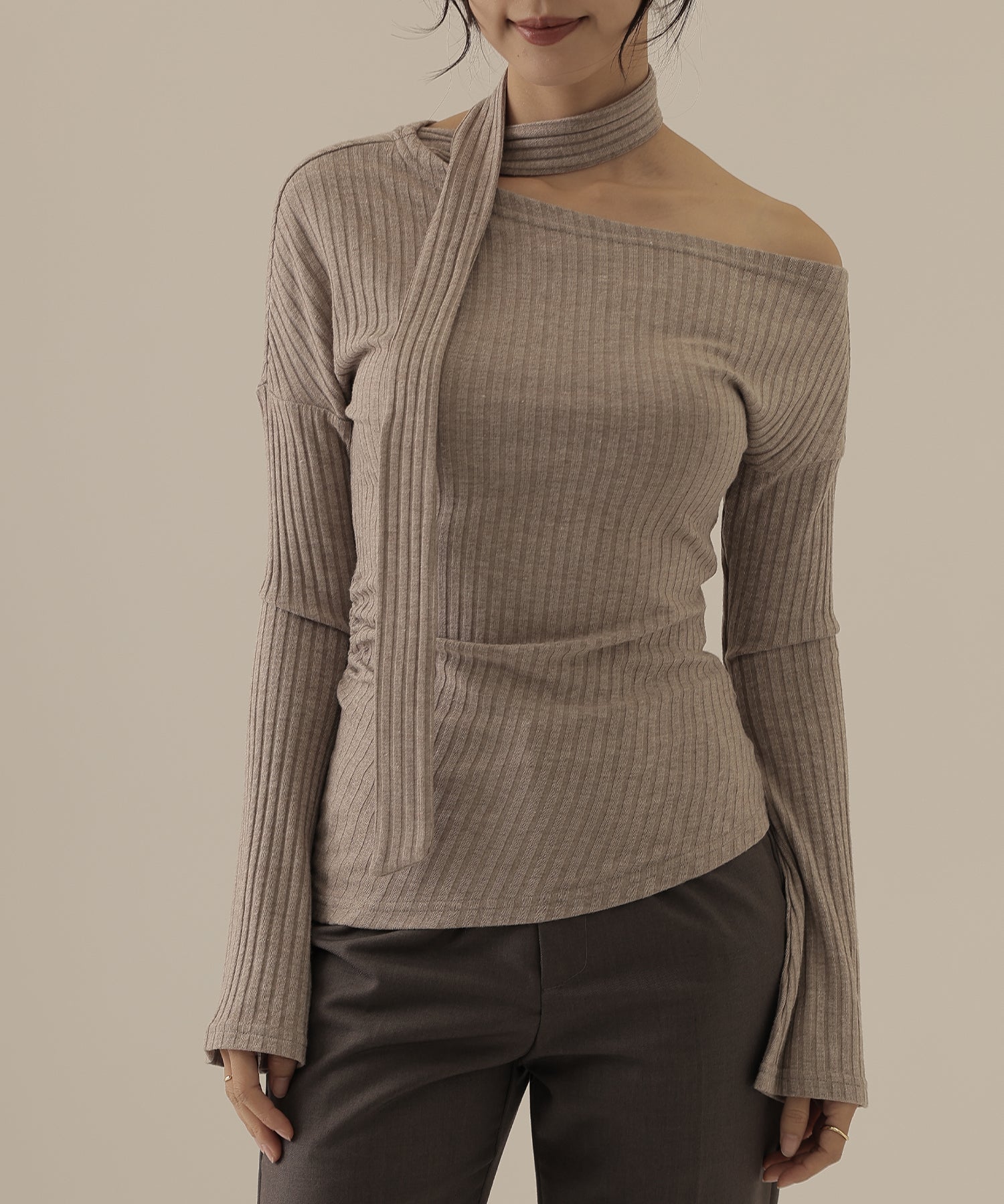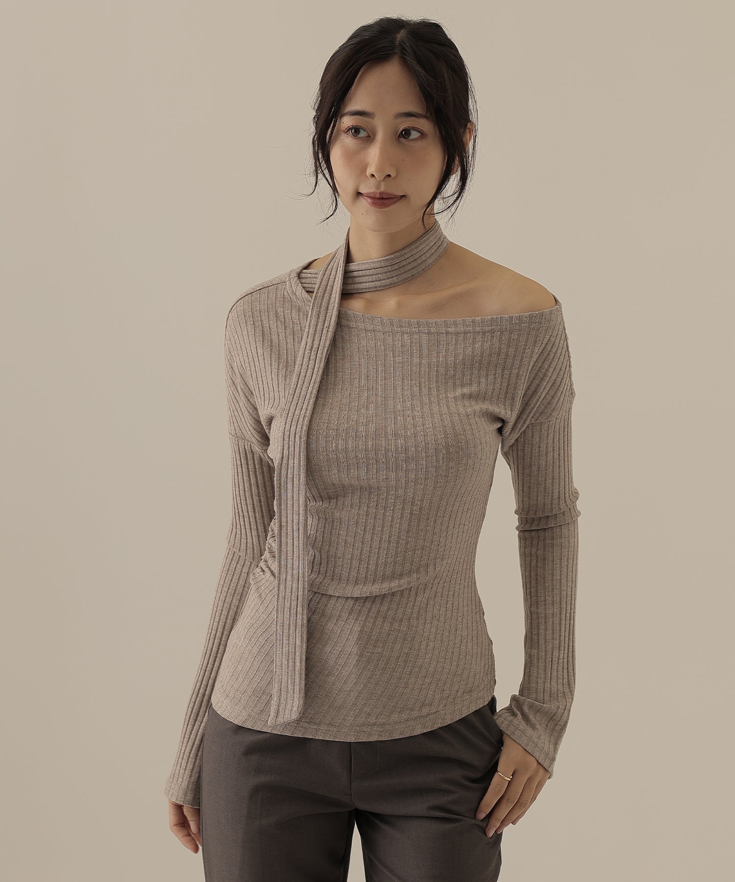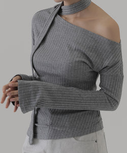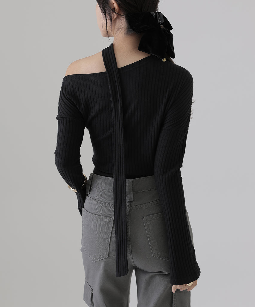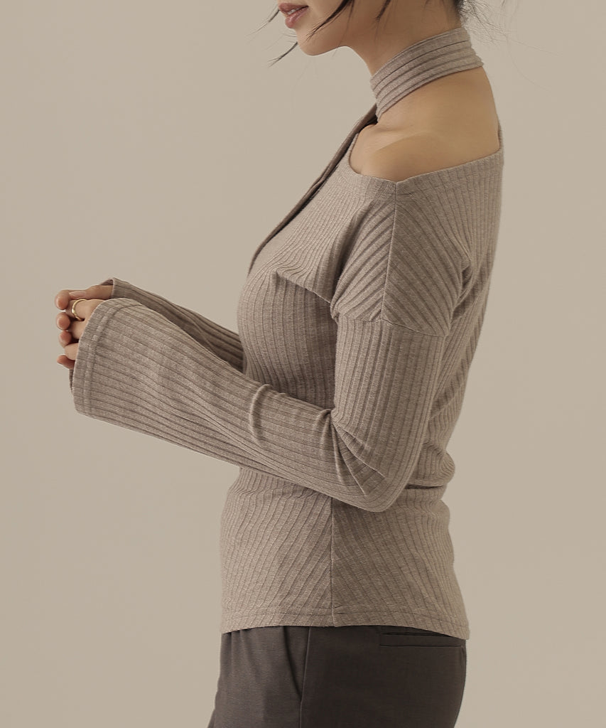 チョーカーリボンを備えたトレンド顔のリブトップス。