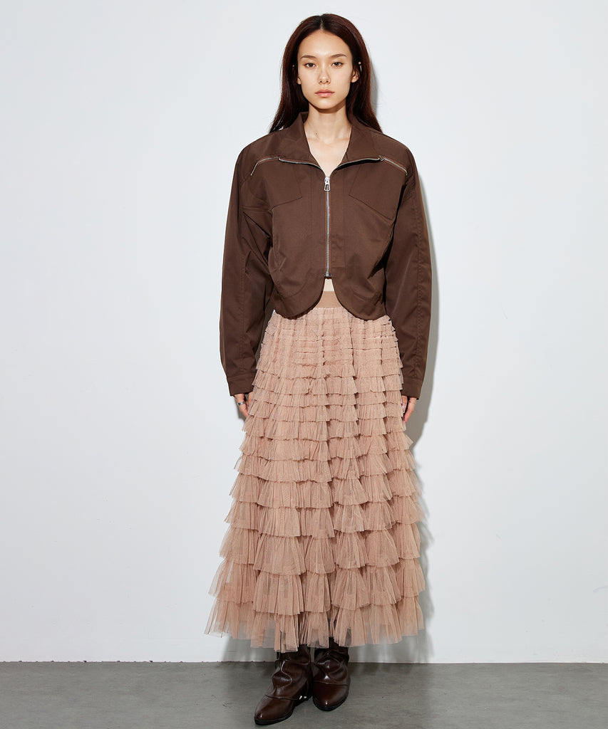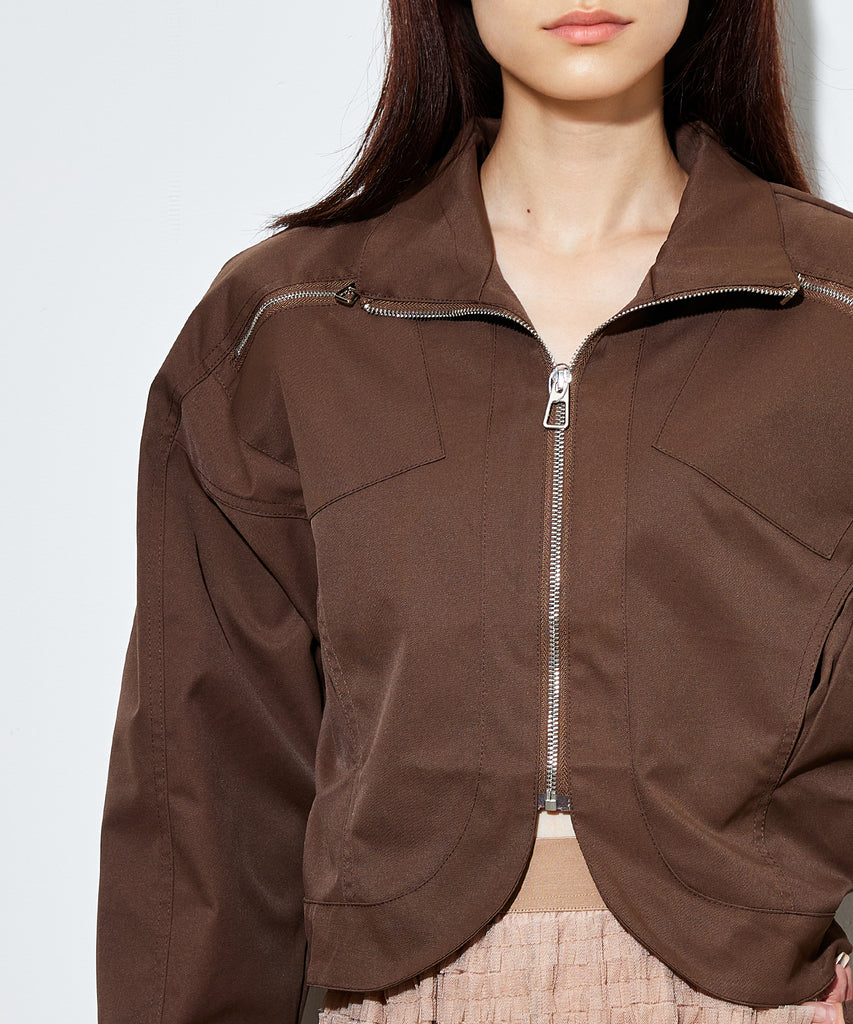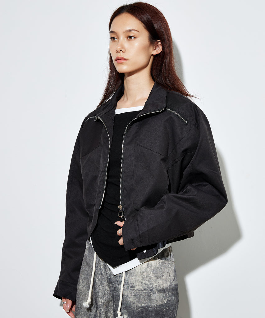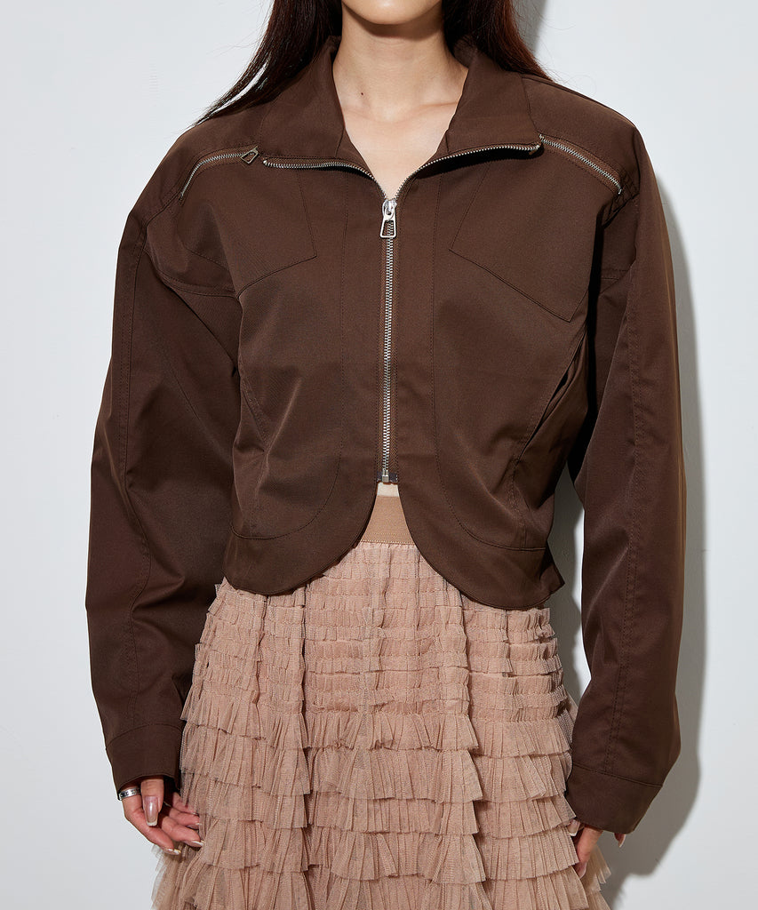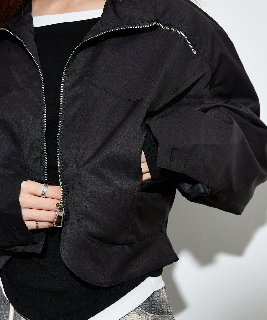 コットンを混紡した春秋兼用で着用できるショート丈のブルゾン。