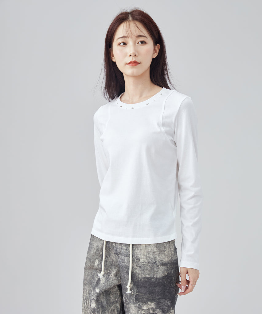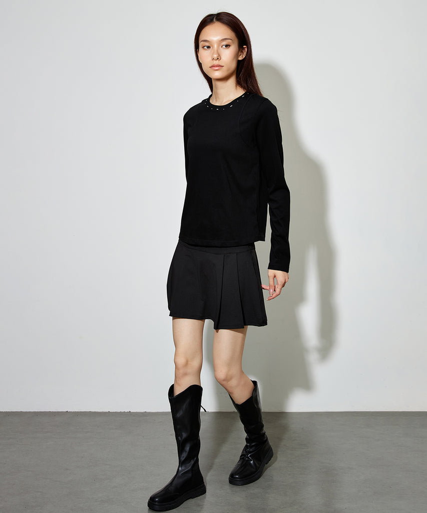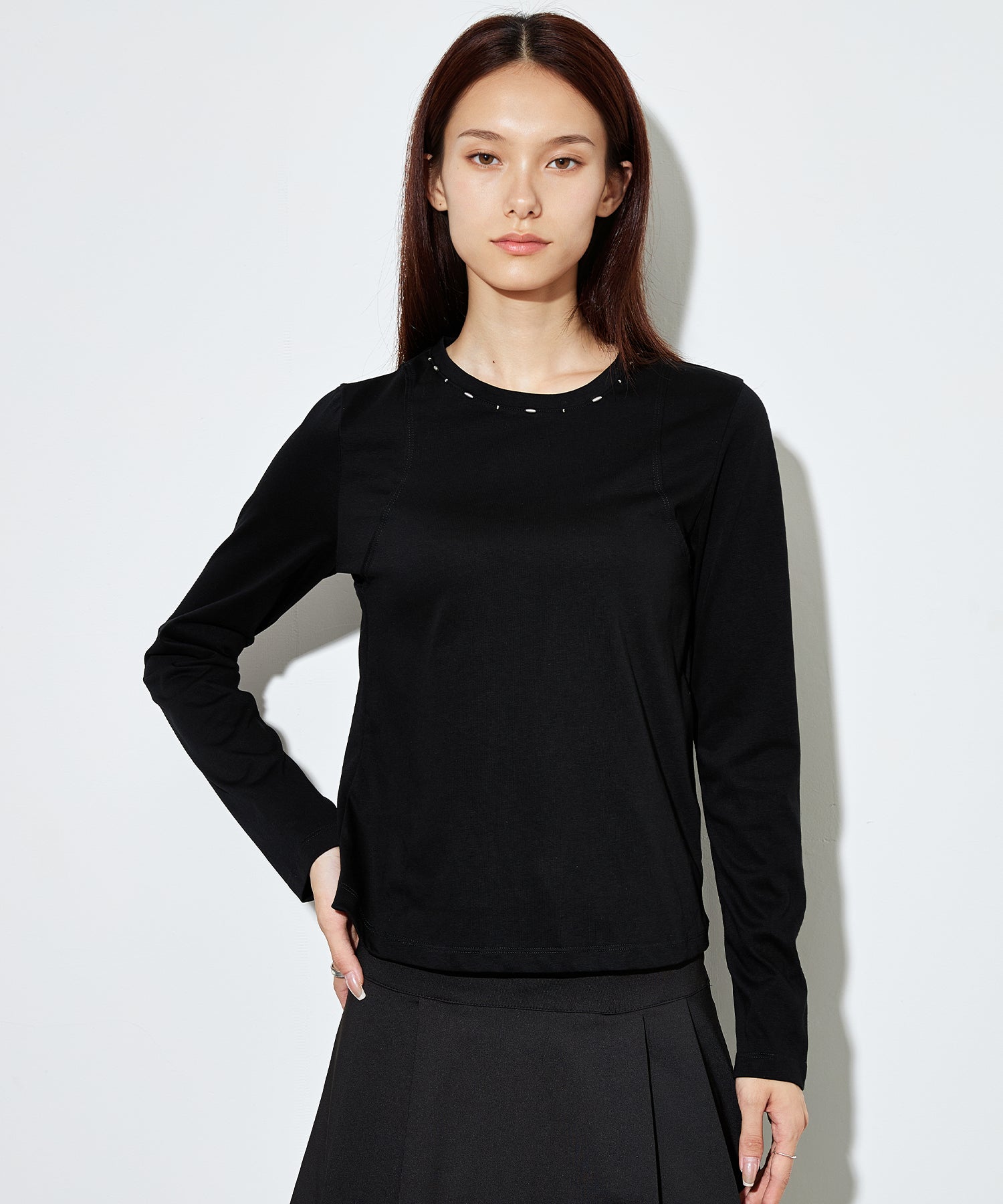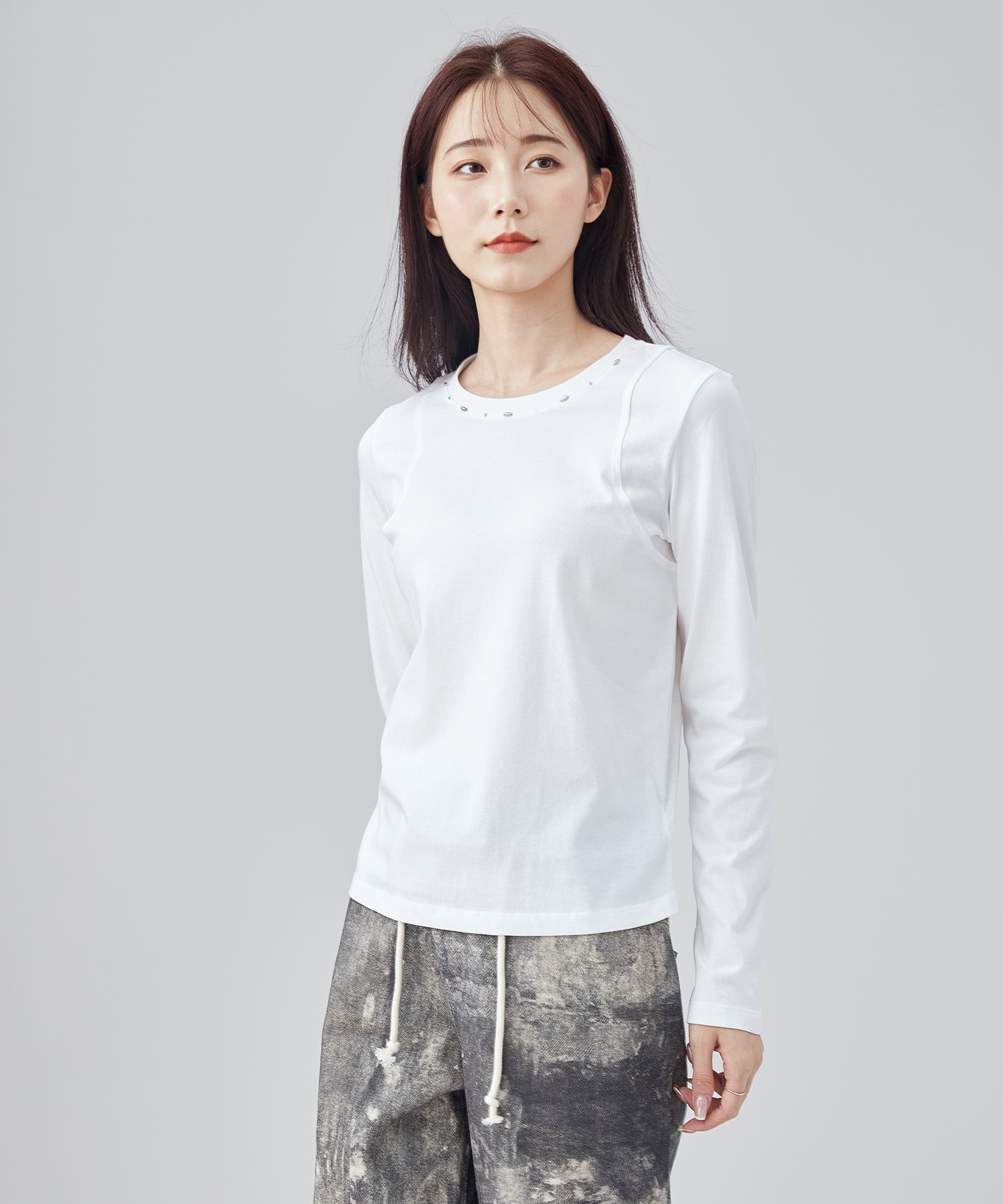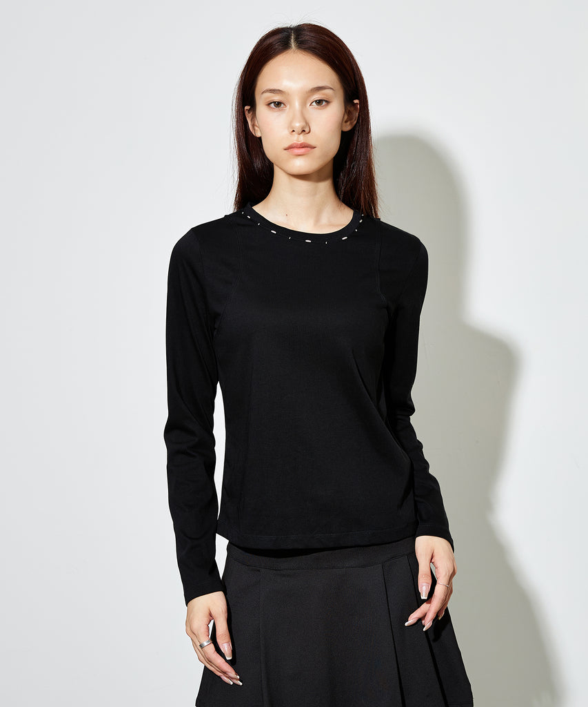 ネックラインにあしらったシルバーパーツがクールな長袖トップス。