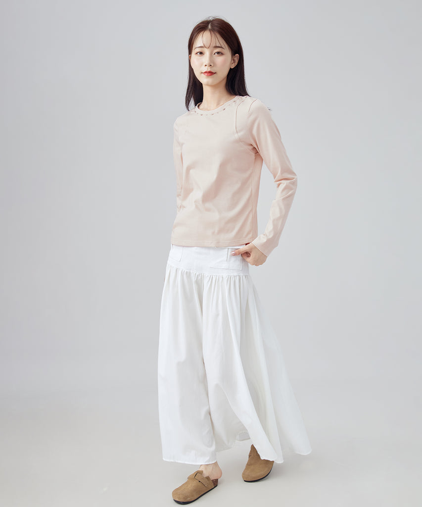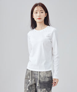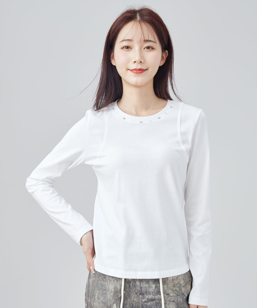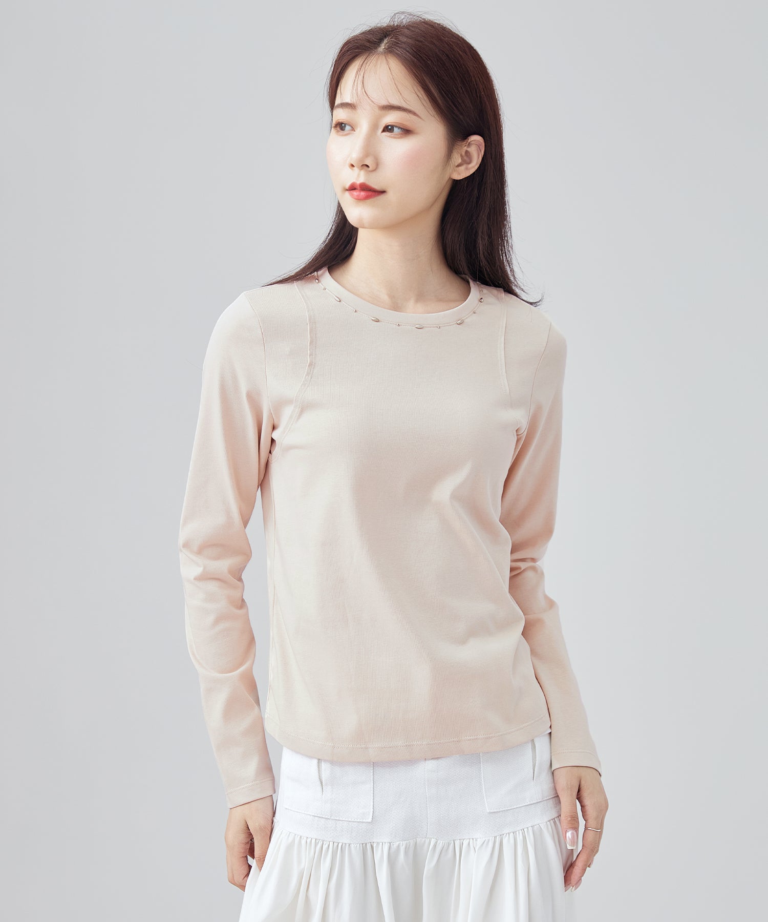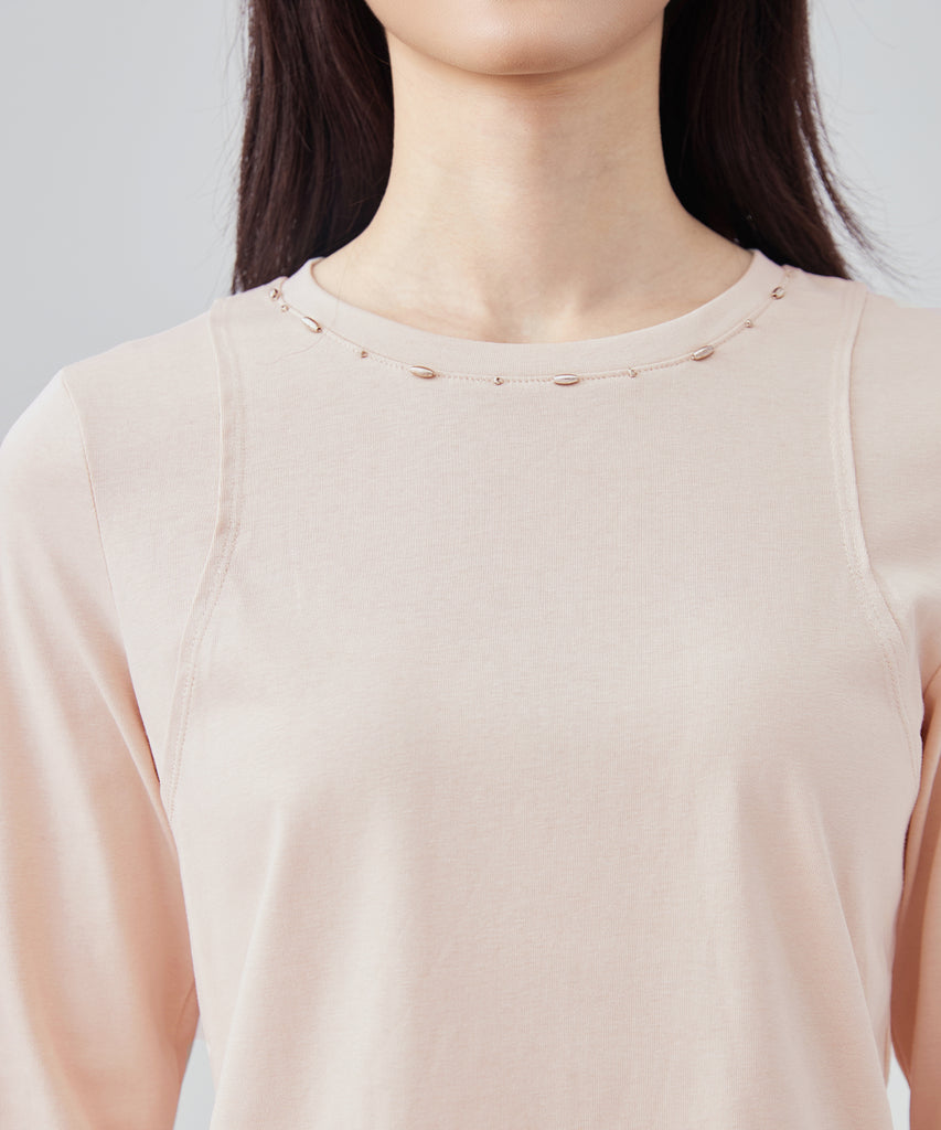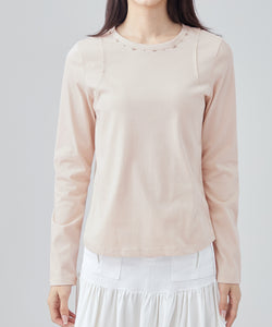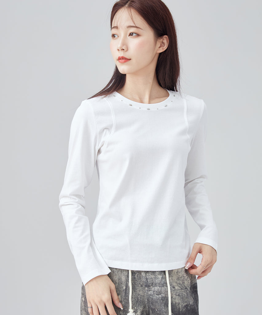 ネックラインにあしらったシルバーパーツがクールな長袖トップス。