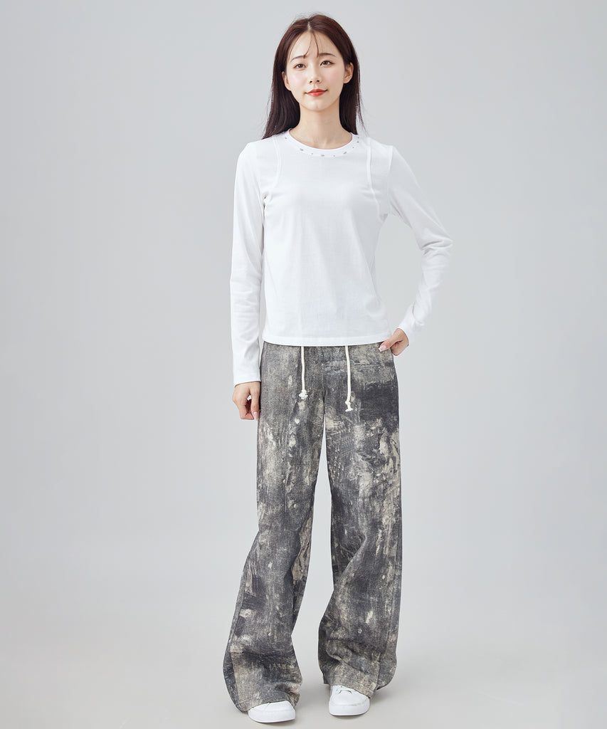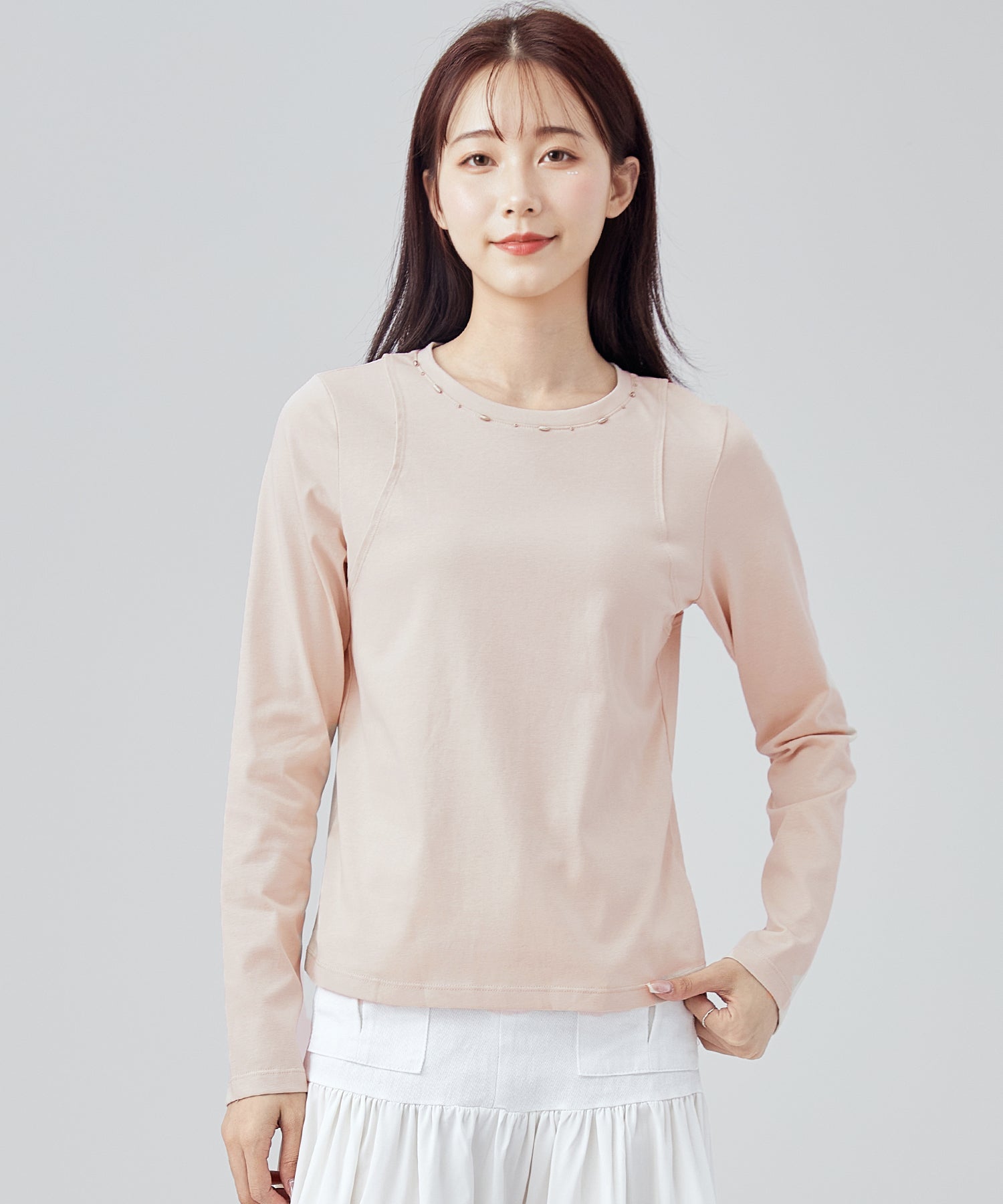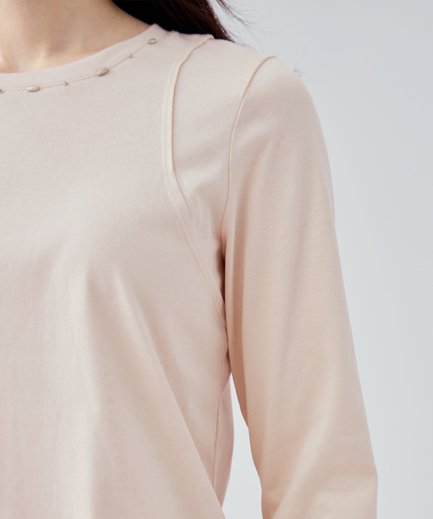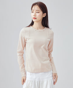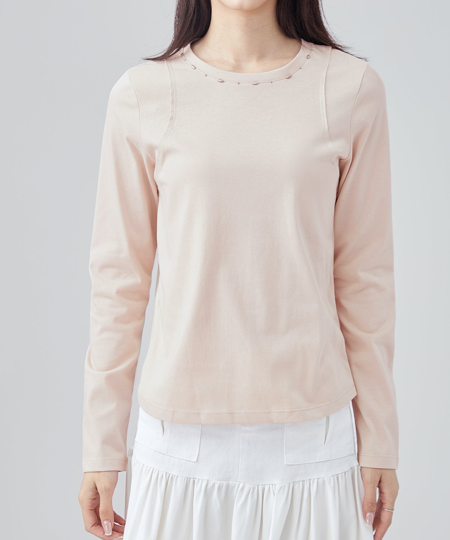 ネックラインにあしらったシルバーパーツがクールな長袖トップス。