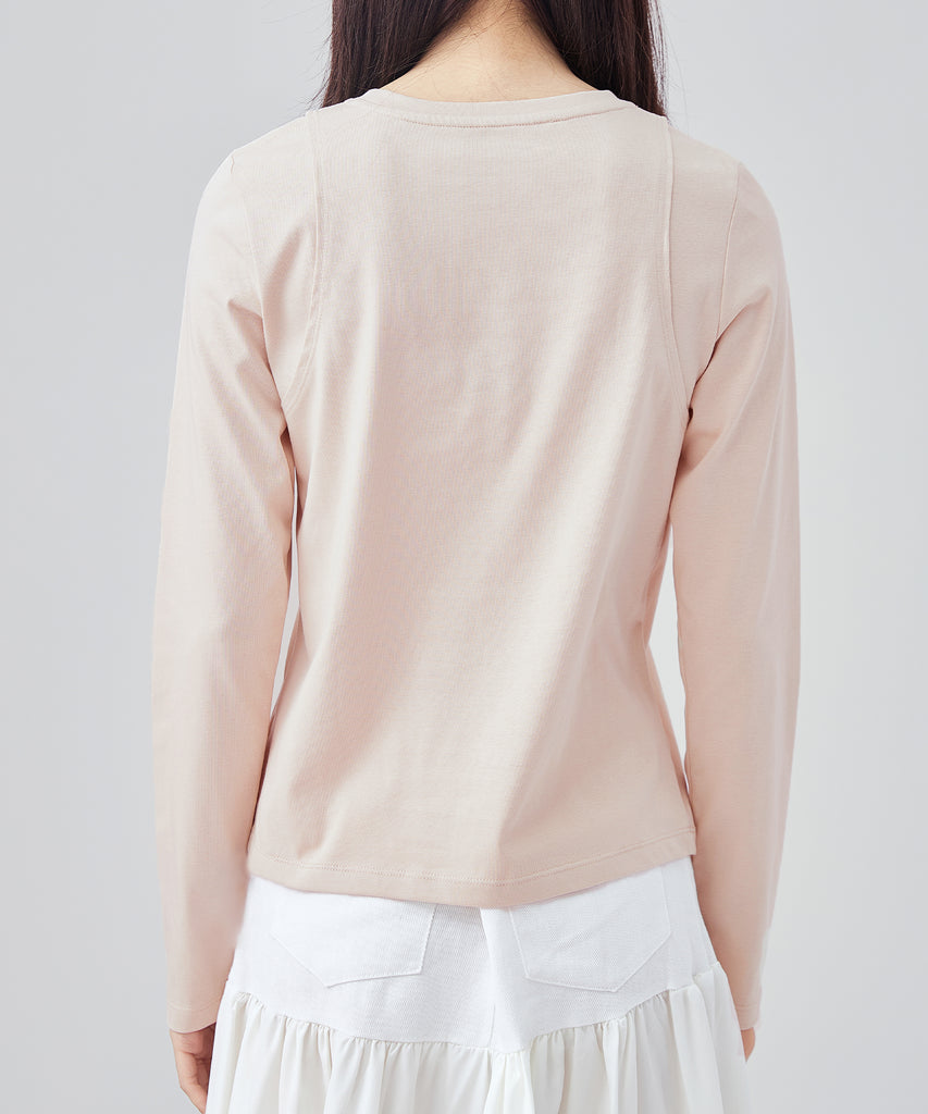 肩線より大きく内側で切り替えたデザインがアクセントになっており、上半身をほっそりと見せてくれる嬉しい効果も。