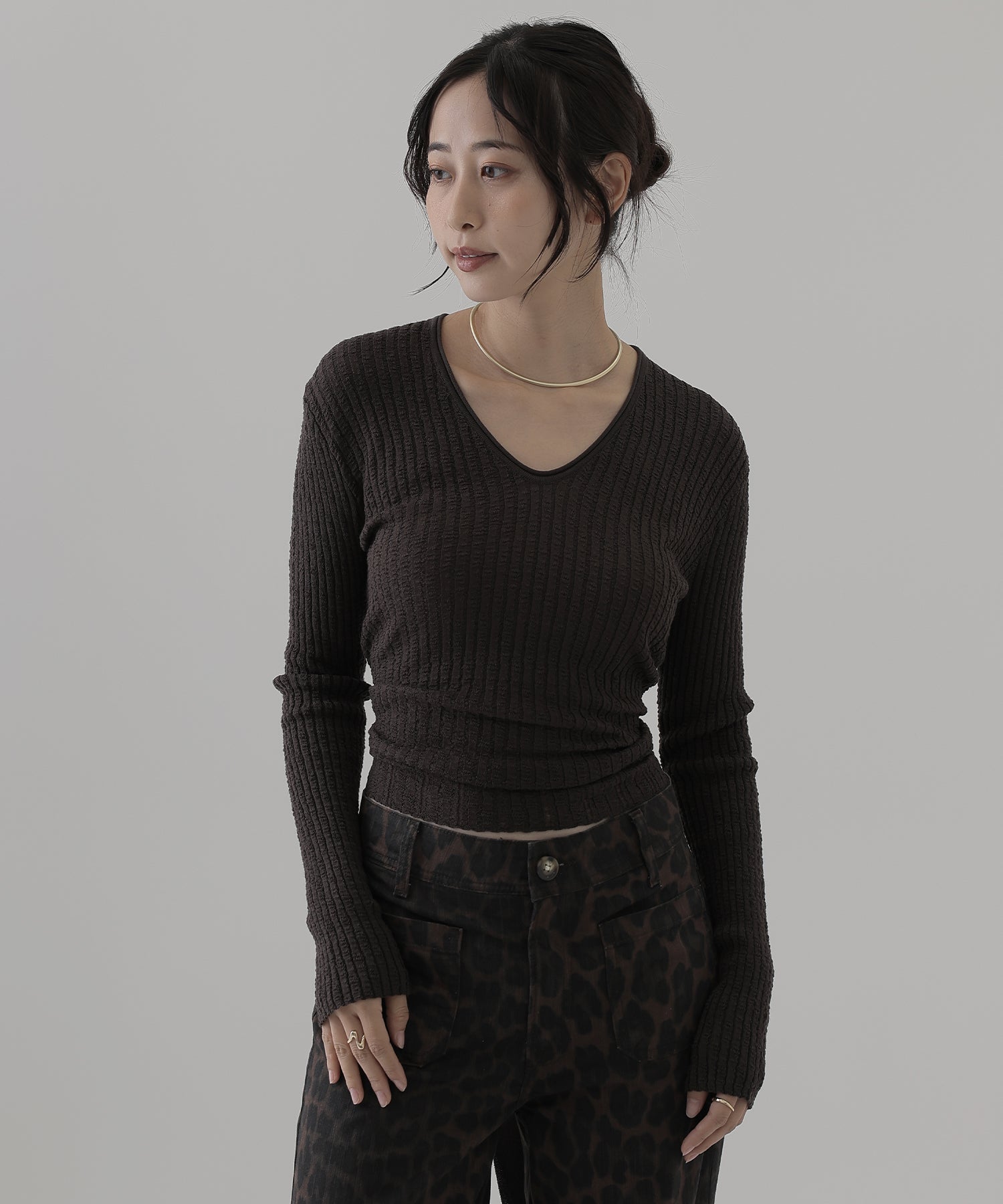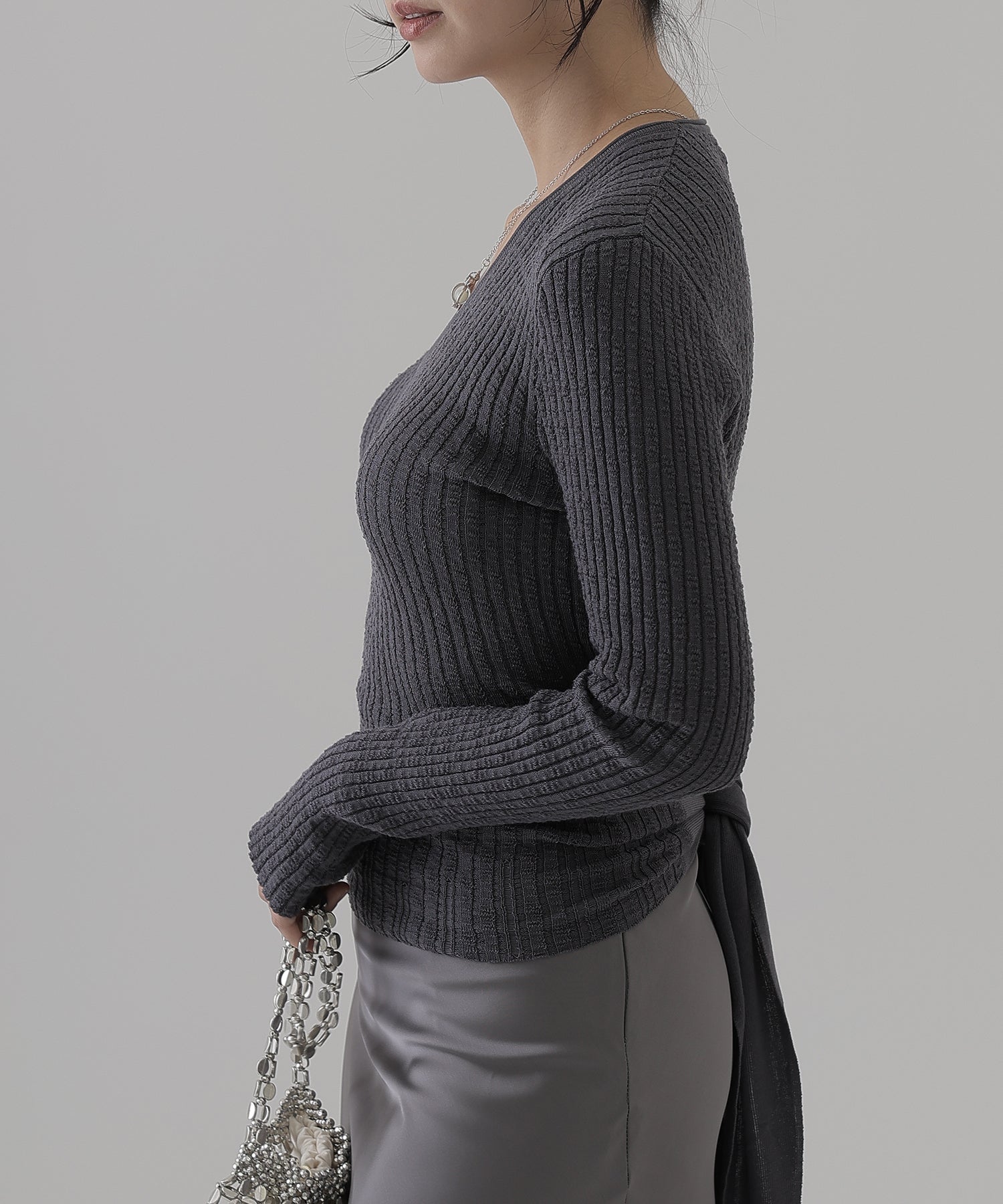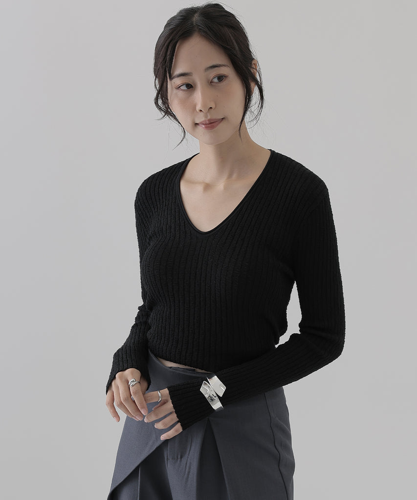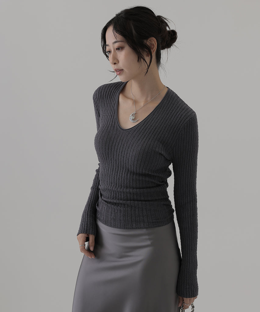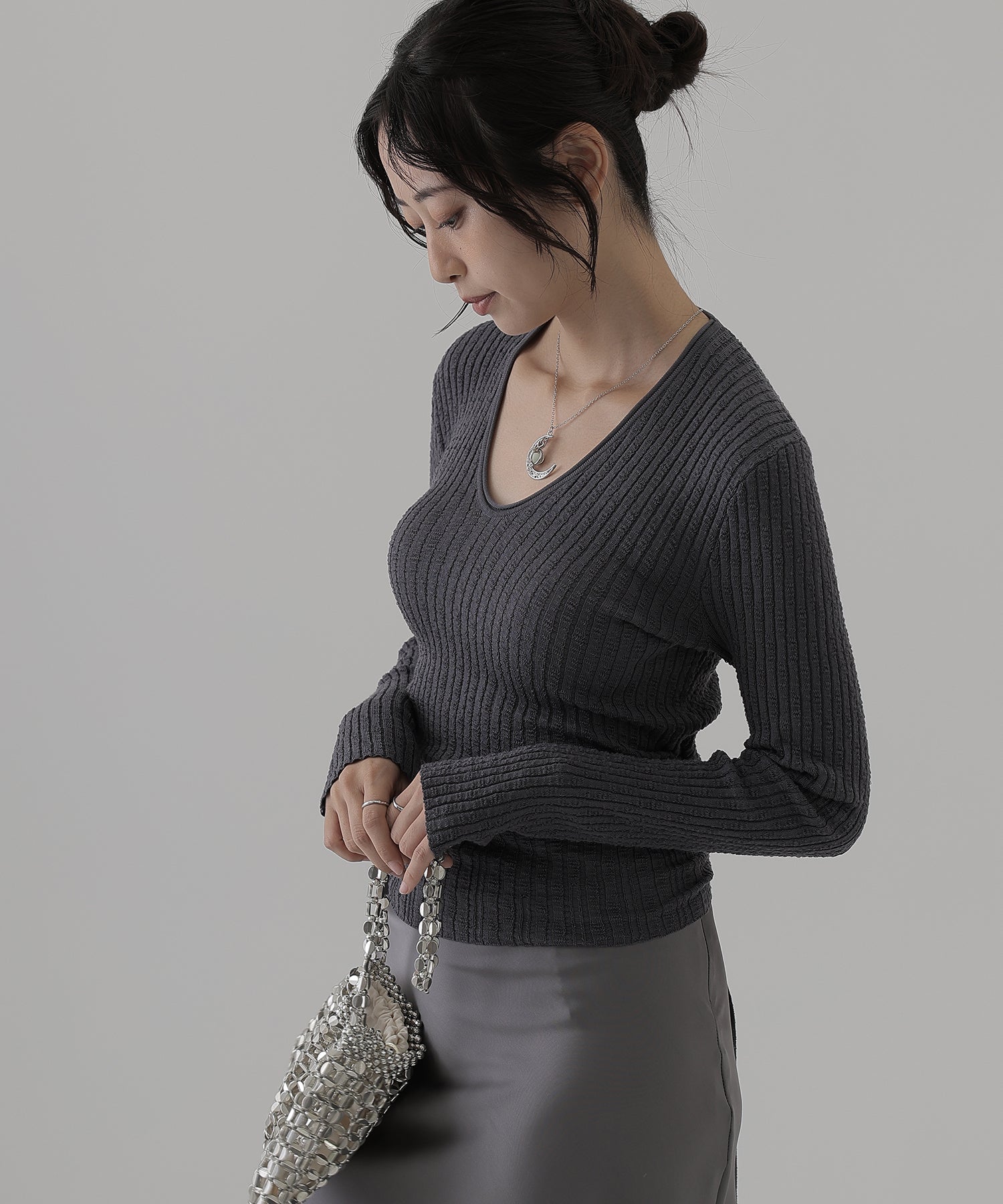 タイトフィットなシルエットと抜け感を演出する深めのUネックでフェミニンな佇まいに。