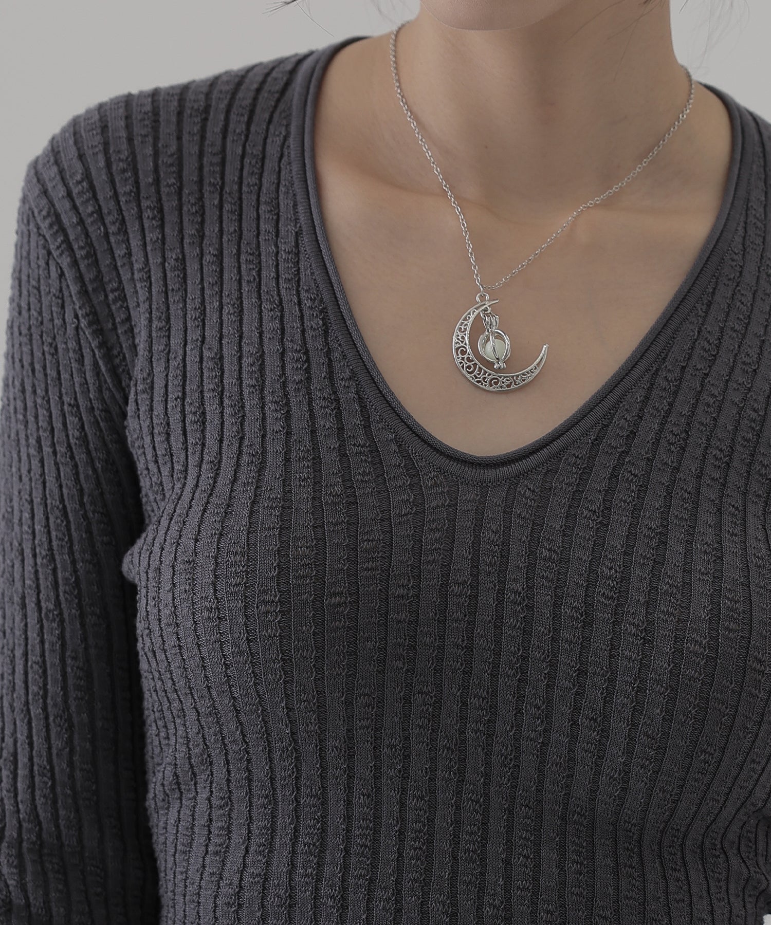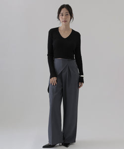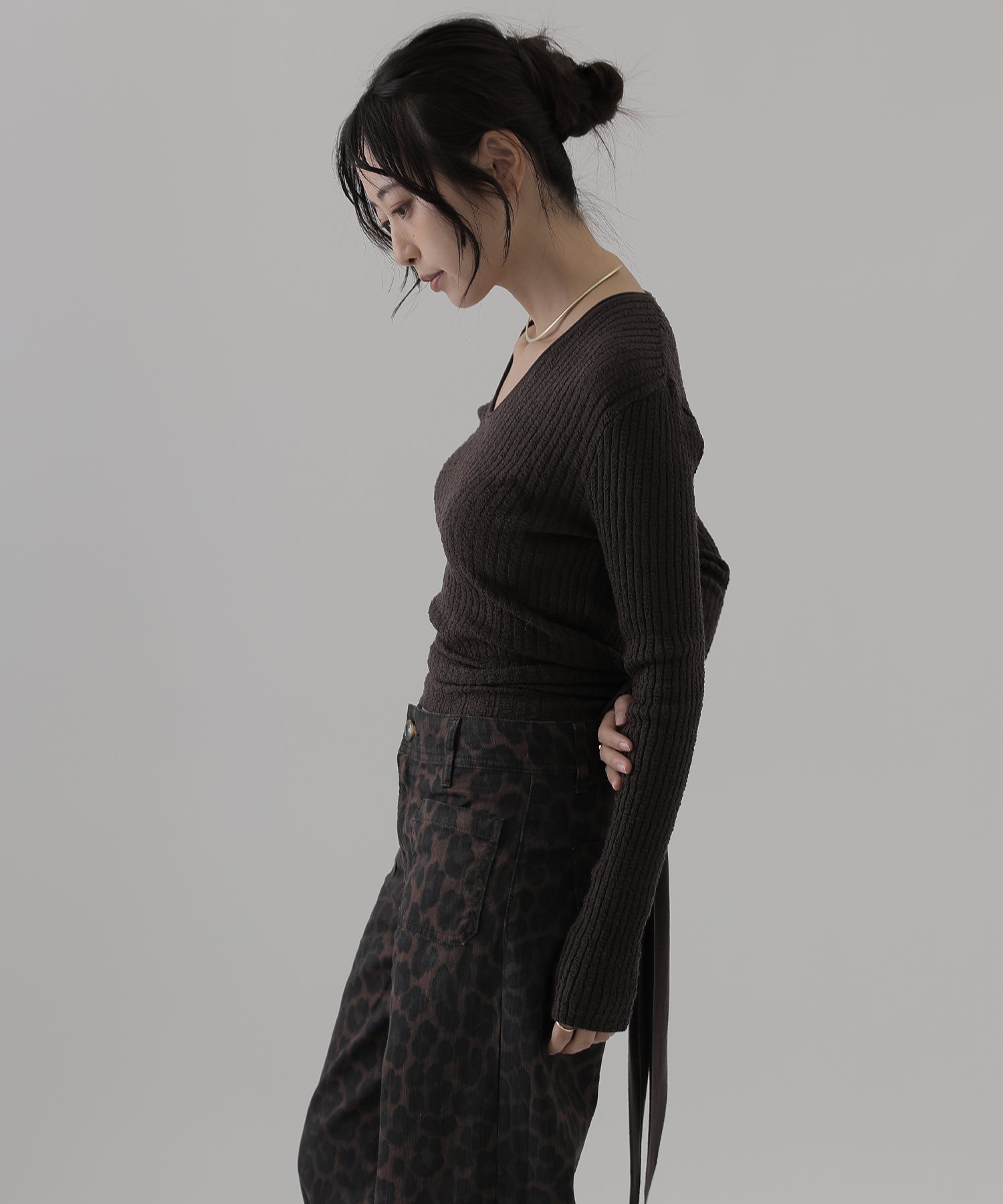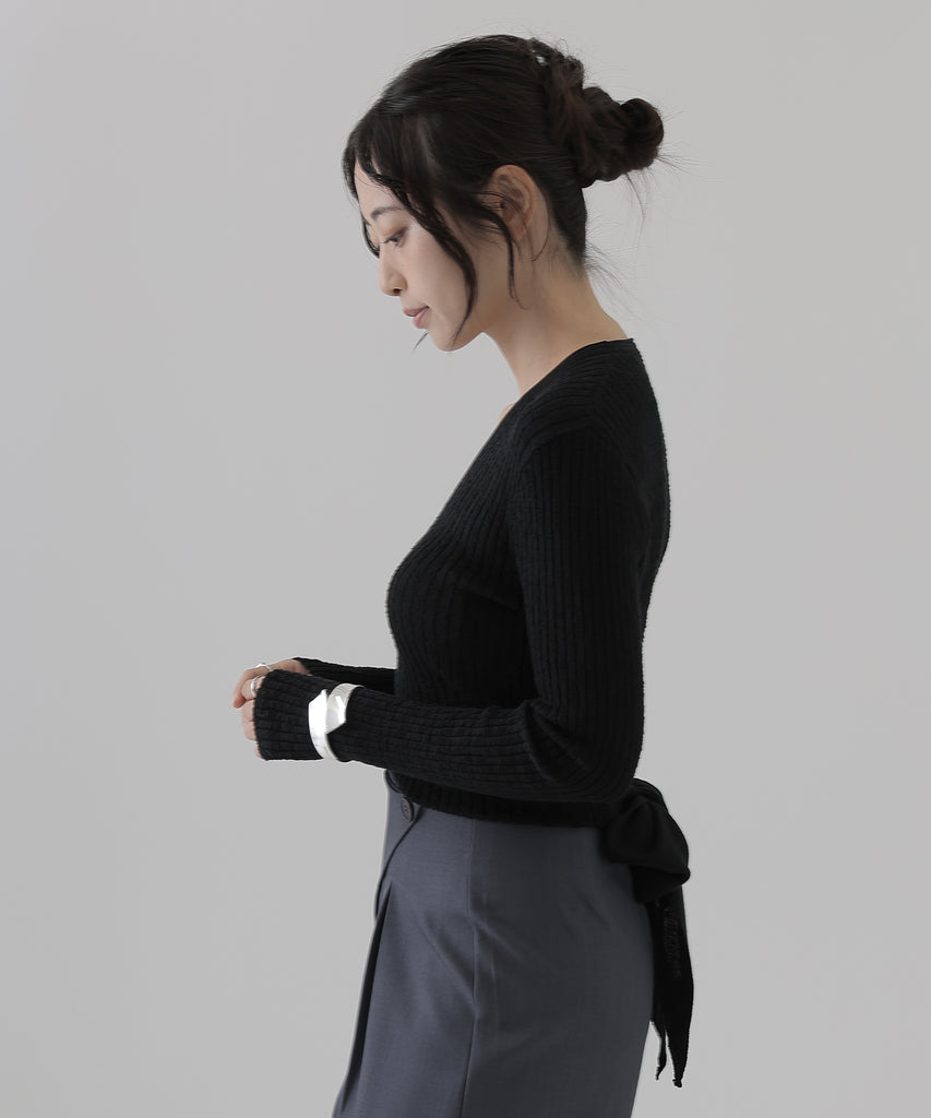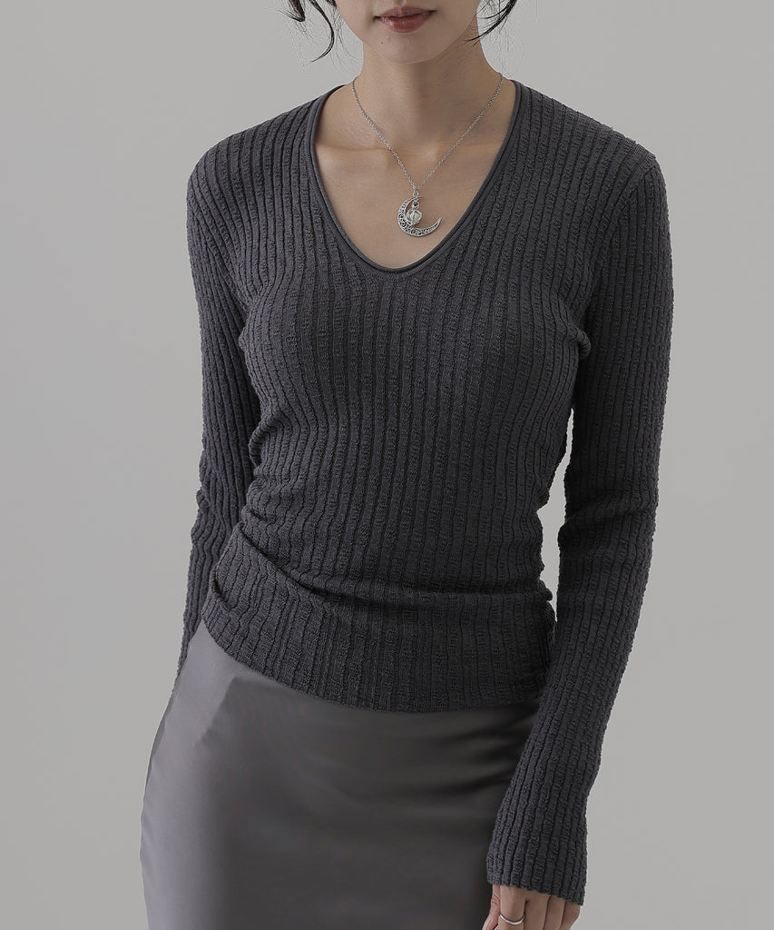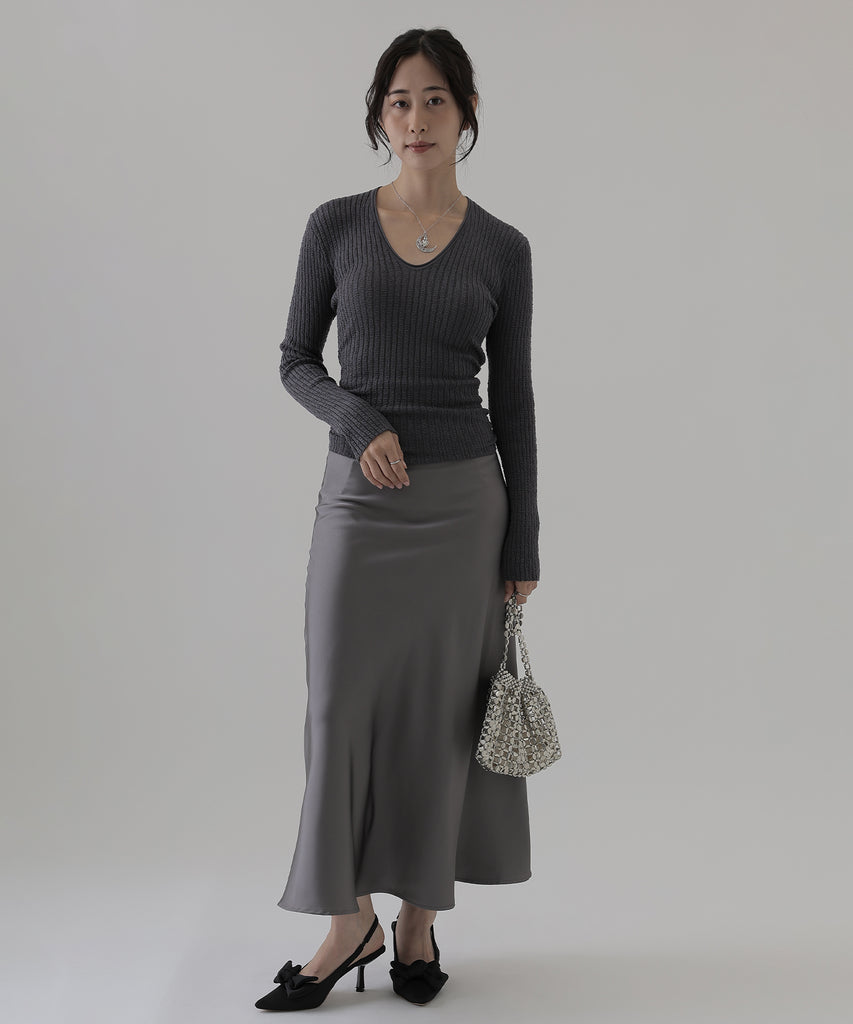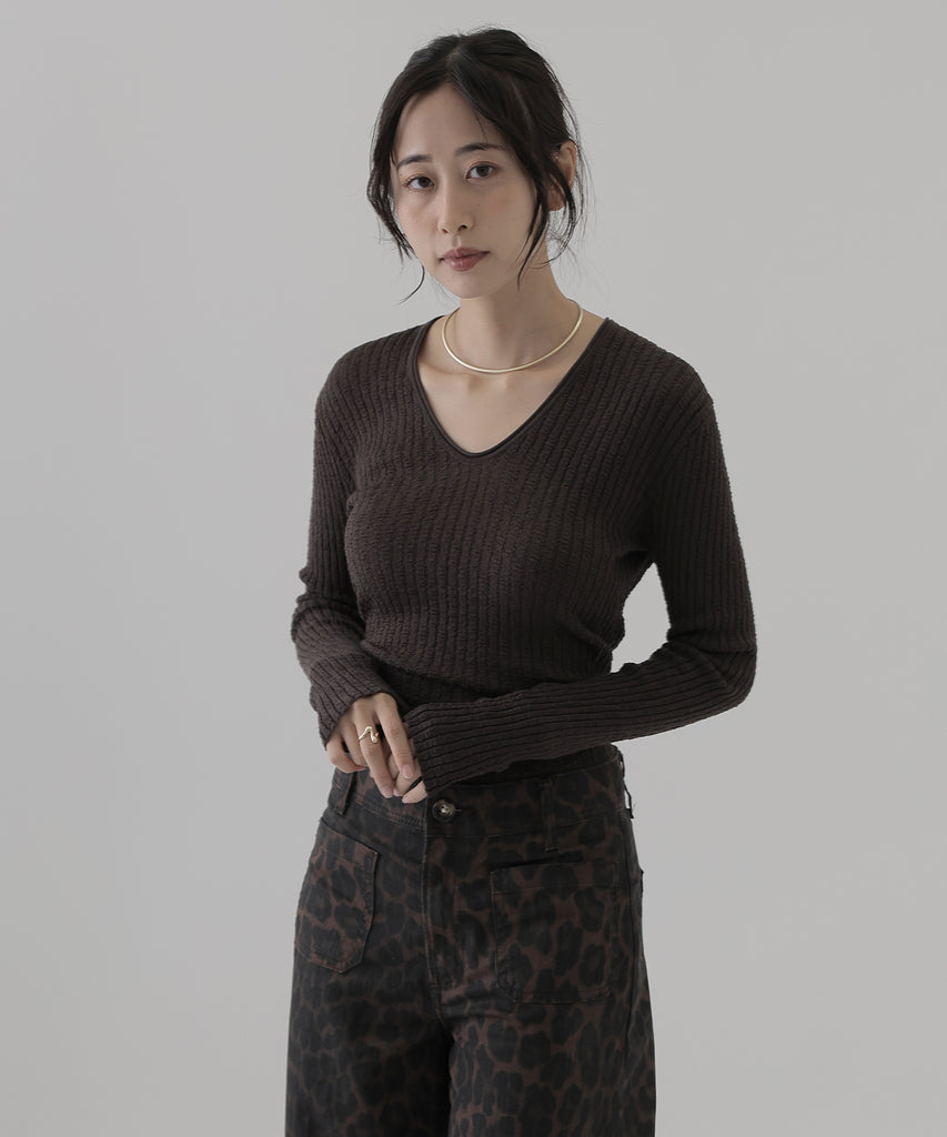 タイトフィットなシルエットと抜け感を演出する深めのUネックでフェミニンな佇まいに。