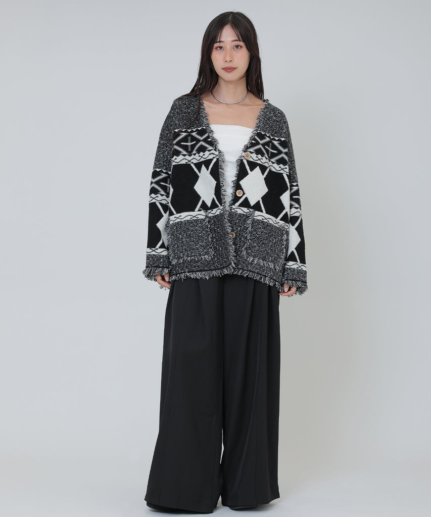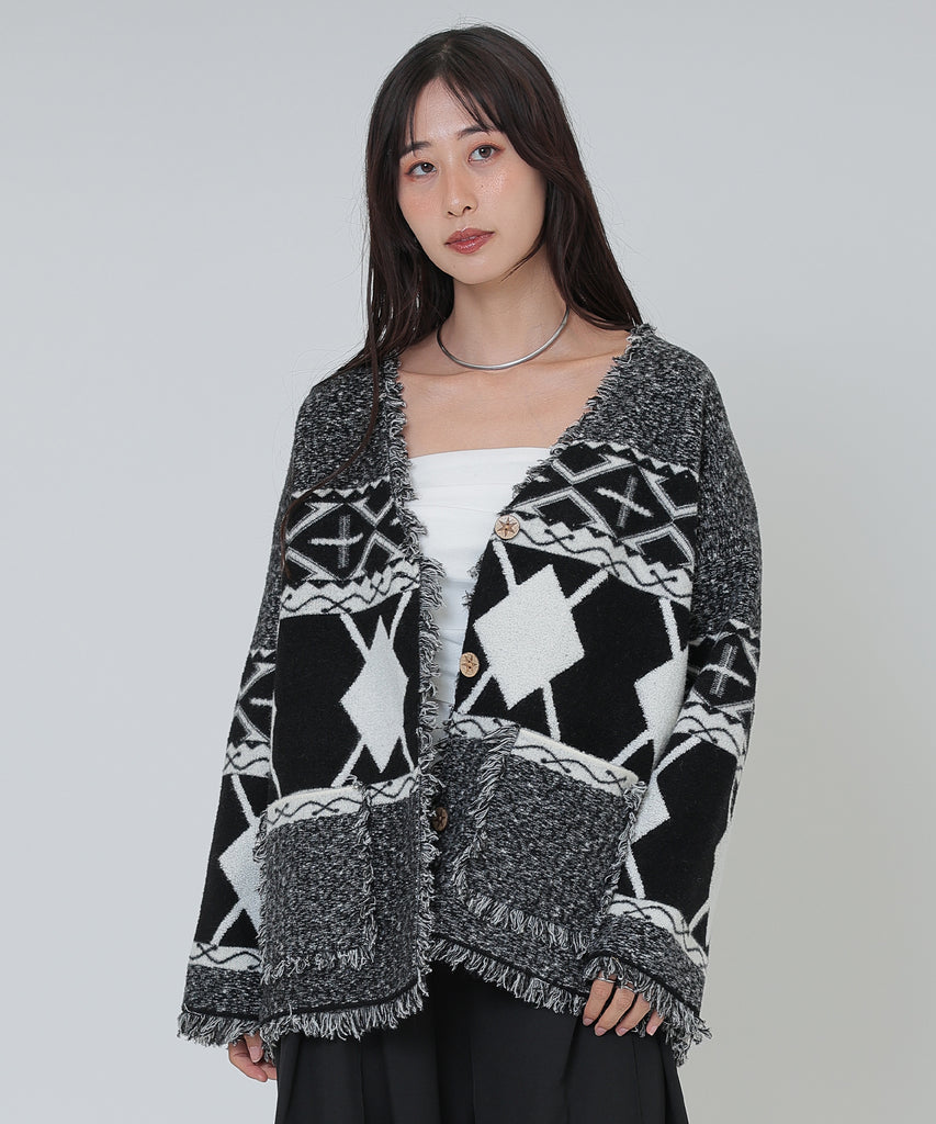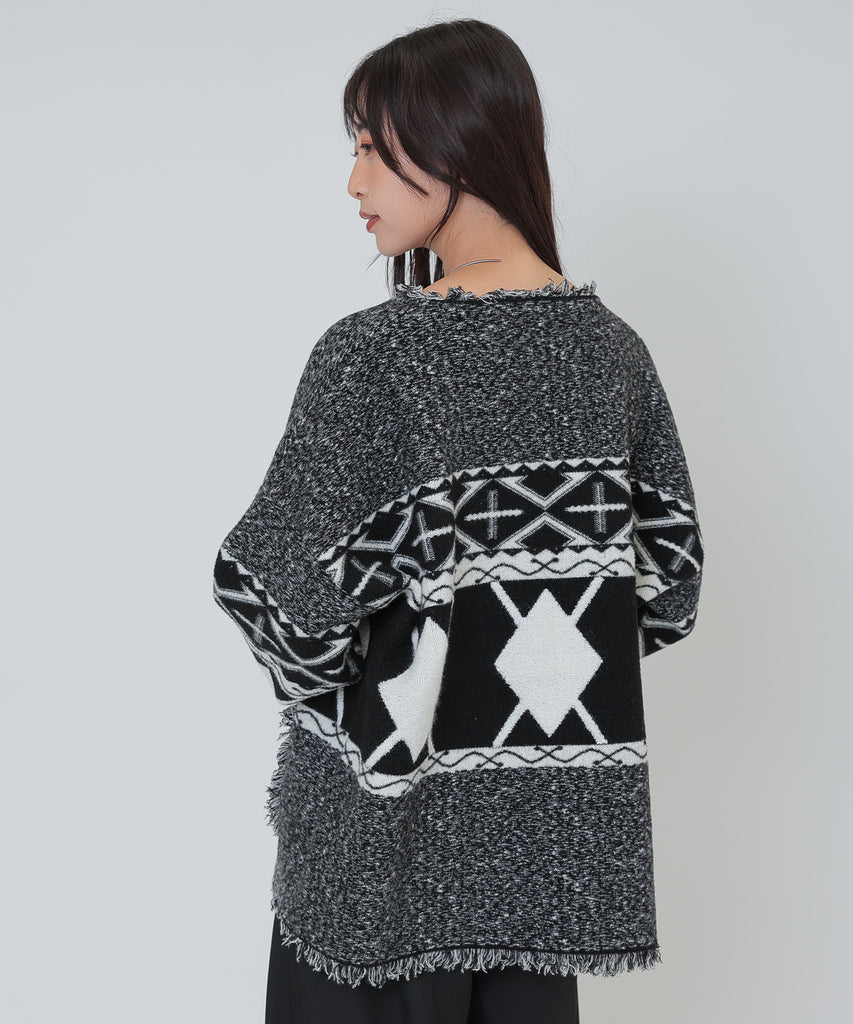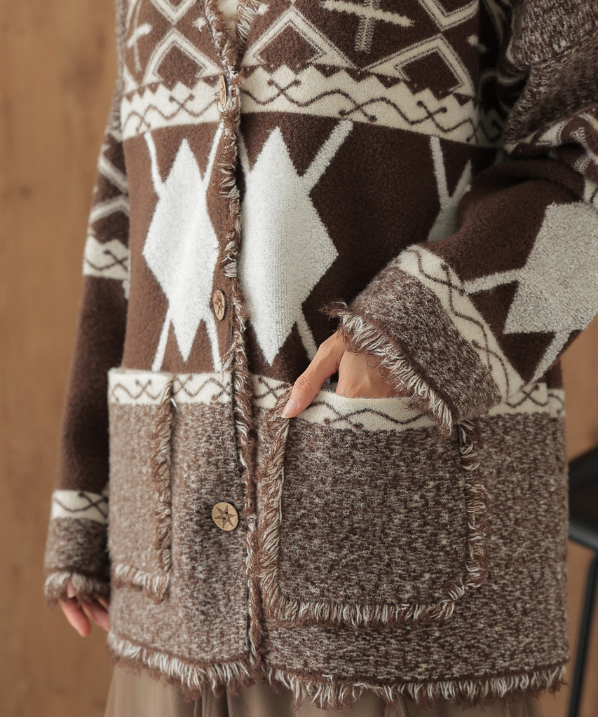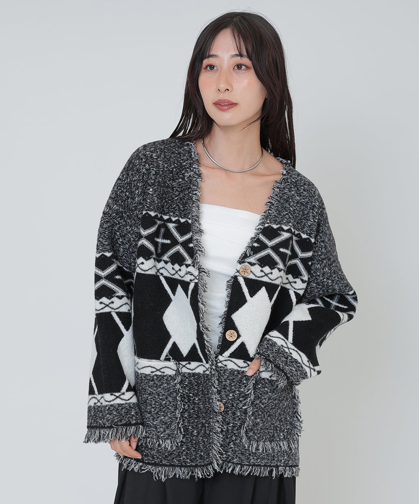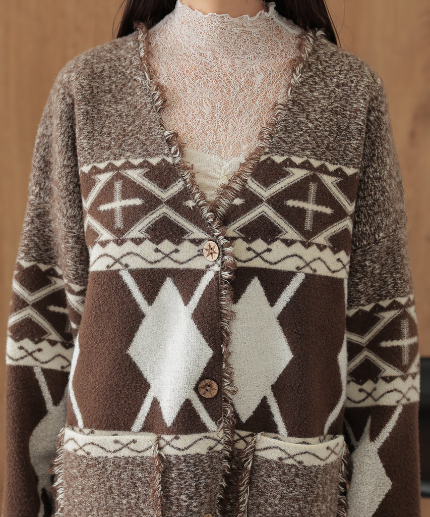 エスニック柄が目を惹くオーバーサイズのニットカーディガン。
