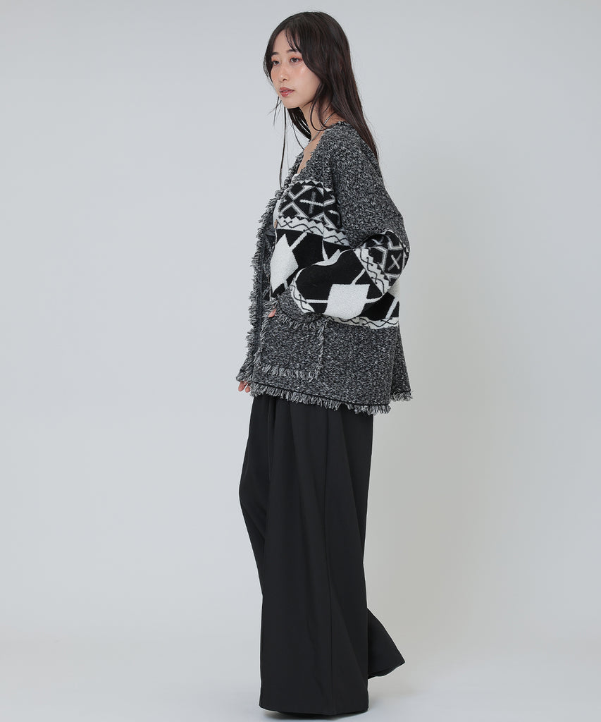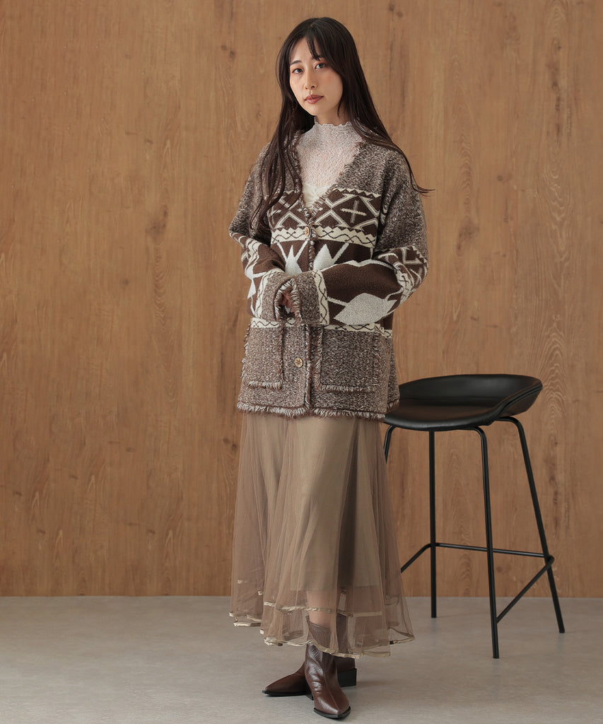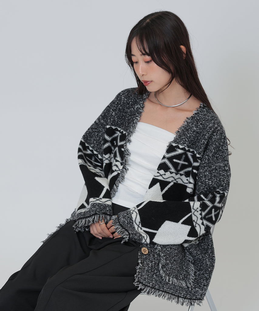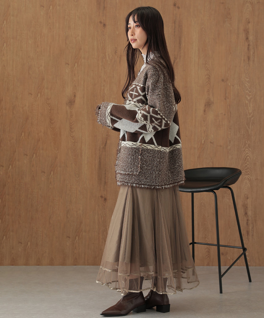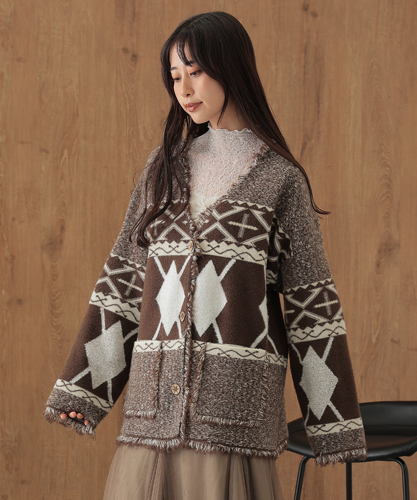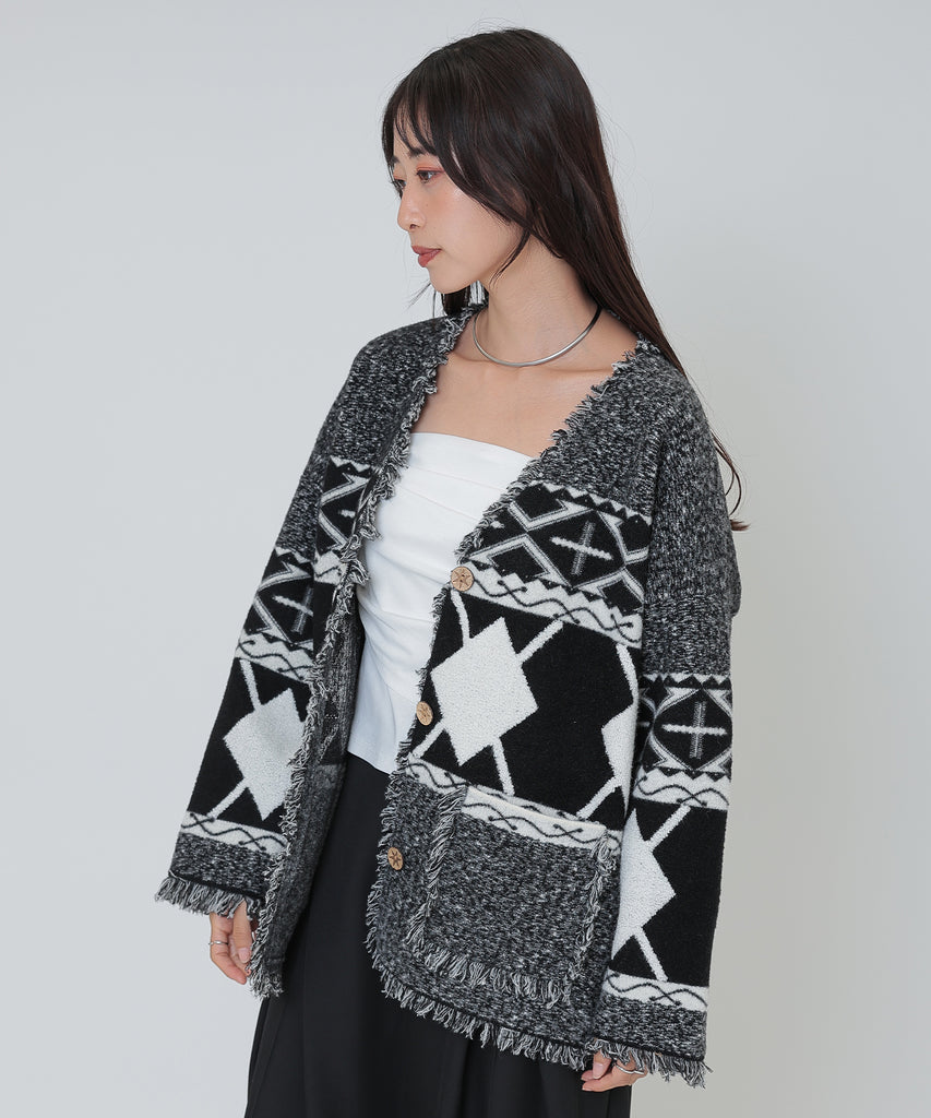 エスニック柄が目を惹くオーバーサイズのニットカーディガン。