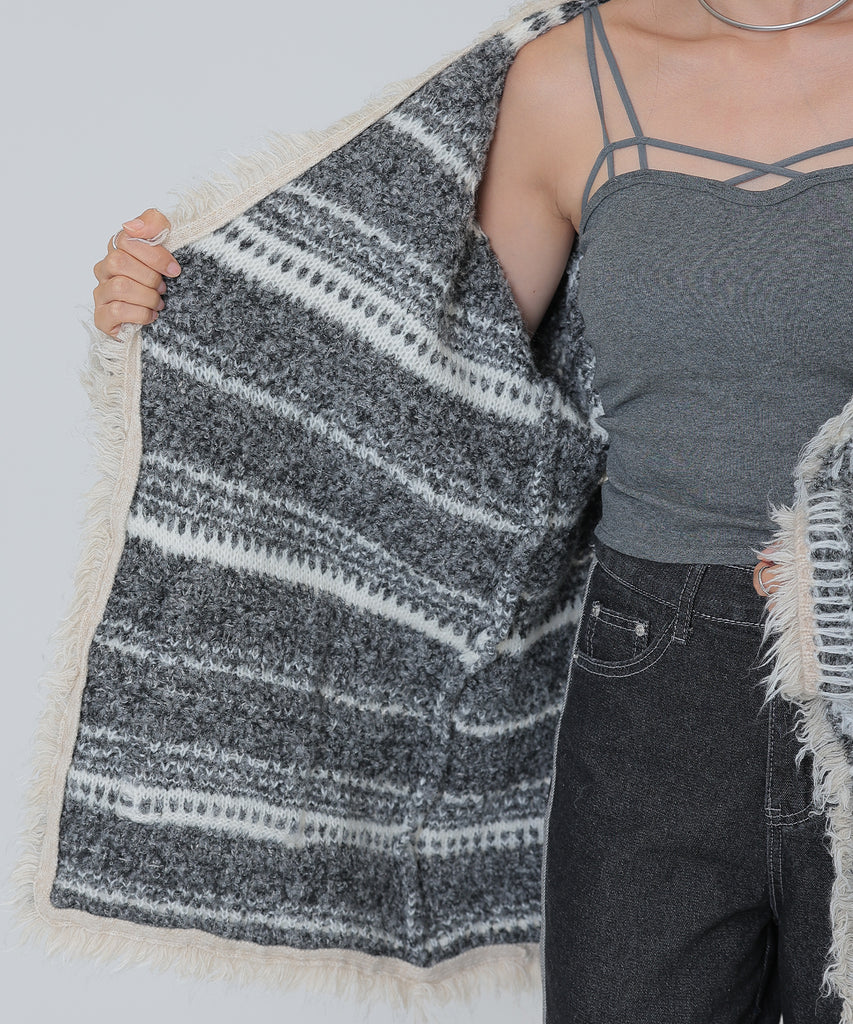クルクルと巻いたニットの風合いにフリンジが加わることで、見た目にもウォーミィーなデザインに仕上がっています。
