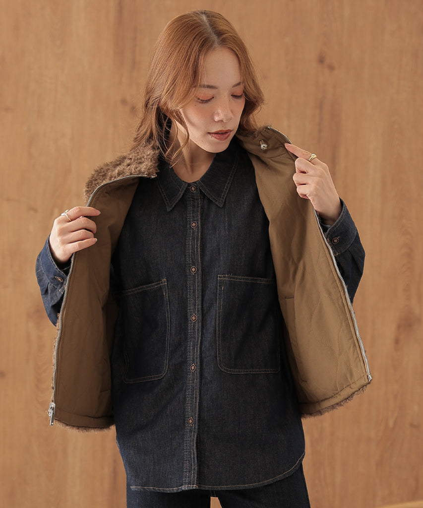 表はコットン素材、裏はボアを採用した秋冬のおでかけにぴったりの暖かいアウターです。