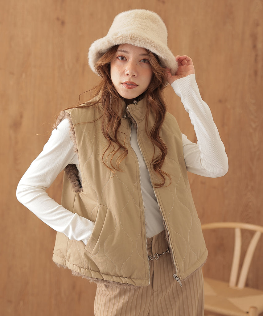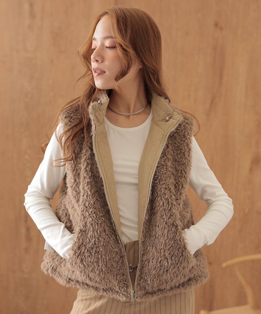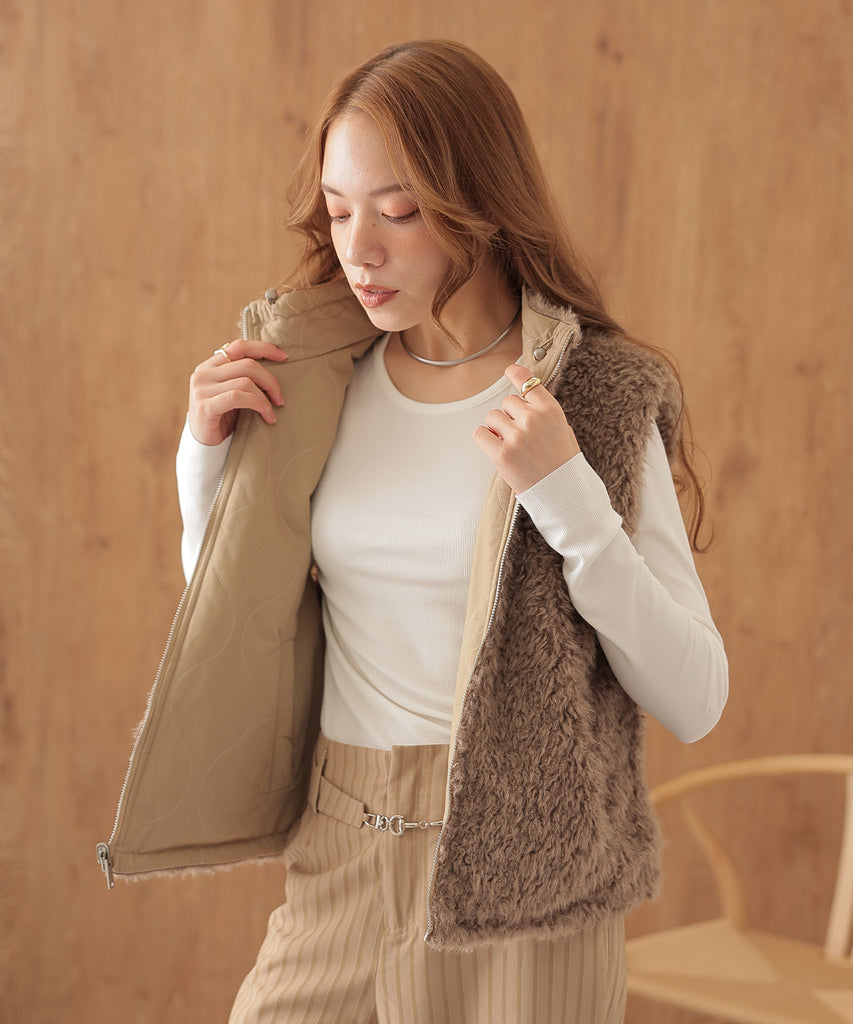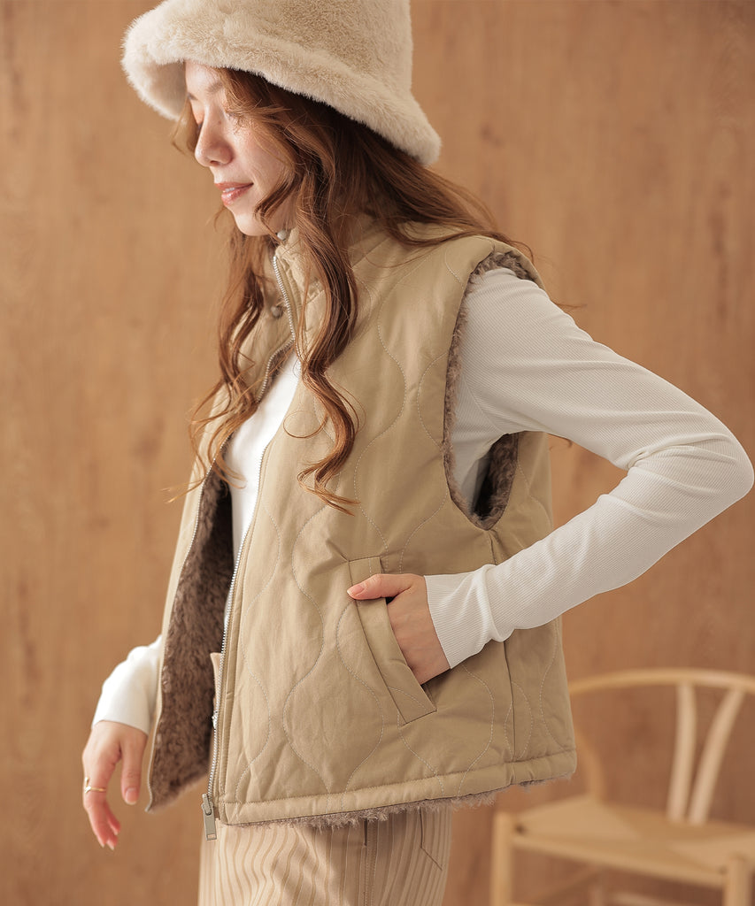 どちらを表にしても着用できる2way仕様のジップアップベスト。