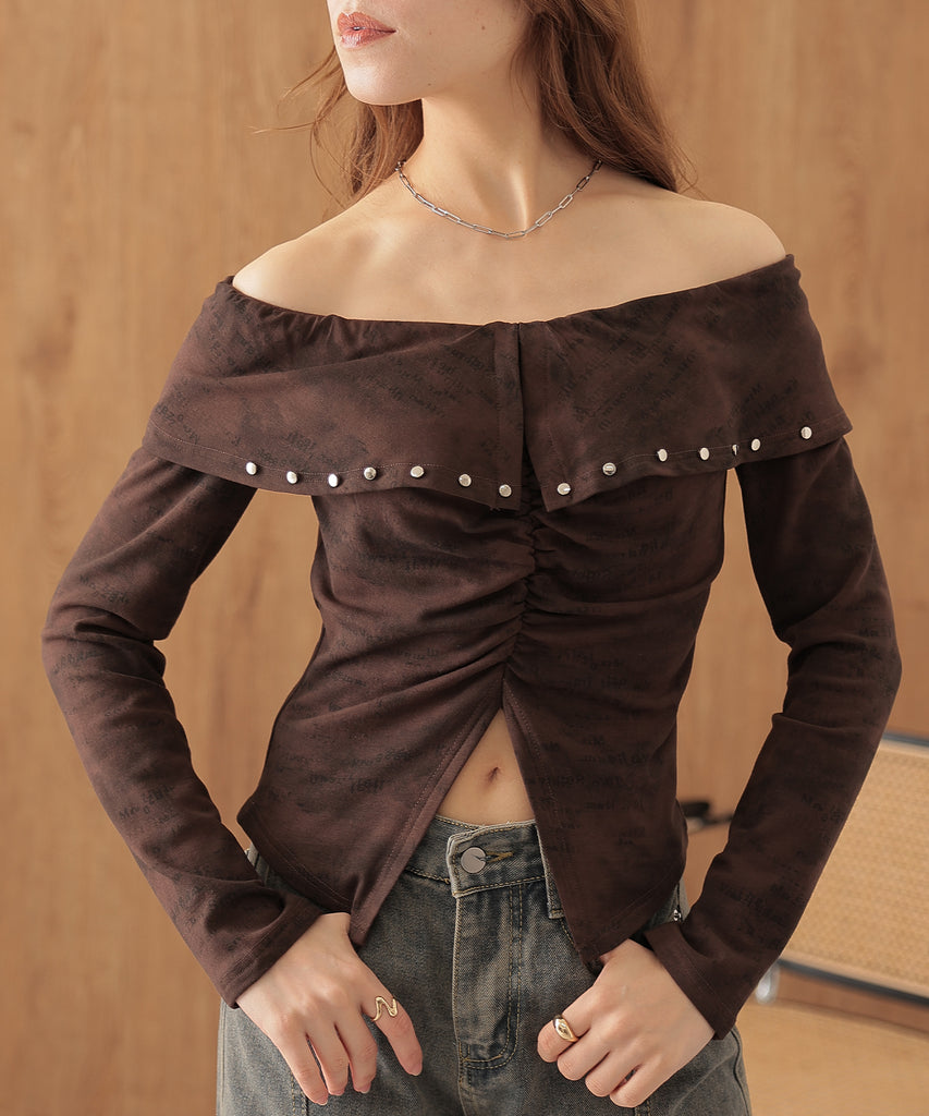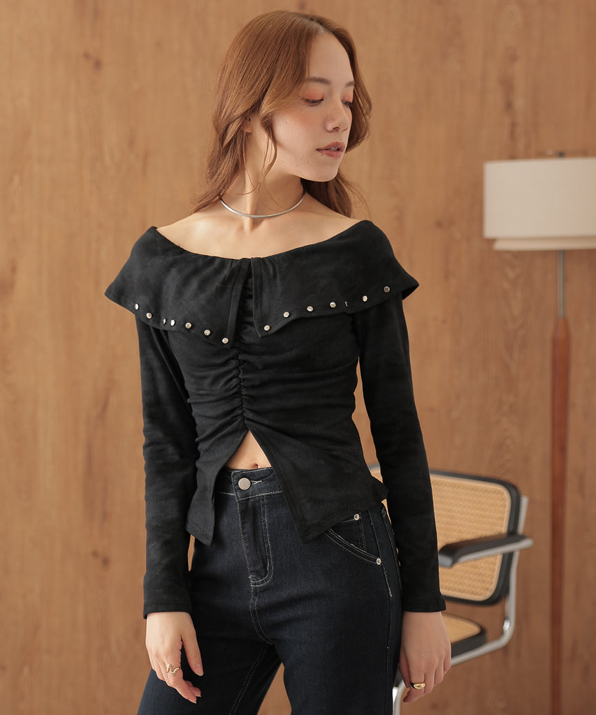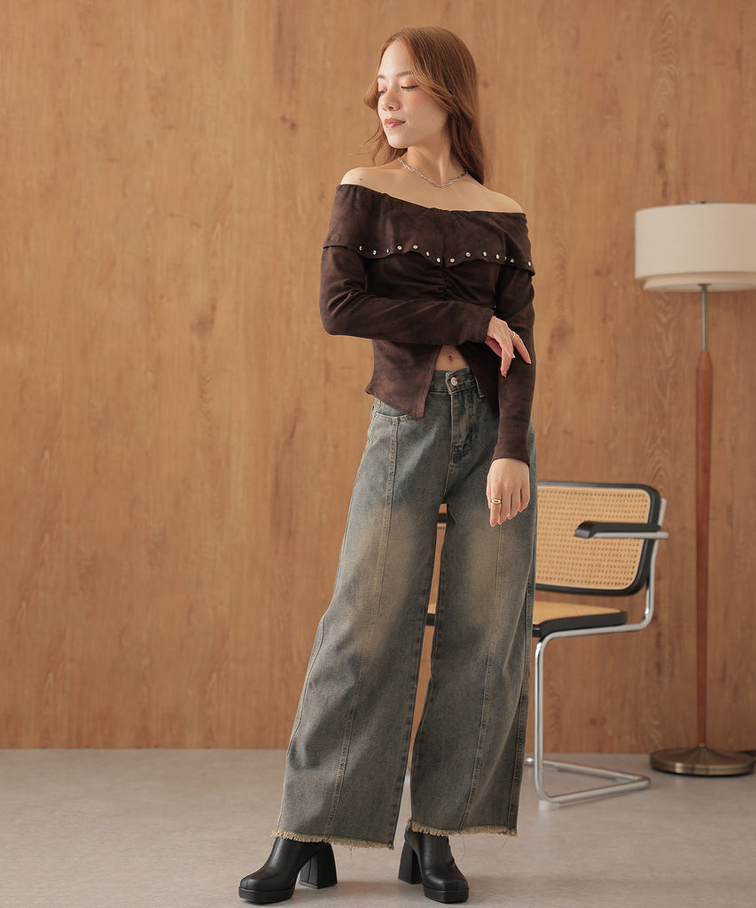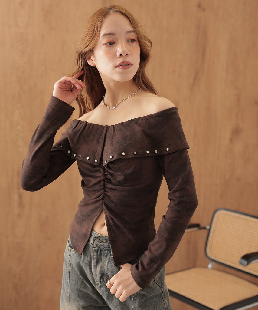 シルバーのカシメがクールに映えるオフショルトップス。