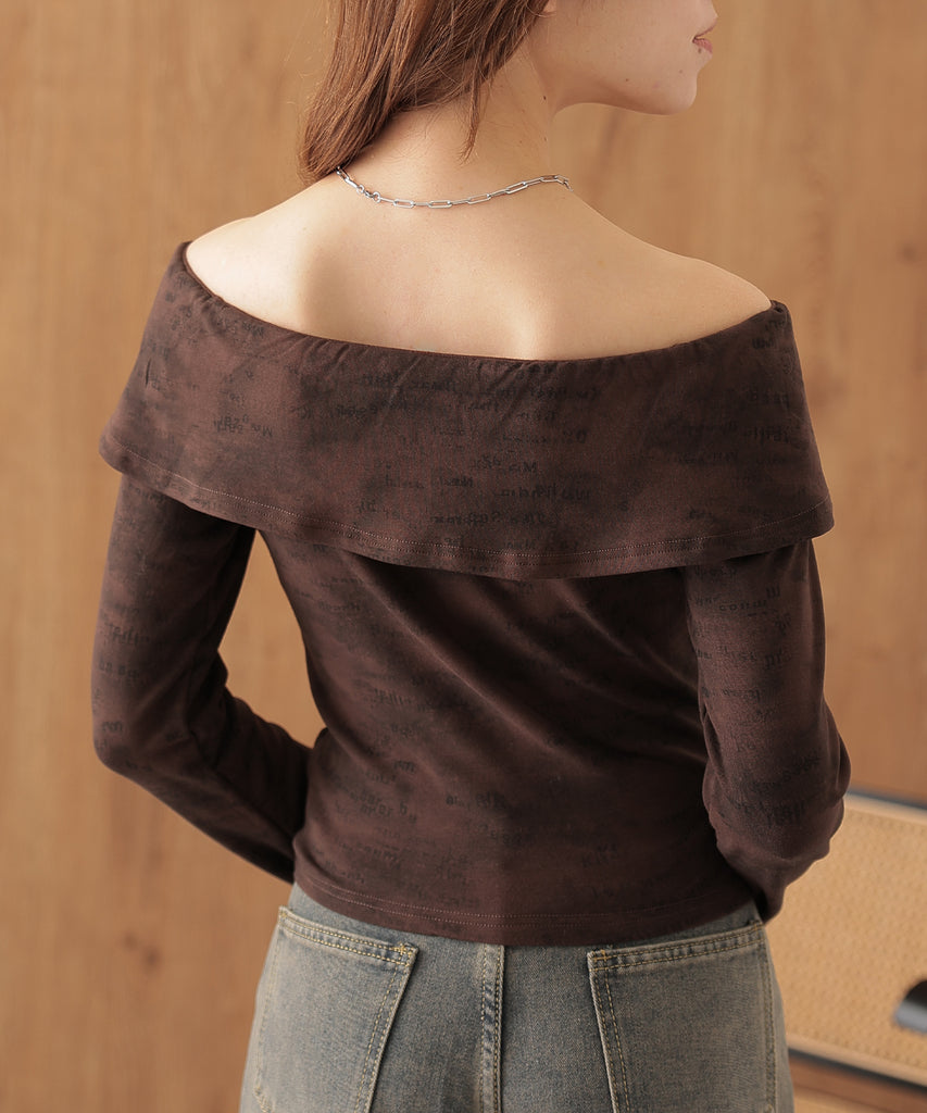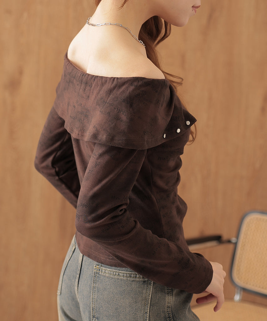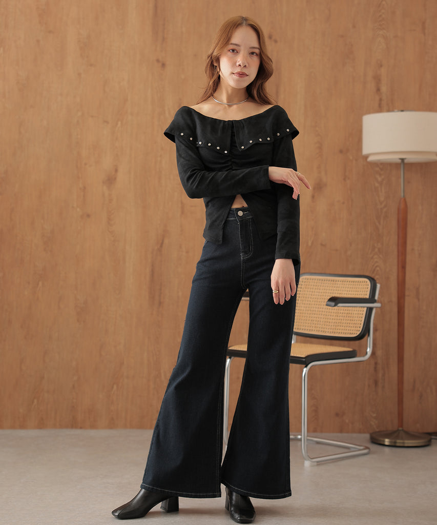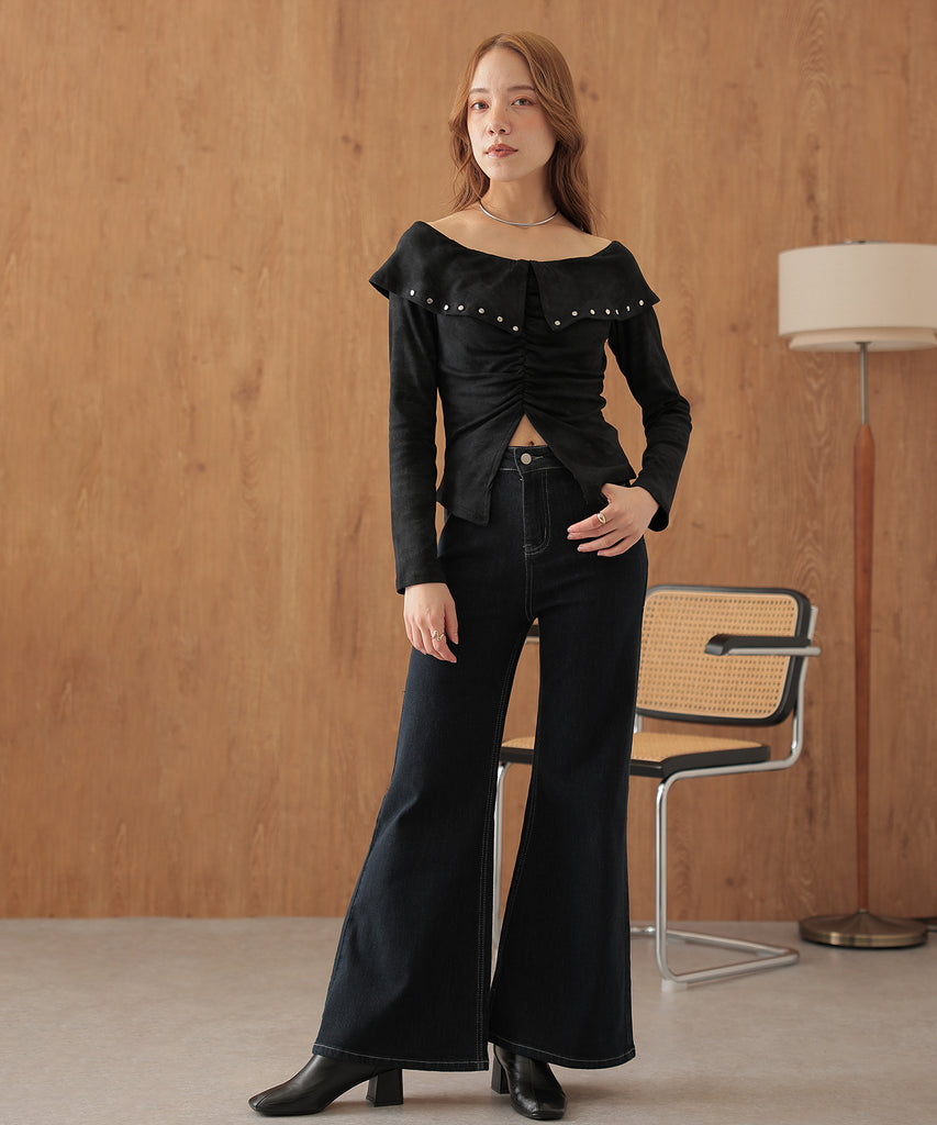 シルバーのカシメがクールに映えるオフショルトップス。