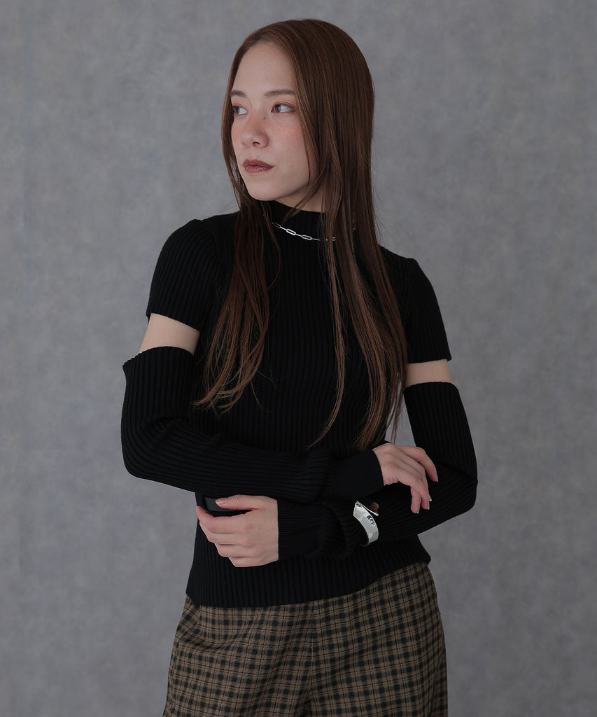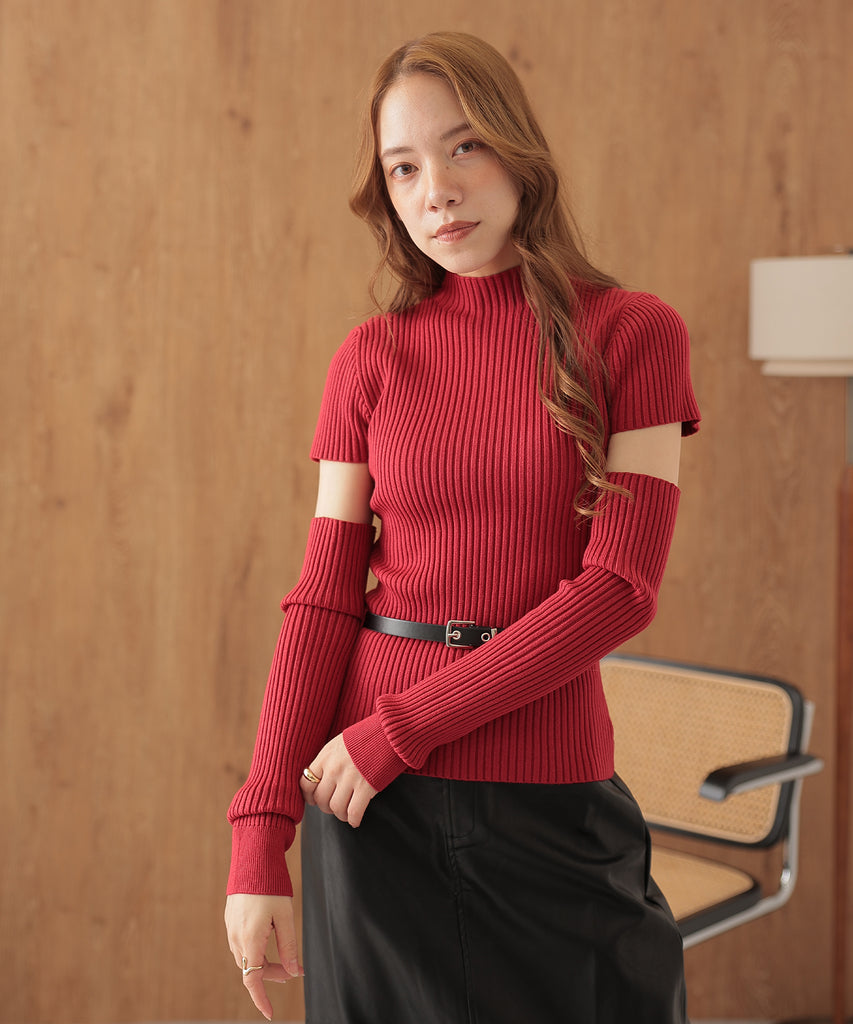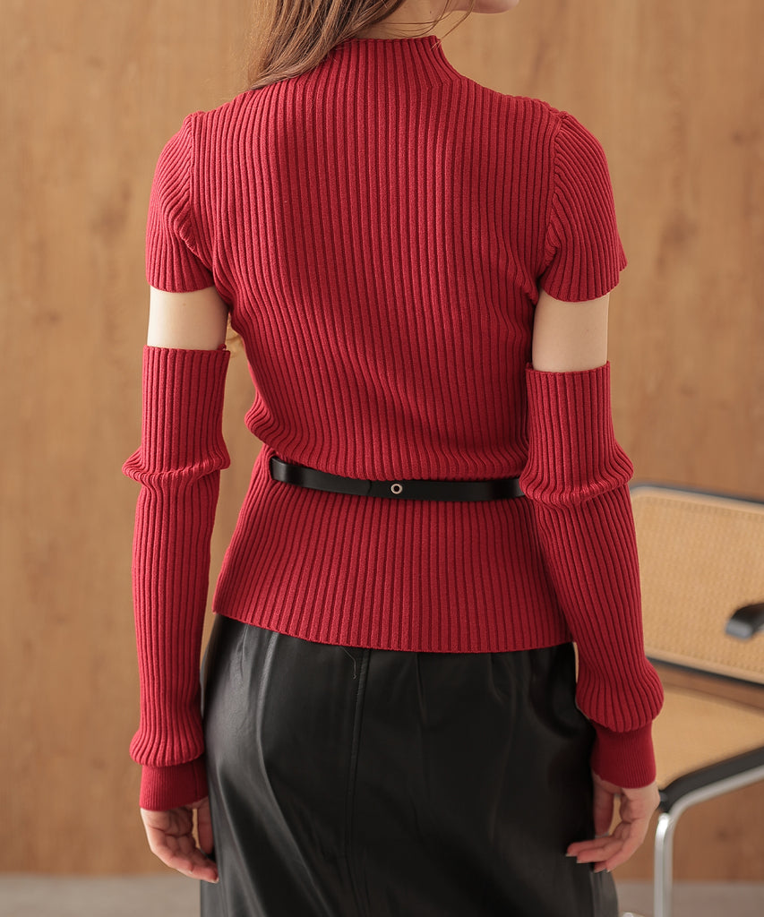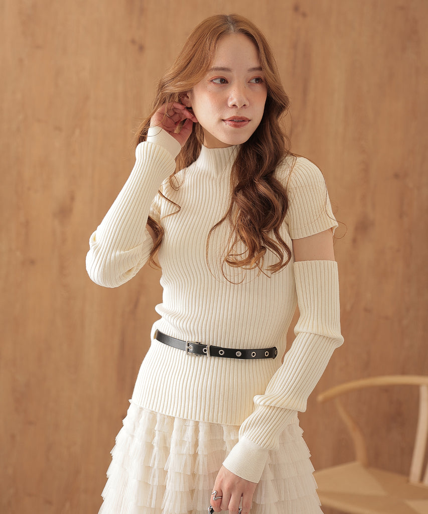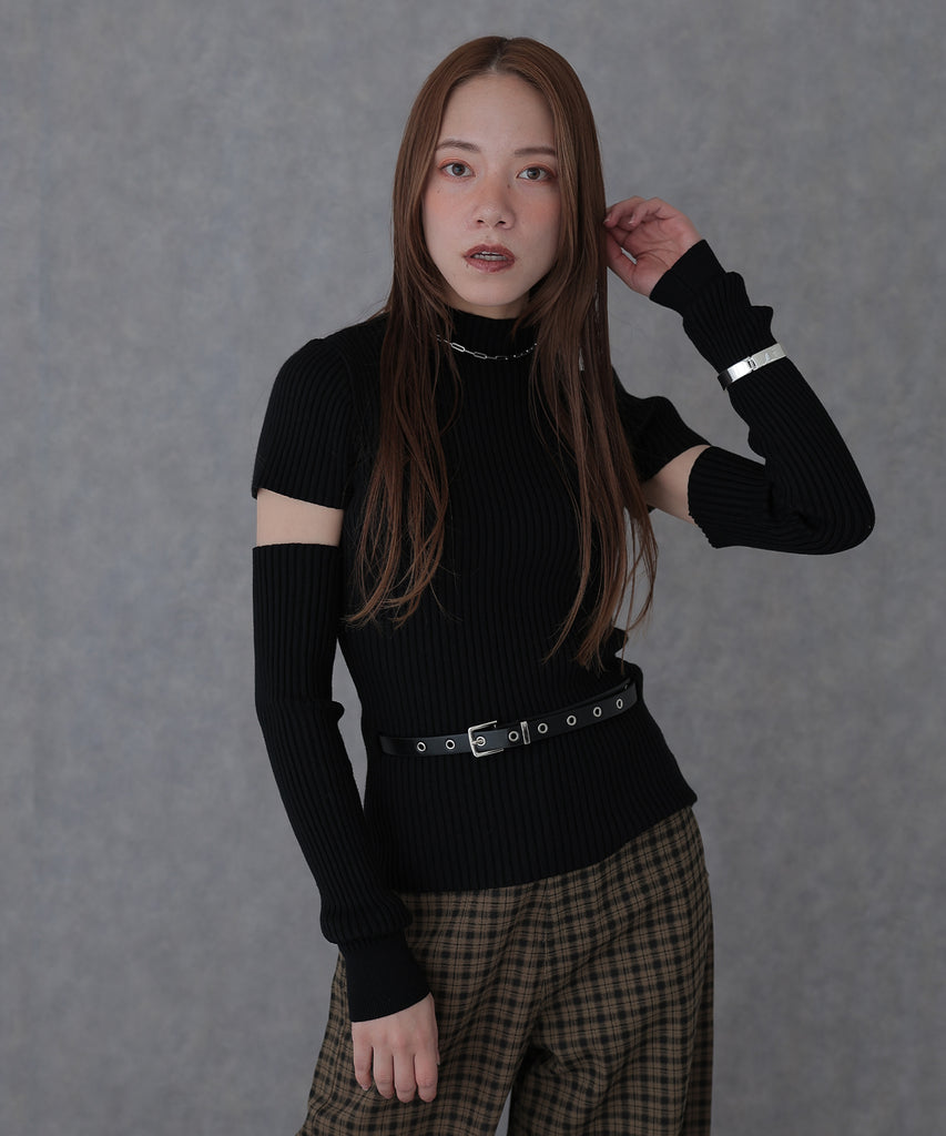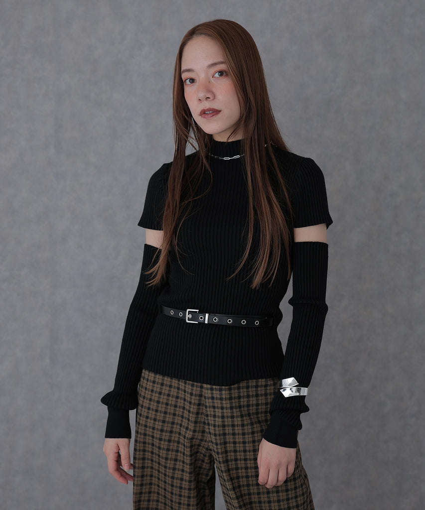 ハイネック仕様の半袖リブニットとロングタイプのアームウォーマー、ベルトの3点セットです。
