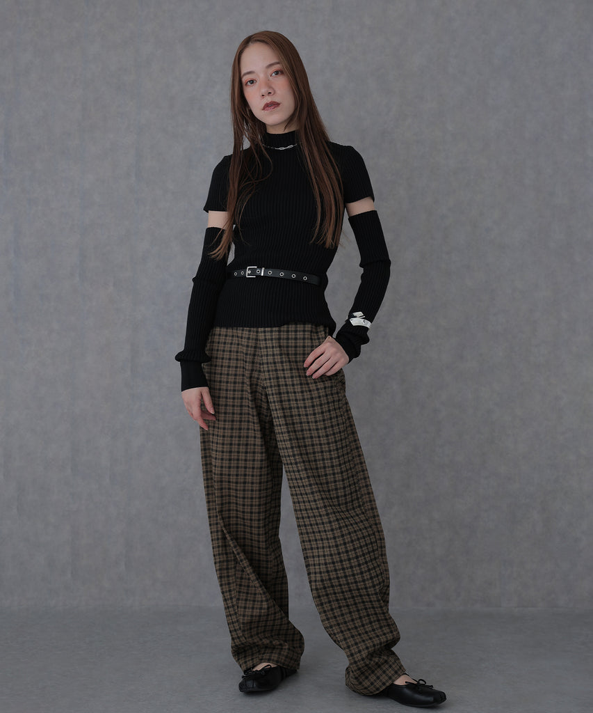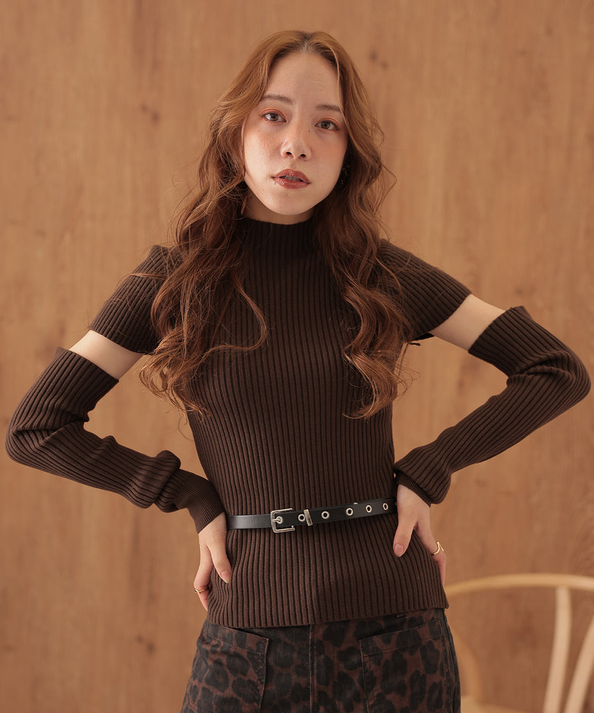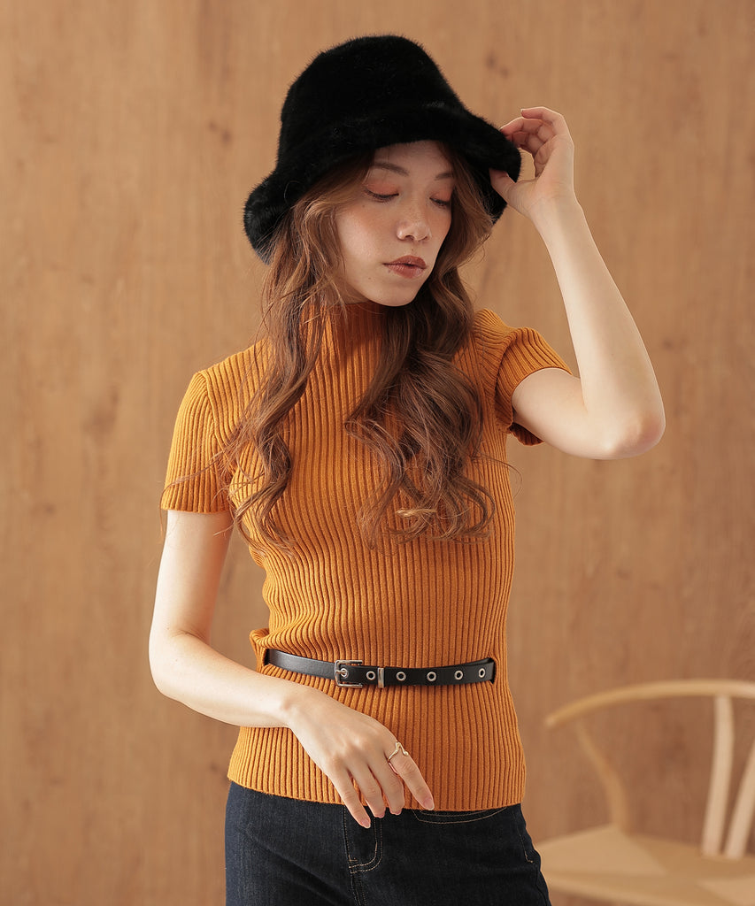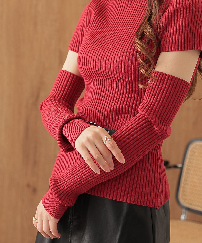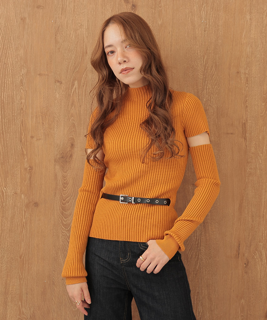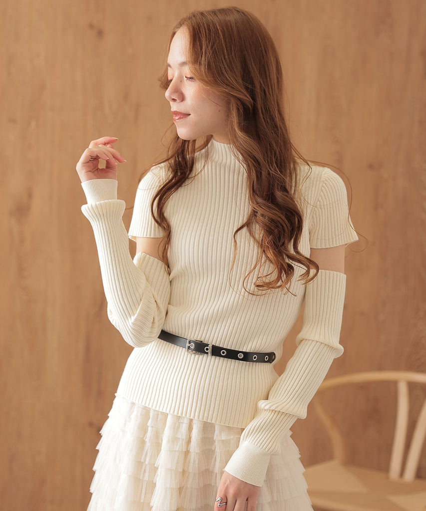 ハイネック仕様の半袖リブニットとロングタイプのアームウォーマー、ベルトの3点セットです。