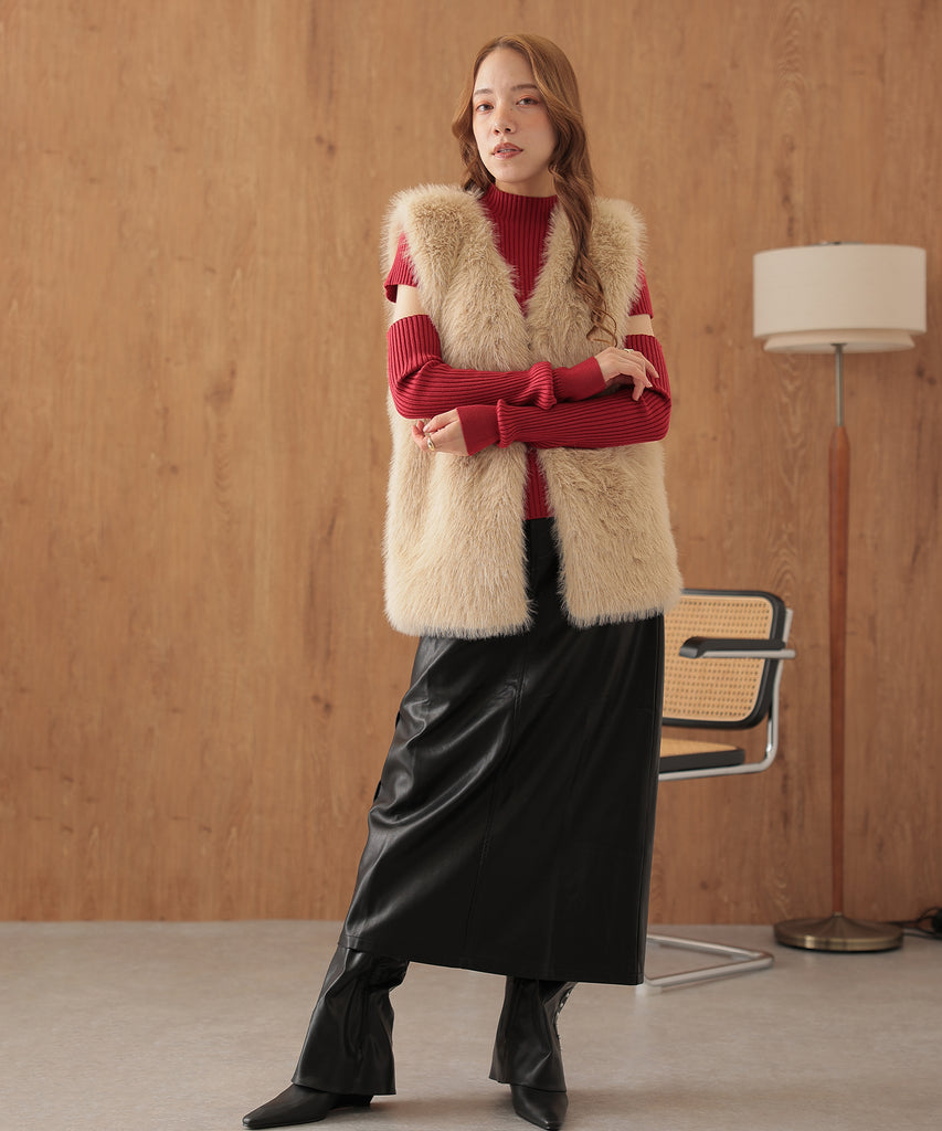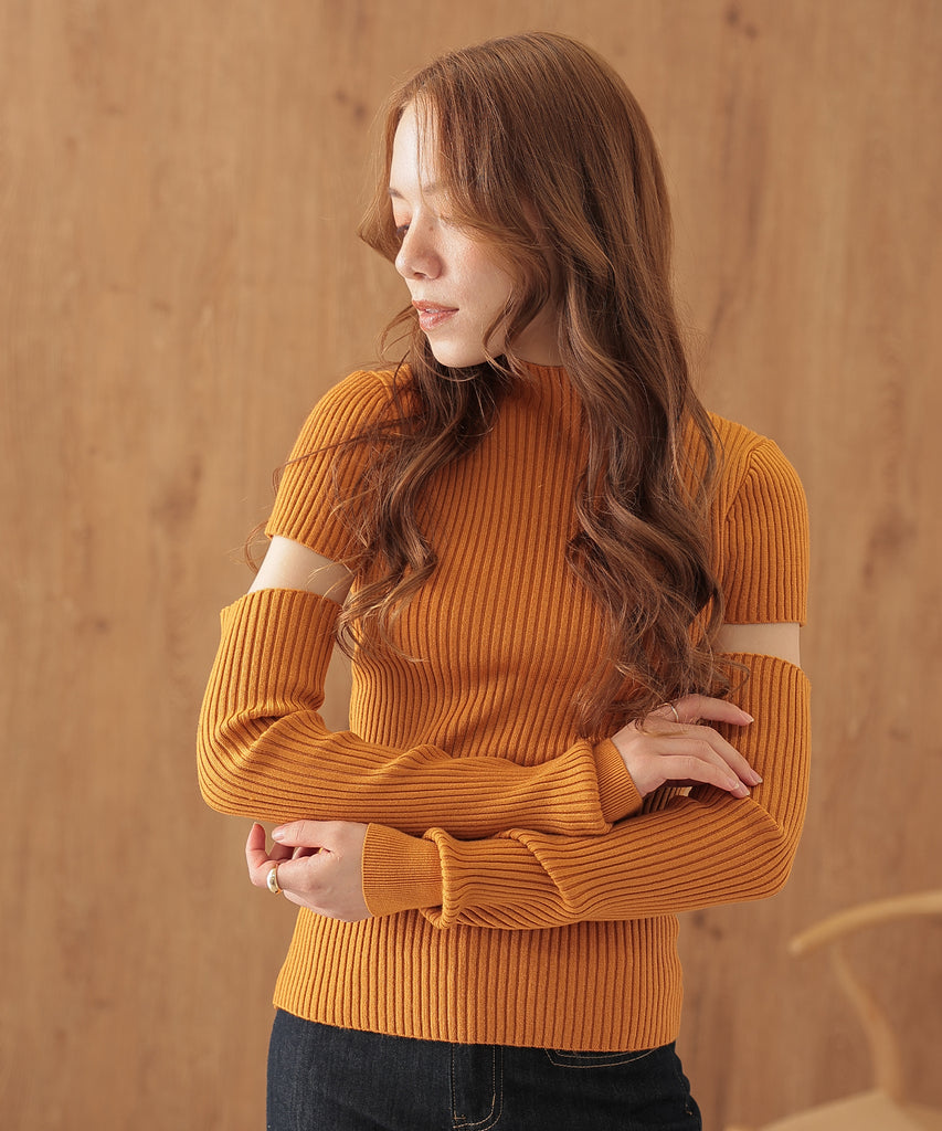 アームウォームは厚地のニットに仕込んで、コーデのワンポイントにするのもおすすめ。