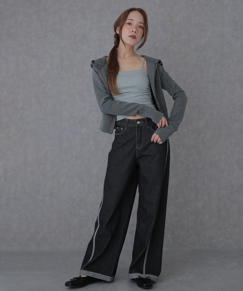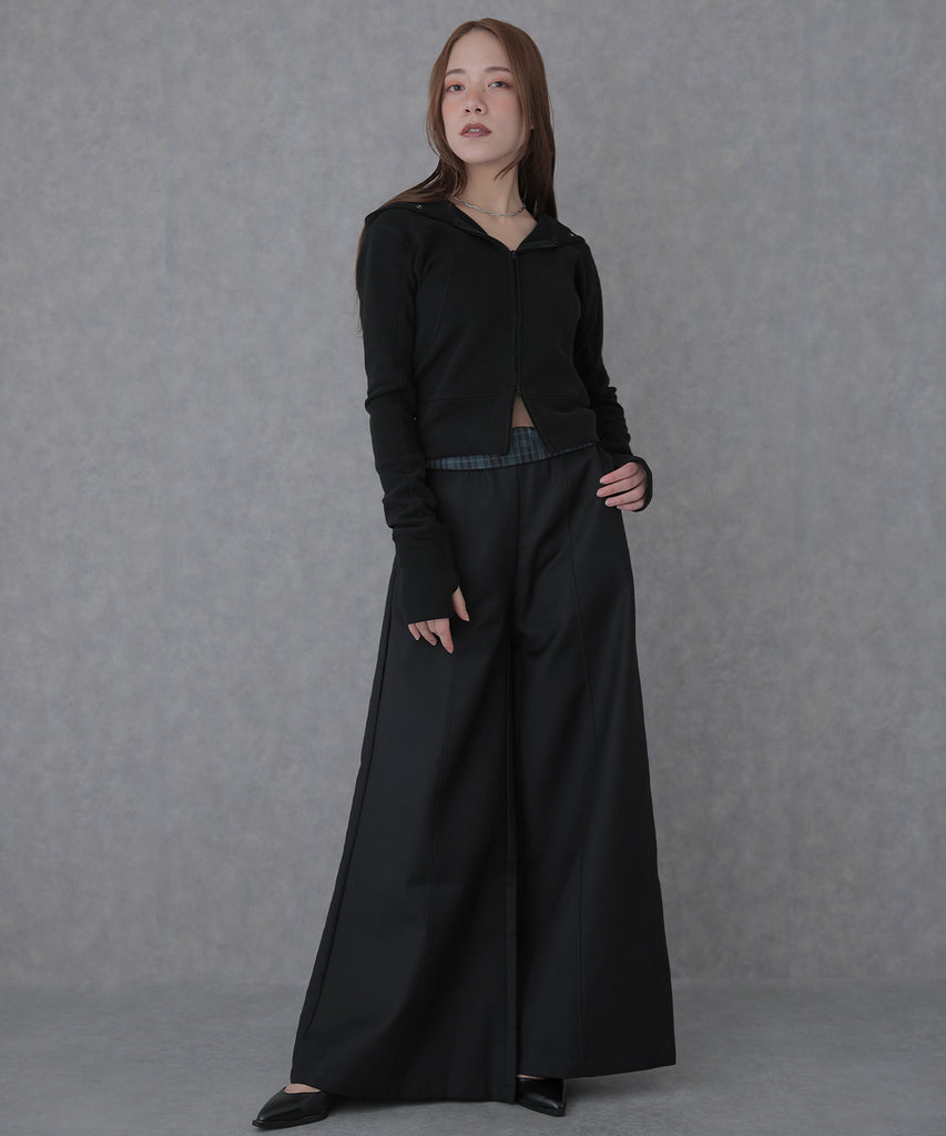 上半身をコンパクトにまとめてくれるので、ボリューミィなボトムスとも相性抜群です。