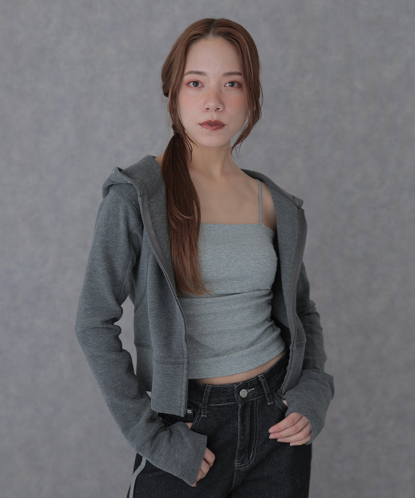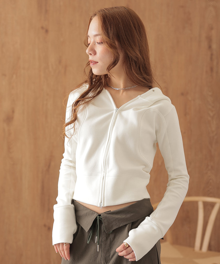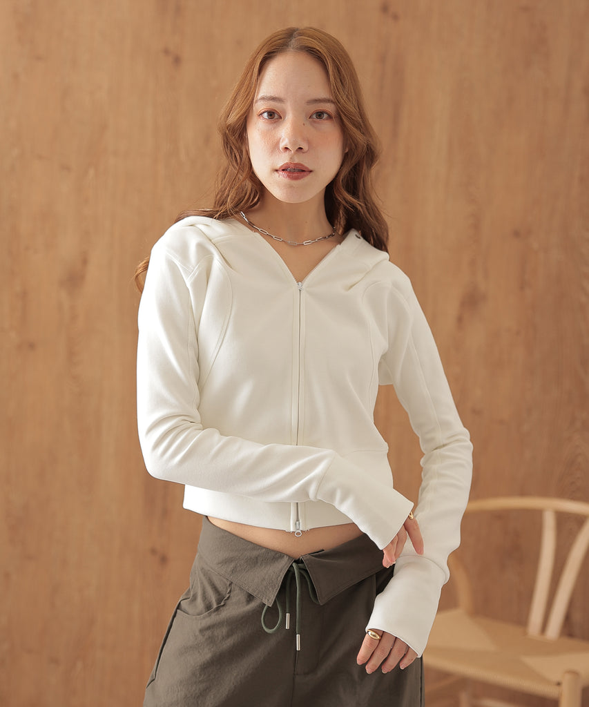 タイトなシルエットが女性らしいフーディー。