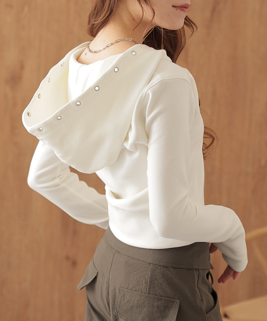 フードの縁にはアイレットを施して、クールなエッセンスを取り入れました。